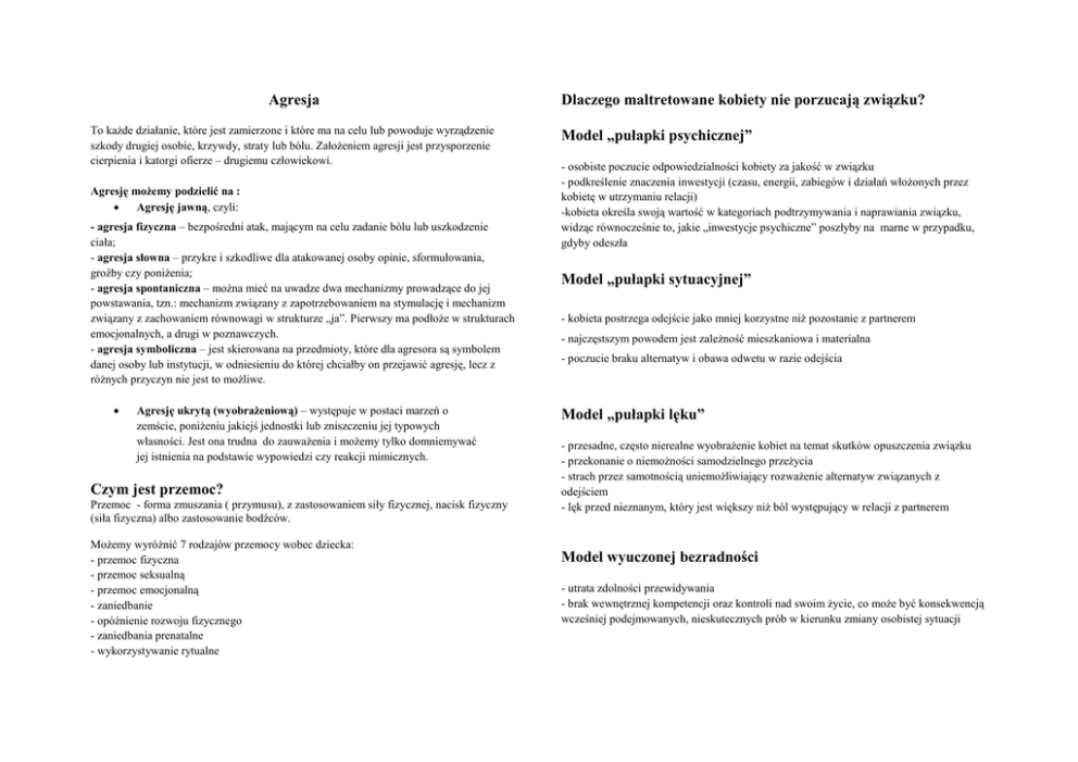 Agresja To każde działanie, które jest zamierzone i które ma na celu lub powoduje wyrządzenie szkody drugiej osobie, krzywdy, straty lub bólu. Założeniem agresji jest przysporzenie cierpienia i katorgi ofierze – drugiemu człowiekowi. Agresję możemy podzielić na : • Agresję jawną, czyli: - agresja fizyczna – bezpośredni atak, mającym na celu zadanie bólu lub uszkodzenie ciała; - agresja słowna – przykre i szkodliwe dla atakowanej osoby opinie, sformułowania, groźby czy poniżenia; - agresja spontaniczna – można mieć na uwadze dwa mechanizmy prowadzące do jej powstawania, tzn.: mechanizm związany z zapotrzebowaniem na stymulację i mechanizm związany z zachowaniem równowagi w strukturze „ja”. Pierwszy ma podłoże w strukturach emocjonalnych, a drugi w poznawczych. - agresja symboliczna – jest skierowana na przedmioty, które dla agresora są symbolem danej osoby lub instytucji, w odniesieniu do której chciałby on przejawić agresję, lecz z różnych przyczyn nie jest to możliwe. • Agresję ukrytą (wyobrażeniową) – występuje w postaci marzeń o zemście, poniżeniu jakiejś jednostki lub zniszczeniu jej typowych własności. Jest ona trudna do zauważenia i możemy tylko domniemywać jej istnienia na podstawie wypowiedzi czy reakcji mimicznych. Czym jest przemoc? Przemoc - forma zmuszania ( przymusu), z zastosowaniem siły fizycznej, nacisk fizyczny (siła fizyczna) albo zastosowanie bodźców. Możemy wyróżnić 7 rodzajów przemocy wobec dziecka: - przemoc fizyczna - przemoc seksualną - przemoc emocjonalną - zaniedbanie - opóźnienie rozwoju fizycznego - zaniedbania prenatalne - wykorzystywanie rytualne Dlaczego maltretowane kobiety nie porzucają związku? Model „pułapki psychicznej” - osobiste poczucie odpowiedzialności kobiety za jakość w związku - podkreślenie znaczenia inwestycji (czasu, energii, zabiegów i działań włożonych przez kobietę w utrzymaniu relacji) -kobieta określa swoją wartość w kategoriach podtrzymywania i naprawiania związku, widząc równocześnie to, jakie „inwestycje psychiczne” poszłyby na marne w przypadku, gdyby odeszła Model „pułapki sytuacyjnej” - kobieta postrzega odejście jako mniej korzystne niż pozostanie z partnerem - najczęstszym powodem jest zależność mieszkaniowa i materialna - poczucie braku alternatyw i obawa odwetu w razie odejścia Model „pułapki lęku” - przesadne, często nierealne wyobrażenie kobiet na temat skutków opuszczenia związku - przekonanie o niemożności samodzielnego przeżycia - strach przez samotnością uniemożliwiający rozważenie alternatyw związanych z odejściem - lęk przed nieznanym, który jest większy niż ból występujący w relacji z partnerem Model wyuczonej bezradności - utrata zdolności przewidywania - brak wewnętrznej kompetencji oraz kontroli nad swoim życie, co może być konsekwencją wcześniej podejmowanych, nieskutecznych prób w kierunku zmiany osobistej sytuacji Gdzie szukać pomocy ? Z pomocą tych instytucji możesz złożyć zawiadomienie o przestępstwie, jakim jest przemoc w rodzinie: • • Sąd rodzinny Policja • Prokuratura Najpopularniejsze: • • • • • • • • Ośrodki Pomocy Społecznej Placówki uniezależnień leczenia od alkoholu Poradnie psychologiczno – pedagogiczne Centra Pomocy w Rodzinie Ośrodki Interwencji Kryzysowej Ogólnopolskie Pogotowie dla Ofiar Przemocy w Rodzinie „Niebieska Linia” Gminne ośrodki pomocy społecznej: Komenda Powiatowa w Policach: ul. Kasprowicza 3 70-010 Plice Tel. 91 42 47 511 Ośrodek Pomocy Społecznej w Policach: ul. Siedlecka 2a 91 42 43 810 Dom dla Samotnych Matek z dziećmi: Monar-Markot ul. Kosynierów Gdańskich 25 91 31 76 591 Powiatowe Centrum Pomocy Rodzinie w Policach ul. Tanowska 8 91 42 40 700 91 42 40 699 Ośrodek Wsparcia – Dom dla Matek z Małoletnimi Dziećmi i Kobiet w Ciąży: ul Karwowo 12 72-005 Przecław 91 31 17 770 Polska karta przeciwdziałania przemocy: 1.Każdy człowiek ma prawo do życia w środowisku rodzinnym wolnym od przemocy, która jest naruszeniem praw i dóbr osobistych. 2.Człowiek doświadczający przemocy nie może być za nią obwiniany. 3.Dzieci i młodzież mają prawo do wzrastania w bezpiecznym środowisku wolnym od przemocy, a obowiązkiem dorosłych jest im to zapewnić. 4.Każdy człowiek doświadczający przemocy ma prawo do pomocy prawnej, socjalnej, psychologicznej i medycznej bez naruszania godności osobistej. 5.Każdy człowiek ma prawo do wiedzy potrzebnej do radzenia sobie z przemocą w rodzinie. 6.Każdy człowiek ma prawo do przeciwdziałania przemocy w rodzinie. 7.Każdy człowiek ma obowiązek udzielania pomocy ofiarom przemocy w rodzinie.