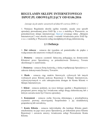 REGULAMIN SKLEPU INTERNETOWEGO ISPOT.PL OBOWIĄZUJĄCY OD 03.06.2016 [stosuje się do umów zawartych od dnia 03 czerwca 2016 r.] 1. Niniejszy Regulamin określa ogólne warunki, zasady oraz sposób sprzedaży prowadzonej przez SAD Sp. z o.o. z siedzibą w Warszawie, za pośrednictwem sklepu internetowego iSpot.pl (zwanego dalej: „Sklepem Internetowym”) oraz określa zasady i warunki świadczenia przez SAD Sp. z o.o. z siedzibą w Warszawie usług nieodpłatnych drogą elektroniczną. § 1 Definicje 1. Dni robocze - oznacza dni tygodnia od poniedziałku do piątku z wyłączeniem dni ustawowo wolnych od pracy. 2. Dostawa - oznacza czynność faktyczną polegającą na dostarczeniu Klientowi przez Sprzedawcę, za pośrednictwem Dostawcy, Towaru określonego w zamówieniu. 3. Dostawca - oznacza firmę kurierską, z którą współpracuje Sprzedawca w zakresie dokonywania Dostawy Towarów. 4. Hasło - oznacza ciąg znaków literowych, cyfrowych lub innych wybranych przez Klienta podczas Rejestracji w Sklepie Internetowym, wykorzystywanych w celu zabezpieczenia dostępu do Konta Klienta w Sklepie Internetowym. 5. Klient - oznacza podmiot, na rzecz którego zgodnie z Regulaminem i przepisami prawa mogą być świadczone usługi drogą elektroniczną lub z którym zawarta może być Umowa sprzedaży. 6. Konsument - oznacza osobę fizyczną dokonującą z przedsiębiorcą czynności prawnej niezwiązanej bezpośrednio z jej działalnością gospodarczą lub zawodową. 7. Konto Klienta - oznacza indywidualny dla każdego Klienta panel, uruchomiony na jego rzecz przez Sprzedawcę, po dokonaniu przez Klienta Rejestracji i zawarciu umowy świadczenia usługi Prowadzenie Konta Klienta. 8. Przedsiębiorca - oznacza osobę fizyczną, osobę prawną lub jednostkę organizacyjną niebędącą osobą prawną, której ustawa przyznaje zdolność prawną, prowadzącą we własnym imieniu działalność gospodarczą lub zawodową i dokonującą czynności prawnej związanej bezpośrednio z jej działalnością gospodarczą lub zawodową. 9. Regulamin - oznacza niniejszy regulamin. 10. Rejestracja - oznacza czynność faktyczną dokonaną w sposób określony w Regulaminie, wymaganą dla korzystania przez Klienta ze wszystkich funkcjonalności Sklepu Internetowego. 11. Sprzedawca - oznacza SAD Sp. z o.o. z siedzibą w Warszawie (02566), ul. Puławska 2, NIP: 5540232136, REGON: 010369909, wpisaną do rejestru przedsiębiorców prowadzonego przez Sąd Rejonowy dla m.st. Warszawy w Warszawie, XIII Wydział Gospodarczy Krajowego Rejestru Sądowego pod numerem KRS 0000011564, o kapitale zakładowym w wysokości 2.630.000 złotych; e-mail: [email protected], będącą jednocześnie właścicielem Sklepu Internetowego. 12. Strona Internetowa Sklepu - oznacza strony internetowe, pod którymi Sprzedawca prowadzi Sklep Internetowy, działające w domenie iSpot.pl. 13. Towar - oznacza produkt przedstawiony przez Sprzedawcę za pośrednictwem Strony Internetowej Sklepu, mogący być przedmiotem Umowy sprzedaży. 14. Treść cyfrowa - oznacza dane wytwarzane i dostarczane w postaci cyfrowej. 15. Trwały nośnik - oznacza materiał lub narzędzie umożliwiające Klientowi lub Sprzedawcy przechowywanie informacji kierowanych osobiście do niego, w sposób umożliwiający dostęp do informacji w przyszłości przez czas odpowiedni do celów, jakim te informacje służą, i które pozwalają na odtworzenie przechowywanych informacji w niezmienionej postaci. 16. Umowa sprzedaży - oznacza umowę sprzedaży zawartą na odległość, na zasadach określonych w Regulaminie, między Klientem a Sprzedawcą. § 2 Postanowienia ogólne i korzystanie ze Sklepu Internetowego 1. Wszelkie prawa do Sklepu Internetowego, w tym majątkowe prawa autorskie, prawa własności intelektualnej do jego nazwy, jego domeny internetowej, Strony Internetowej Sklepu, a także do wzorców, formularzy, logotypów zamieszczanych na Stronie Internetowej Sklepu (za wyjątkiem logotypów i zdjęć prezentowanych na Stronie Internetowej Sklepu w celach prezentacji towarów, do których to prawa autorskie należą do podmiotów trzecich) należą do Sprzedawcy, a korzystanie z nich może następować wyłącznie w sposób określony i zgodny z Regulaminem oraz za zgodą Sprzedawcy wyrażoną na piśmie. 2. Sprzedawca dołoży starań, aby korzystanie ze Sklepu Internetowego było możliwe dla użytkowników Internetu z użyciem wszystkich popularnych przeglądarek internetowych, systemów operacyjnych, typów urządzeń oraz typów połączeń internetowych. Minimalne wymagania techniczne umożliwiające korzystanie ze Strony Internetowej Sklepu to przeglądarka internetowa w wersji co najmniej Internet Explorer 11 lub Chrome 39 lub Firefox 34 lub Opera 26 lub Safari 5 lub nowszych, z włączoną obsługą języka Javascript, akceptująca pliki typu „cookies” oraz łącze internetowe o przepustowości co najmniej 256 kbit/s. Strona Internetowa Sklepu jest responsywna i dynamicznie dopasowuje się do każdej rozdzielczości ekranu. 3. Sprzedawca stosuje mechanizm plików "cookies", które podczas korzystania przez Klientów ze Strony Internetowej Sklepu, zapisywane są przez serwer Sprzedawcy na dysku twardym urządzenia końcowego Klienta. Stosowanie plików "cookies" ma na celu poprawne działanie Strony Internetowej Sklepu na urządzeniach końcowych Klientów. Mechanizm ten nie niszczy urządzenia końcowego Klienta oraz nie powoduje zmian konfiguracyjnych w urządzeniach końcowych Klientów ani w oprogramowaniu zainstalowanym na tych urządzeniach. Każdy Klient może wyłączyć mechanizm „cookies” w przeglądarce internetowej swojego urządzenia końcowego. Sprzedawca wskazuje, że wyłączenie „cookies” może jednak spowodować utrudnienia lub uniemożliwić korzystanie ze Strony Internetowej Sklepu. 4. W celu złożenia zamówienia w Sklepie Internetowym za pośrednictwem Strony Internetowej Sklepu oraz w celu korzystania z usług św