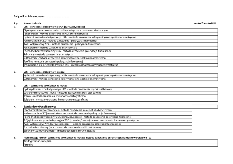 Załącznik nr1 do umowy nr …............................. L.p. 1. Nazwa badania Leki - oznaczenie ilościowe we krwi (surowica/osocze) Digoksyna - metoda oznaczenia turbidymetryczna z pomiarem kinetycznym Fenobarbital - metoda oznaczenia immunoturbimetryczna Hydrazyd kwasu izonikotynowego HKIN - metoda oznaczenia kalorymetryczno-spektrofonometryczna Karbamazepina CBZ - metoda oznaczenia - polaryzacja fluoresencji Kwas walproinowy VPA - metoda oznaczenia - polaryzacja fluoresencji Paracetamol - metoda oznaczenia enzymatyczna Pochodne benzodwuazepiny BDA - metoda oznaczenia polaryzacja fluoresencji Salicylany - metoda oznaczenia enzymatyczn Sulfonamidy -metoda oznaczenia kalorymetryczno-spektrofonometryczna Teofilina - metoda oznaczenia polaryzacja fluoresencji Trójcykliczne leki przeciwdepresyjne TAD - metoda oznaczenia immunoenzymatyczna 2. Leki - oznaczenie ilościowe w moczu: Hydrazyd kwasu izonikotynowego HKIN - metoda oznaczenia kalorymetryczno-spektrofonometryczna Sulfonamidy -metoda oznaczenia kalorymetryczno-spektrofonometryczna 3. Leki - oznaczenie jakościowe w moczu hydrazyd kwasu izonikotynowego HKN - metoda oznaczenia szybki test barwny pochodne fenotiazyny (mocz) - metoda zoanczenia szybki test barwny Tramal - metoda oznaczenia immunochromatograficzna Zolpidem - metoda oznaczenia immunochromatograficzna 4. Standardowy Panel Lekowy: Fenobarbital (surowica/osocze) - metoda oznaczenia immunoturbidymetryczna Karbamazapina CBZ (surowica/osocze) - metoda oznaczenia polaryzacja fluoresencji Pochodne benzodwuazepiny BDA (surowica/osocze) - metoda oznaczenia polaryzacja fluoresencj Trójcykliczne leki przeciwdepresyjne TAD (surowica/osocze) - metoda oznaczenia immunoenzymatyczna Kwas walproinowy VPA (surowica/osocze) - metoda oznaczenia polaryacja fluoroesencji Pochodne fenotiazyny (mocz) - metoda zoanczenia szybki test barwny Salicylany (surowica/osocze)- metoda oznaczenia enzymatyczna 5. Identyfikacja leków - oznaczenie jakościowe w moczu: metoda oznaczenia chromatografia cienkowarstwowa TLC Amitryptylina/Doksepina Atropina wartość brutto PLN Baklofen Bisopropol Chlorprotiksen Dekstrometorfan Gabitril Hydroksyzyna Karbamazepina Klopiksol Kodeina Metoprolol Mianseryna Olanzapina Pochodne fenotiazyny Pochodne sulfonylomocznika (Chlorpropamid/Tolbutamid) Propanolol Riofampicyna Skopolamina Strychnina Tramal Zolpidem Zopiklon 6. Szeroka Chromatografia na Leki TLC - oznaczenei jakościowe w moczu: metoda oznaczenia chromatografia cienkowarstwowa TLC Atropina, Skopolamina, Bisoprolol, Chlorprotiksen, Hydroksyzyna, Klopiksol, Kolzapol, Metoprolol, Olnzapina, Pochodne fenotiazyny, pochodne fenotiazyny, propranolol, tramal, zopiklon, zolpidem 7. Identyfikacja leków - oznaczenie jakościowe w moczu: metoda oznaczenia chromatografia gazowa sprzężona ze spektrometrią mas (GC-MS) Alprazolam Amitryptylina Baklofen Bisoprolol Chlorpropamid Chlorprotiksen Dekstrometorfan Diltiazem Diazepam Doksepina Escitalopram / Citalopram Fenobarbital Fenylobutazon Fluoksetyna Flupentiksol Glipizyd Haloperidol Hydroksyzyna Ibuprofen Kaptopril Karbamazepina Klonidyna Klozapina Kodeina Kwetiapina Lamotrygina Lewopromazyna Metoprolol Mianseryna Olanzapina Opipramol Paracetamol Paroksetyna Perazyna Promazyna Propanolol Sertalina Sotalol Sulipiryd Tietyleperazyna Tiopental Tolbutamid Topiramat Tramadol Trazodon Wenlafaksyna Verapamil Zolpidem Zopiklon Zuklopentiksol 8 Narkotyki - oznaczenie jakościowe we krwi (krew pełna/surowica/osocze) - metoda oznaczenia immunochromatograficzna Amfetamina AMP Kannabinole THC Kokaina COC Metamfetamina MetAMP Opiaty OPI 9. Narkotyki - oznaczenie jakościowe w moczu: Amfetamina AMP Fencyklidyna PCP Kannabinole THC Kokaina COC Ektazy MDMA Metadon MTD Metamfetamina MetAMP Opiaty OPI 10. Standardowy Panel Narkotykowy - oznaczenie jakościowe w moczu: metoda ozanczenia -immunoturbidymetryczna z pomiarem kinetycznym Amfetamina AMP, Kannabinole THC, Kokaina COC, Ekstazy MDMA, Metamfetamina MetAMP, Opiaty OPI 11. Narkotyki - oznaczenie ilościowe w moczu: metoda oznaczenia - immunoturbidymetryczna z pomiarem kinetycznym Amfetamina AMP/Metamfetamina MetAMP Kannabinole THC Opiaty OPI 12. Alkohole - oznaczenie ilościowe Alkohol etylowy (surowica/osocze) - metoda oznaczenia enzymatyczna Alkohol etylowy (krew pełna) - metoda oznaczenia chromatografia gazowa GC Alkohol etylowy mocz) - metoda oznaczenia chromatografia gazowa GC Alkohol metylowy (krew pełna) - metoda oznaczenia chromatografia gazowa GC Alkohol metlowy (mocz) - metoda oznaczenia chromatografia gazowa GC Alkohol izopropylowy (krew pełna) - metoda oznaczenia chromatografia gazowa GC Alkohol izopropylowy (mocz) - metoda oznaczenia chromatografia gazowa GC Glikol etylenowy (surowica/osocze) - metoda oanzaczenia chromatografia gazowa GC Glikol etylenowy (mocz) - metoda oanzaczenia chromatografia gazowa GC 13. Panel Alkoholowy - oznaczenie ilościowe: metoda oznaczenia chromatografia gazowa GC alkohol etylowy (krew pełna) alkohol metylowy (krew pełna) alkohol izopropylowy (krew pełna) glikol etylenowy (surowica/osocze) glikol etylenowy (mocz) Aceton (krew pełna) 14. Pochodne hemoglobiny we krwi pełnej: metoda oznaczenia - oksymetryczna Karboksyhemoglobina HbCO Methemoglobina MetHb 15. Metabolity rozpuszczalników - oznaczenie ilościowe w moczu: metoda oznaczenia kalorymetryczno-spektrofonometryczna Fenol Kwas hipurowy Kwas trójchlorooctowy TCA Para - aminofenol 16. Inne badania toksykologiczne - oznaczenei ilościowe Aceton (krew pełna) - metoda oznaczenia chromatografia gazowa GC Aceton (mocz) - metoda oznaczenia chromtografia gazowa GC Acetylocholinesteraza ACHE (krew pełna) - metoda oznaczenia kolorymetryczno-spektrofonometryczna Cholinesteraza CHE (surowica/osocze) - metoda oznaczenia enzymatyczna z maslanotiocholiną Cyjanki (krew pełna) metoda oznaczenia kolorymetryczno-spektrofonometryczna Kwas 5-aminolewulinowy ALA (dobowa zbiórka moczu) - metoda oznaczenia chromatograficzno-spektrofonometryczna Kwas 