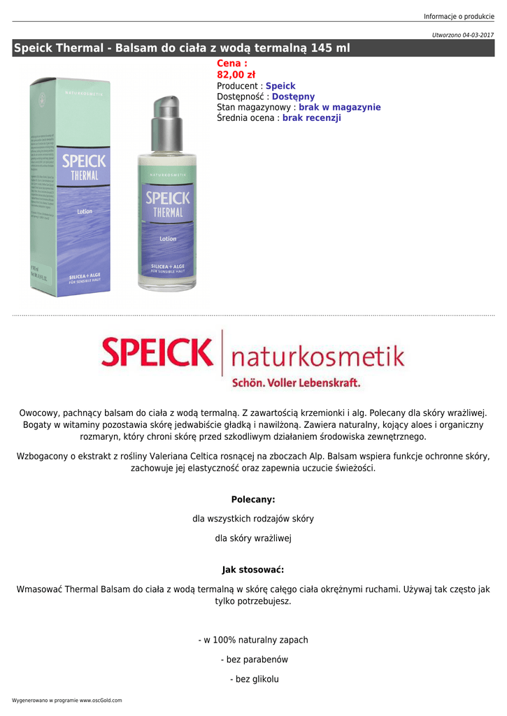 Informacje o produkcie Utworzono 04-03-2017 Speick Thermal - Balsam do ciała z wodą termalną 145 ml Cena : 82,00 zł Producent : Speick Dostępność : Dostępny Stan magazynowy : brak w magazynie Średnia ocena : brak recenzji Owocowy, pachnący balsam do ciała z wodą termalną. Z zawartością krzemionki i alg. Polecany dla skóry wrażliwej. Bogaty w witaminy pozostawia skórę jedwabiście gładką i nawilżoną. Zawiera naturalny, kojący aloes i organiczny rozmaryn, który chroni skórę przed szkodliwym działaniem środowiska zewnętrznego. Wzbogacony o ekstrakt z rośliny Valeriana Celtica rosnącej na zboczach Alp. Balsam wspiera funkcje ochronne skóry, zachowuje jej elastyczność oraz zapewnia uczucie świeżości. Polecany: dla wszystkich rodzajów skóry dla skóry wrażliwej Jak stosować: Wmasować Thermal Balsam do ciała z wodą termalną w skórę całęgo ciała okrężnymi ruchami. Używaj tak często jak tylko potrzebujesz. - w 100% naturalny zapach - bez parabenów - bez glikolu Wygenerowano w programie www.oscGold.com - bez sztucznych barwników - bez silikonu - bez Phenoxyethanolu - bez PEG i SLS - bez składników GMO - fizjologiczne pH - hypoalergiczny Składniki: Aqua, Alcohol, Glycine Soja Oil, Glycerin, Aloe Barbadensis Leaf Juice, Glyceryl Cocoate, Xanthan Gum, Glyceryl Cocoate/Citrate/Lactate, Butyrospermum Parkii Butter, Persea Gratissima Oil, Unsaponifiables, Valeriana Celtica Extract, Spirulina Platensis Extract, Rosmarinus Officinalis Extract, Silica, Bisabolol, Tocopherol, Galactoarabinan, Maltodextrin, Parfum, Geraniol, Limonene, Linalool. Certyfikaty: