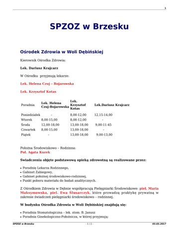 1 SPZOZ w Brzesku Ośrodek Zdrowia w Woli Dębińskiej Kierownik Ośrodka Zdrowia: Lek. Dariusz Krajcarz W Ośrodku przyjmują lekarze: Lek. Helena Czuj – Bojarowska Lek. Krzysztof Kotas Poradnia Lek. Lek. Helena Krzysztof Czuj-Bojarowska Kotas Poniedziałek – Lek.Dariusz Krajcarz 8,00-12,00 12,15-14,00 Wtorek 8,00-15,00 8,00-12,00 – Środa 12,00-18,00 13,00-18,00 9,00-11-45 Czwartek 8,00-15,00 13,00-18,00 – – 13,00-18,00 9,00-13,00 Piątek Położna Środowiskowo – Rodzinna: Poł. Agata Kurek Świadczenia objęte podstawową opieką zdrowotną są realizowane przez: ● ● ● ● Poradnię Lekarza Rodzinnego, Gabinet Zabiegowy, Gabinet położnej środowiskowo-rodzinnej, Punkt poboru materiału do badań analitycznych. Z Ośrodkiem Zdrowia w Dębnie współpracują Pielęgniarki Środowiskowe: piel. Maria Maksymowska, piel. Ewa Ślusarczyk, które prowadzą praktykę prywatną w zakresie świadczeń pielęgniarki środowiskowo – rodzinnej. W budynku Ośrodka Zdrowia w Woli Dębińskiej znajdują się: ● ● Poradnia Stomatologiczna – lek. stom. B. Janusz Poradnia Ginekologiczno-Położnicza, w której przyjmują: SPZOZ w Brzesku -1/2- 03.03.2017 2 ● – lek. Wieńczysław Kamiński – piątek w godz. 10,00-14,00 – lek. Helena Mruczek – poniedziałek w godz. 14,00 do 18,00 – lek. Włodzimierz Wisłocki – wtorek w godz. 8,00-15,00 . Gabinet Fizjoterapii, który prowadzi fizjoterapeuta Magdalena Marcinów. Adres: Wola Dębińska 172 32-852 Dębno Ważne telefony: ● Rejestracja – 14 66 58 564 SPZOZ w Brzesku -2/2- 03.03.2017
