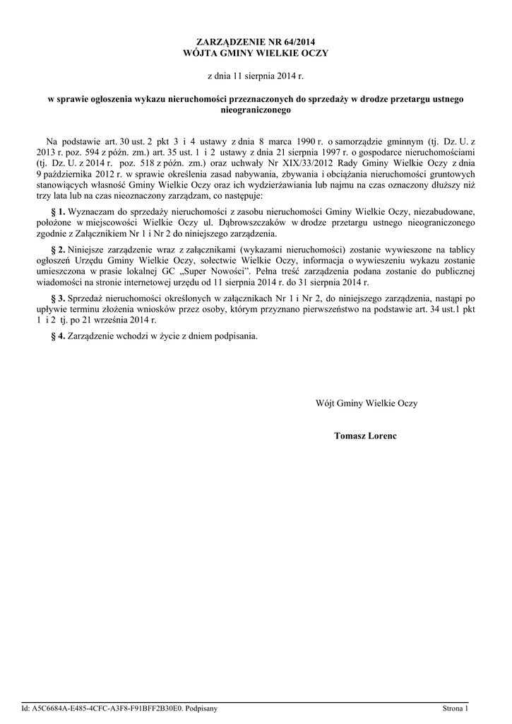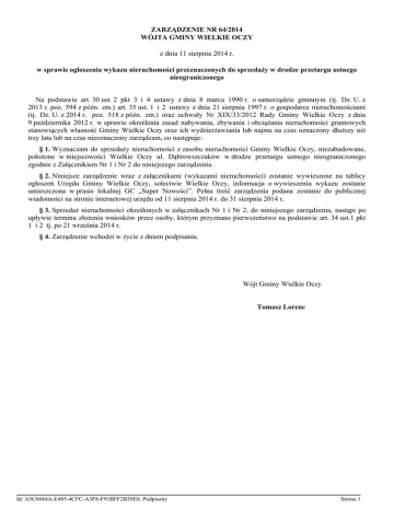 ZARZĄDZENIE NR 64/2014 WÓJTA GMINY WIELKIE OCZY z dnia 11 sierpnia 2014 r. w sprawie ogłoszenia wykazu nieruchomości przeznaczonych do sprzedaży w drodze przetargu ustnego nieograniczonego Na podstawie art. 30 ust. 2 pkt 3 i 4 ustawy z dnia 8 marca 1990 r. o samorządzie gminnym (tj. Dz. U. z 2013 r. poz. 594 z późn. zm.) art. 35 ust. 1 i 2 ustawy z dnia 21 sierpnia 1997 r. o gospodarce nieruchomościami (tj. Dz. U. z 2014 r. poz. 518 z późn. zm.) oraz uchwały Nr XIX/33/2012 Rady Gminy Wielkie Oczy z dnia 9 października 2012 r. w sprawie określenia zasad nabywania, zbywania i obciążania nieruchomości gruntowych stanowiących własność Gminy Wielkie Oczy oraz ich wydzierżawiania lub najmu na czas oznaczony dłuższy niż trzy lata lub na czas nieoznaczony zarządzam, co następuje: § 1. Wyznaczam do sprzedaży nieruchomości z zasobu nieruchomości Gminy Wielkie Oczy, niezabudowane, położone w miejscowości Wielkie Oczy ul. Dąbrowszczaków w drodze przetargu ustnego nieograniczonego zgodnie z Załącznikiem Nr 1 i Nr 2 do niniejszego zarządzenia. § 2. Niniejsze zarządzenie wraz z załącznikami (wykazami nieruchomości) zostanie wywieszone na tablicy ogłoszeń Urzędu Gminy Wielkie Oczy, sołectwie Wielkie Oczy, informacja o wywieszeniu wykazu zostanie umieszczona w prasie lokalnej GC „Super Nowości”. Pełna treść zarządzenia podana zostanie do publicznej wiadomości na stronie internetowej urzędu od 11 sierpnia 2014 r. do 31 sierpnia 2014 r. § 3. Sprzedaż nieruchomości określonych w załącznikach Nr 1 i Nr 2, do niniejszego zarządzenia, nastąpi po upływie terminu złożenia wniosków przez osoby, którym przyznano pierwszeństwo na podstawie art. 34 ust.1 pkt 1 i 2 tj. po 21 września 2014 r. § 4. Zarządzenie wchodzi w życie z dniem podpisania. Wójt Gminy Wielkie Oczy Tomasz Lorenc Id: A5C6684A-E485-4CFC-A3F8-F91BFF2B30E0. Podpisany Strona 1 Załącznik Nr 1 do Zarządzenia Nr 64/2014 Wójta Gminy Wielkie Oczy z dnia 11 sierpnia 2014 r. Wykaz nieruchomości przeznaczonej do sprzedaży w drodze przetargu ustnego nieograniczonego Numer ewidencyjny nieruchomości Powierzchnia w ha Numer księgi wieczystej (KW) Położenie Opis nieruchomości Przeznaczenie Rodzaj zbycia Termin zabudowy Wartość gruntu (zł) Termin do złożenia wniosku przez osoby, którym przysługuje pierwszeństwo na podstawie art. 34 ust. 1, pkt 1,2 ustawy o gospodarce nieruchomościami 943 0, 06 ha PR1L/000282 97/6 Wielkie Oczy ul. Dąbrowszczaków Działka niezabudowana, posiada dostęp do drogi publicznej Tereny zabudowy mieszkaniowej sprzedaż, x 6312,50 zł (do ceny nieruchomości zostanie doliczony podatek Vat w obowiazującej stawce podatkowej) 21.09.2014 r. Informuję, że zgodnie z art. 34 ust. 1 pkt 1 i pkt 2 ustawy o gospodarce nieruchomościami pierwszeństwo w nabywaniu w/w nieruchomości po cenie podanej w wykazie przysługuje byłemu właścicielowi zbywanej nieruchomości pozbawionemu prawa własności tej nieruchomości przed dniem 5 grudnia 1990 r. lub jego spadkobiercom. Były właściciel lub jego spadkobiercy korzystają z pierwszeństwa w nabyciu, jeżeli złożą oświadczenie, że wyrażają zgodę na nabycie po cenie podanej w niniejszym wykazie oraz przedłożą dokumenty potwierdzające posiadanie stosownego prawa do dnia 21.09.2014 roku. W przypadku nie złożenia oświadczenia przez byłego właściciela lub jego spadkobierców, nieruchomość może być sprzedana w trybie przetargu. Ewentualny termin, miejsce, rodzaj i warunki przetargu zostaną podane do publicznej wiadomości w odrębnym ogłoszeniu. Szczegółowe informacje o nieruchomości można uzyskać w Urzędzie Gminy Wielkie Oczy pokój nr 7, tel. 16 631.01.13 wew. 18. Wójt Gminy Wielkie Oczy Tomasz Lorenc Id: A5C6684A-E485-4CFC-A3F8-F91BFF2B30E0. Podpisany Strona 1 Załącznik Nr 2 do Zarządzenia Nr 64/2014 Wójta Gminy Wielkie Oczy z dnia 11 sierpnia 2014 r. Wykaz nieruchomości przeznaczonej do sprzedaży w drodze przetargu ustnego nieograniczonego Numer ewidencyjny nieruchomości Powierzchnia w ha Numer księgi wieczystej (KW) Położenie Opis nieruchomości Przeznaczenie Rodzaj zbycia Termin zabudowy Wartość gruntu (zł) Termin do złożenia wniosku przez osoby, którym przysługuje pierwszeństwo na podstawie art. 34 ust. 1, pkt 1,2 ustawy o gospodarce nieruchomościami 945 0, 09 ha PR1L/000282 97/6 Wielkie Oczy ul. Dąbrowszczaków Działka niezabudowana, posiada dostęp do drogi publicznej Tereny zabudowy mieszkaniowej sprzedaż, x 9310,50 zł (do ceny nieruchomości zostanie doliczony podatek Vat w obowiązującej stawce podatkowej) 21.09.2014 r. Informuję, że zgodnie z art. 34 ust. 1 pkt 1 i pkt 2 ustawy o gospodarce nieruchomościami pierwszeństwo w nabywaniu w/w nieruchomości po cenie podanej w wykazie przysługuje byłemu właścicielowi zbywanej nieruchomości pozbawionemu prawa własności tej nieruchomości przed dniem 5 grudnia 1990 r. lub jego spadkobiercom. Były właściciel lub jego spadkobiercy korzystają z pierwszeństwa w nabyciu, jeżeli złożą oświadczenie, że wyrażają zgodę na nabycie po cenie podanej w niniejszym wykazie oraz przedłożą dokumenty potwierdzające posiadanie stosownego prawa do dnia 21.09.2014 roku. W przypadku nie złożenia oświadczenia przez byłego właściciela lub jego spadkobierców, nieruchomość może być sprzedana w trybie przetargu. Ewentualny termin, miejsce, rodzaj i warunki przetargu zostaną podane do publicznej wiadomości w odrębnym ogłoszeniu. Szczegółowe informacje o nieruchomości można uzyskać w Urzędzie Gminy Wielkie Oczy pokój nr 7, tel. 16 631.01.13 wew. 18 Wójt Gminy Wielkie Oczy Tomasz Lorenc Id: A5C6684A-E485-4CFC-A3F8-F91BFF2B30E0. Podpisany Strona 1