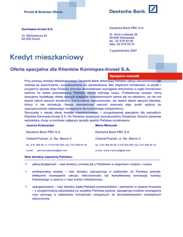 Konimpex-Invest S.A. Deutsche Bank PBC S.A. Ul. Mickiewicza 24 62-500 Konin Al. Armii Ludowej 26 00-609 Warszawa tel.: 22 579 93 90 faks: 22 579 93 91 3 pa dziernika 2007 Oferta specjalna dla Klientów Konimpex-Invest S.A. Przy pomocy Kredytu Mieszkaniowego Deutsche Bank sfinansuj Pa stwo zakup nieruchomo ci jak równie jej wyko czenie i przystosowanie do zamieszkania. Bez zb dnych formalno ci, w szybki i przyjemny sposób nasz Doradca pomo e skompletowa wymagane dokumenty a cz formalno ci we mie na siebie pozostawiaj c Pa stwu wi cej wolnego czasu. Podstawowa zasada, któr stosujemy kszta tuj c ofert naszych kredytów mieszkaniowych opiera si na za eniu, e nie ma dwóch takich samych konstrukcji finansowania nieruchomo ci, ani dwóch takich samych klientów, którzy o nie wnioskuj . Nasze standardowe warunki stanowi wi c punkt wyj cia do zaproponowania najlepszego rozwi zania dla konkretnego kredytobiorcy. Skorzystaj z naszej oferty kredytu mieszkaniowego – przygotowanej specjalnie dla wszystkich Klientów Konimpex-Invest S.A. Do Pa stwa dyspozycji wyznaczyli my Doradców, których starannie wybrali my chc c w mo liwie najlepszy sposób spe ni Pa stwa oczekiwania: Joanna Krakowska Maria Ma czak Deutsche Bank PBC S.A. Deutsche Bank PBC S.A. Oddzia Pozna , ul. w. Marcin 2 Oddzia Pozna , ul. w. Marcin 2 tel.: 0 61 858 46 11, 0 510 003 484, fax: 0 61 858 46 18; tel.: 0 61 858 46 09, 0 510 003 485, fax: 0 61 858 46 10; e-mail: e-mail: [email protected] [email protected] Nasi doradcy zapewni Pa stwu: § § § pe dost pno – nasi doradcy umówi si z Pa stwem w dogodnym miejscu i czasie, profesjonaln wiedz – nasi doradcy zaproponuj w zale no ci od Pa stwa potrzeb, efektywne rozwi zanie zakupu nieruchomo ci lub kompleksow koncepcj rozwoju finansowego w oparciu o nasz kredyt mieszkaniowy, zaanga owanie – nasi doradcy b Pa stwa przewodnikiem i partnerem w wiecie finansów – z przyjemno ci odpowiedz na wszelkie Pa stwa pytania, zasugeruj mo liwe rozwi zania oraz pomog w za atwieniu formalno ci zwi zanych ze skompletowaniem niezb dnych dokumentów. Bez wk adu w asnego - finansowanie do 100% warto ci inwestycji, § § § § § Okres kredytowania a do 40 lat, Bez por czycieli i zb dnych formalno ci, Bez ubezpieczenia na ycie, Kredyt dost pny a w czterech walutach: PLN, EUR, USD i CHF, Mo liwo wyp aty i sp at bezpo rednio w walutach obcych, Promocja cenowa polegaj ca na obni eniu mar y dla kredytów mieszkaniowych przeznaczonych na sfinansowanie nieruchomo ci nabywanej na rynku pierwotnym. Obni ona mar a obowi zuje przez okres pierwszych 12 miesi cy i wynosi 0,25%. Oprocentowanie zmienne W okresie pierwszych 12 miesi cy PLN 5,34%* ( WIBOR 3M + 0,25% ) CHF 3,04%* ( LIBOR 3M + 0,25% ) USD 5,49 %* ( LIBOR 3M + 0,25% ) EUR 5,05%* ( EURIBOR 3M + 0,25% ) Oprocentowanie zmienne Kwota kredytu pow. 200 000 PLN Kwota kredytu do 200 000 PLN PLN 5,99%* ( WIBOR 3M + 0,90% ) 6,19%* ( WIBOR 3M + 1,00% ) CHF 3,79%* ( LIBOR 3M + 1,00% ) 3,99%* (LIBOR 3M + 1,20% ) USD 6,24%* ( LIBOR 3M + 1,00% ) 6,44%* (LIBOR 3M + 1,20% ) EUR 5,80%* ( EURIBOR 3M + 1,00% ) 6,00%* (EURIBOR 3M + 1,20% ) Wcze niejsza sp ata kredytu 2% przez 36 miesi cy od wyp aty kredytu lub jego pierwszej transzy, po tym okresie bez op at Przewalutowanie kredytu Pierwsze gratis Rozpatrzenie wniosku 0 PLN *Stan na dzie 03.10.2007 Jeden kredyt o niskim oprocentowaniu zamiast wielu wysoko oprocentowanych kredytów i po yczek - a 30% kredytu mo na przeznaczy na sp at innych kredytów b zobowi za . Istnieje równie mo liwo sfinansowania wyko czenia nowo zakupionego mieszkania. Dodatkowo, ka dy Posiadacz naszego kredytu mieszkaniowego zyskuje: § § § preferencyjne warunki prowadzenia kont osobistych wraz z presti owymi kartami VISA Classic PCK i Visa Gold, limit w koncie osobistym bez prowizji, specjalne warunki udzielania po yczek konsumpcyjnych, samochodowych i lombardowych. Oferta obowi zuje od dnia 03.10.2007 do dnia 30.11.2007 Uwaga: Oferta przeznaczona jest dla nowych Klientów banku. Warunkiem skorzystania z oferty jest otwarcie konta osobistego w Deutsche Bank PBC S.A. wraz z wp ywami wynagrodzenia od pracodawcy. Deutsche Bank PBC S.A. z siedzib w Warszawie przy al. Armii Ludowej 26, zarejestrowany w S dzie Rejonowym dla miasta sto ecznego Warszawy, XII Wydzia Gospodarczy KRS pod numerem 0000022493, NIP 676 01 07 416, REGON 350526107, kapita zak adowy 396 655 552 z , op acony w ca ci