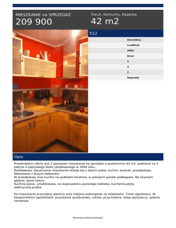MIESZKANIE na SPRZEDAŻ 209 900 Toruń, Koniuchy, Kozacka 42 m2 512 Secondary LowBlock 2004 Brick 3 3 2 Separate Opis Przedmiotem oferty jest 2 pokojowe mieszkanie na sprzedaż o powierzchni 42 m2, położone na 3 piętrze 4 piętrowego bloku zbudowanego w 2004 roku. Rozkładowe, dwustronne mieszkanie składa się z dwóch pokoi, kuchni, łazienki ,przedpokoju. Mieszkanie z dużym balkonem. W przedpokoju oraz kuchni na podłodze terakota, w pokojach panele podłogowe. Na ścianach gładzie, jasne kolory. Kuchnia jasna, umeblowana, na wyposażeniu pozostaje lodówka, kuchenka,płyta elektryczna,pralka. Do mieszkania przynależy piwnica oraz miejsce parkingowe za szlabanem. Teren ogrodzony. W bezpośrednim sąsiedztwie: przystanek autobusowy, szkoła, przychodnia, sklep spożywczy, galeria handlowa. Panorama Nieruchomości Oferta godna polecenia ze względu na wysoki standard, okazyjną cenę, położenie . Czynsz administracyjny: 200 zł ***Cena do negocjacji*** Zaproponuj swoją cenę*** Wszystkim naszym Klientom zapewniamy bezpłatną obsługę kredytową w bankach oferujących najlepsze warunki finansowania. Pomagamy na każdym etapie procedury kredytowej. PEŁNĄ GALERIĘ ZDJĘĆ ZNAJDZIECIE PAŃSTWO NA NASZEJ STRONIE PANORAMA-NIERUCHOMOŚCI.net ZAPRASZAMY Panorama Nieruchomości tel. 56/687-19-76 email: [email protected] Panorama Nieruchomości Powered by TCPDF (www.tcpdf.org)