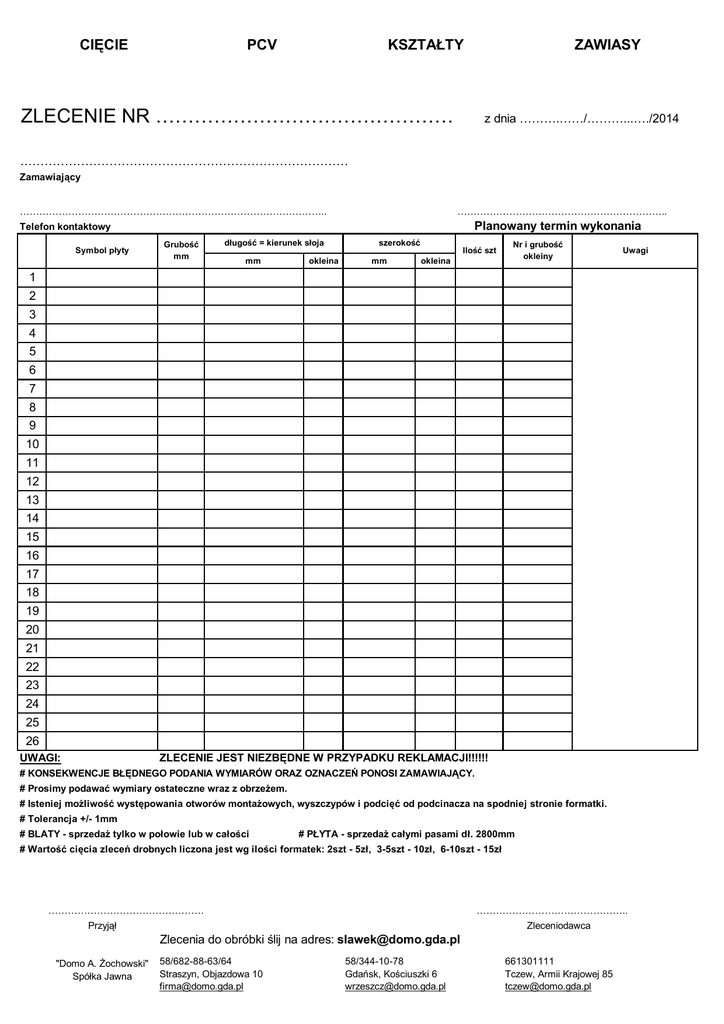 CIĘCIE PCV KSZTAŁTY ZAWIASY ZLECENIE NR ……………………………………………z dnia ……….……/………...…./2014 ……………………………………………………………………… Zamawiający ………………………………………………………………………………….. ……………………………………………………….. Planowany termin wykonania Telefon kontaktowy Symbol płyty Grubość mm długość = kierunek słoja mm okleina szerokość mm Ilość szt okleina Nr i grubość okleiny Uwagi 1 2 3 4 5 6 7 8 9 10 11 12 13 14 15 16 17 18 19 20 21 22 23 24 25 26 UWAGI: ZLECENIE JEST NIEZBĘDNE W PRZYPADKU REKLAMACJI!!!!!! # KONSEKWENCJE BŁĘDNEGO PODANIA WYMIARÓW ORAZ OZNACZEŃ PONOSI ZAMAWIAJĄCY. # Prosimy podawać wymiary ostateczne wraz z obrzeżem. # Isteniej możliwość występowania otworów montażowych, wyszczypów i podcięć od podcinacza na spodniej stronie formatki. # Tolerancja +/- 1mm # BLATY - sprzedaż tylko w połowie lub w całości # PŁYTA - sprzedaż całymi pasami dł. 2800mm # Wartość cięcia zleceń drobnych liczona jest wg ilości formatek: 2szt - 5zł, 3-5szt - 10zł, 6-10szt - 15zł ………………………………………… ……………………………………….. Przyjął Zleceniodawca Zlecenia do obróbki ślij na adres: [email protected] "Domo A. Żochowski" Spółka Jawna 58/682-88-63/64 Straszyn, Objazdowa 10 [email protected] 58/344-10-78 Gdańsk, Kościuszki 6 [email protected] 661301111 Tczew, Armii Krajowej 85 [email protected]