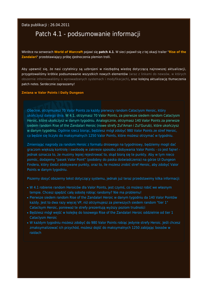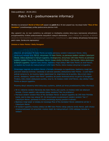 Data publikacji : 26.04.2011 Patch 4.1 - podsumowanie informacji Wkrótce na serwerach World of Warcraft pojawi się patch 4.1. W sieci pojawił się z tej okazji trailer "Rise of the Zandalari" przedstawiający próbę zjednoczenia plemion trolli. Aby upewnić się, że nasi czytelnicy są uzbrojeni w niezbędną wiedzę dotyczącą najnowszej aktualizacji, przygotowaliśmy krótkie podsumowanie wszystkich nowych elementów (wraz z linkami do newsów, w których obszernie informowaliśmy o wprowadzanych systemach i modyfikacjach), oraz kolejną aktualizację tłumaczenia patch notes. Serdecznie zapraszamy! Zmiana w Valor Points i Daily Dungeon Obecnie, otrzymujesz 70 Valor Points za każdy pierwszy random Cataclysm Heroic, który ukończysz danego dnia. W 4.1, otrzymasz 70 Valor Points, za pierwsze siedem random Cataclysm Heroic, które ukończysz w danym tygodniu. Analogicznie, otrzymasz 140 Valor Points za pierwsze siedem random Rise of the Zandalari Heroic (nowe strefy Zul'Aman i Zul'Gurub), które ukończysz w danym tygodniu. Ogólnie rzecz biorąc, będziesz mógł zdobyć 980 Valor Points ze stref Heroic, co będzie się liczyło do maksymalnych 1250 Valor Points, które możesz otrzymać w tygodniu. Zmieniając nagrody za random Heroic z formatu dniowego na tygodniowy, będziemy mogli dać graczom większą kontrolę i swobodę w zakresie sposobu zdobywania Valor Points - co jest fajne! jednak oznacza to, że musimy lepiej rejestrować to, skąd biorą się te punkty. Aby w tym nieco pomóc, dodajemy "pasek Valor Point" (podobny do paska doświadczenia) na górze UI Dungeon Findera, który śledzi zdobywane punkty, oraz to, ile możesz zrobić stref Heroic, aby zdobyć Valor Points w danym tygodniu. Piszemy dosyć obszerny tekst dotyczący systemu, jednak już teraz przedstawimy kilka informacji: ● ● ● ● W 4.1 robienie random Heroiców dla Valor Points, jest czymś, co możesz robić we własnym tempie. Chcesz spędzić całą sobotę robiąc randomy? Nie ma problemu! Pierwsze siedem random Rise of the Zandalari Heroic w danym tygodniu da 140 Valor Pointów każdy. Jest to dwa razy więcej VP, niż otrzymujesz za pierwszych siedem random "tier 1" Cataclsym Heroic, ponieważ te strefy prezentują wyższy poziom trudności Będziesz mógł wejść w kolejkę do losowego Rise of the Zandalari Heroic oddzielnie od tier 1 Cataclysm Heroic W każdym tygodniu możesz zdobyć do 980 Valor Points robiąc jedynie strefy Heroic. Jeśli chcesz zmaksymalizować ich przychód, możesz dojść do maksymalnych 1250 zabijając bossów w raidach Wkrótce rozpocznie się powstanie Zandalari, dlatego upewnij się, że przeczytałeś więcej na temat serii zadań dla 85-poziomowych graczy w Stranglethorn, oraz zaktualizowanych stref Zul'Gurub i Zul'Aman - dostępnych teraz dla 85-poziomowych postaci posiadających przedmioty na średnim poziomie 346 lub wyższym. Zupełnie nowe epickie przedmioty, rzadkie wierzchowce i wiele więcej skarbów oczekuje na ciebie, jeśli zdołasz sprostać wyzwaniu rzuconemu przez Zandalari. Jeśli czekałeś w kolejkach dłużej niż byś tego chciał, mamy zupełnie nowy system, Dungeon Finder: Call to Arms. Dungeon Finder będzie oferował pewien bonus dla osób grającymi rolą, której brakuje w kolejce. Mamy nadzieję, że dzięki temu będziesz mógł wkroczyć do akcji nieco szybciej. Do gry wprowadzony został także system Guild Finder, który będzie ulepszany z każdym kolejnym patchem. Niezależnie od tego, czy jesteś graczem poszukującym gildii, lub jej liderem, który szuka nowych rekrutów, ten element ułatwi to. Wciąż aktualizujemy, poprawiamy i dopasowujemy system rozwoju gildii i chcemy być pewni, że to narzędzie pozwoli na znalezienie i utrzymanie fajnej gildii. Jeśli już robisz content z członkami swej gildii, mogą cię zainteresować nadchodzące Guild Challenges. Po wykonaniu stref instance, raid, oraz Rated Battlegrounds w gildiowych grupach, otrzymasz nowe achievementy, złoto dla gildiowego banku, oraz gildiowe doświadczenie ponad dzienny limit. W kolejnych aktualizacjach gry planujemy wprowadzić jeszcze więcej Guild Challenges. Patch notes 4.1 Ogólne ● Honor jest kupowany od Justice Commodities Vendora w stosunku 250 Honoru za 375 Justice Points ● Justice jest kupowany od Honor Commodities Vendora w stosunku 250 Justice Points za 375 Honoru ● Conquest jest kupowany od Valor Vendora w stosunku 250 Conquest za 250 Valor ● Zmodyfikowany został system skalowania resilience. W nowym systemie przejście z 30 resilience do 40, poprawia przeżywalność tak samo, jak przejście od 0 do 10. Resilience skaluje się tak samo, jak armor i magic resistance. Gracz z redukcją 32.5% obrażeń od resilience w wersji 4.0.6, nie zobaczy żadnych zmian w 4.1. Osoby posiadające poniżej 32.5% otrzymają jej nieco więcej. Osoby posiadające większą redukcję, stracą. ● Martwi gracze mogą zostać wskrzeszeni przy pomocy Party lub Raid Frames, nawet jeśli skorzystali oni z opcji Release Spirit. Koniec z poszukiwaniem ciał Achievements ● Dodany został nowy feat of strength, wraz z tytułem "the Camel-Hoarder", dla graczy, którzy pokonali Dormusa i zdobyli Reins of the Grey Riding Camel ● PvP ❍ Poniższe osiągnięcia związane z Battlegroundami zostały usunięta z gry, bowiem nie działają odpowiednio z systemem śledzącym achievementy: Guild Gankin' in Gilneas, Guild Gulch, The Peak of Perfection, The Perfect Guild Storm, Storming the Beach ■ Rated Battlegrounds ● Nazwy achievementów na wygranie 100 rated Battlegroundów zostały zmienione na "Veteran of the Alliance", oraz "Veteran of the Horde" i dają takie tytuły ● Dodano achievementy na wygranie 300 rated Battlegroundów, które dają tytuły "Warbound" dla Przymierza i "Warbringer" dla Hordy ❍ Arathi Basin ■ Achievement "We Had It All Along *cough*" wymaga wygrania Arathi Basin 50 lub mniejszą ilością punktów, a nie 10 lub mniej ❍ The Batt