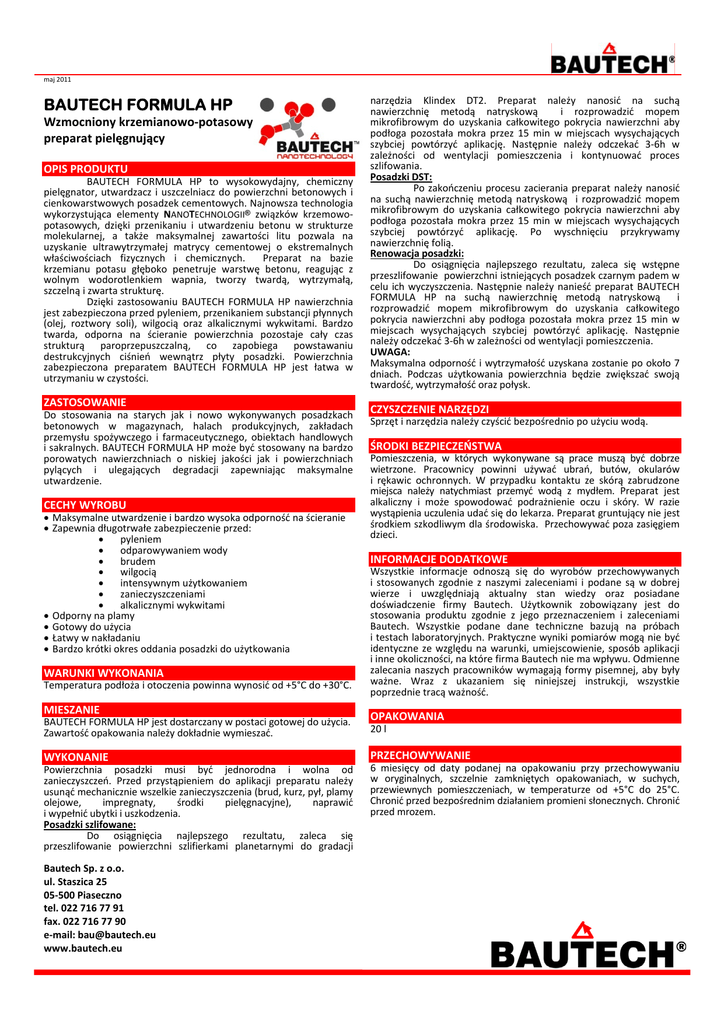 maj 2011 BAUTECH FORMULA HP Wzmocniony krzemianowo‐potasowy preparat pielęgnujący OPIS PRODUKTU BAUTECH FORMULA HP to wysokowydajny, chemiczny pielęgnator, utwardzacz i uszczelniacz do powierzchni betonowych i cienkowarstwowych posadzek cementowych. Najnowsza technologia wykorzystująca elementy NANOTECHNOLOGII® związków krzemowo‐ potasowych, dzięki przenikaniu i utwardzeniu betonu w strukturze molekularnej, a także maksymalnej zawartości litu pozwala na uzyskanie ultrawytrzymałej matrycy cementowej o ekstremalnych właściwościach fizycznych i chemicznych. Preparat na bazie krzemianu potasu głęboko penetruje warstwę betonu, reagując z wolnym wodorotlenkiem wapnia, tworzy twardą, wytrzymałą, szczelną i zwarta strukturę. Dzięki zastosowaniu BAUTECH FORMULA HP nawierzchnia jest zabezpieczona przed pyleniem, przenikaniem substancji płynnych (olej, roztwory soli), wilgocią oraz alkalicznymi wykwitami. Bardzo twarda, odporna na ścieranie powierzchnia pozostaje cały czas strukturą paroprzepuszczalną, co zapobiega powstawaniu destrukcyjnych ciśnień wewnątrz płyty posadzki. Powierzchnia zabezpieczona preparatem BAUTECH FORMULA HP jest łatwa w utrzymaniu w czystości. ZASTOSOWANIE Do stosowania na starych jak i nowo wykonywanych posadzkach betonowych w magazynach, halach produkcyjnych, zakładach przemysłu spożywczego i farmaceutycznego, obiektach handlowych i sakralnych. BAUTECH FORMULA HP może być stosowany na bardzo porowatych nawierzchniach o niskiej jakości jak i powierzchniach pylących i ulegających degradacji zapewniając maksymalne utwardzenie. CECHY WYROBU Maksymalne utwardzenie i bardzo wysoka odporność na ścieranie Zapewnia długotrwałe zabezpieczenie przed: pyleniem odparowywaniem wody brudem wilgocią intensywnym użytkowaniem zanieczyszczeniami alkalicznymi wykwitami Odporny na plamy Gotowy do użycia Łatwy w nakładaniu Bardzo krótki okres oddania posadzki do użytkowania WARUNKI WYKONANIA Temperatura podłoża i otoczenia powinna wynosić od +5°C do +30°C. MIESZANIE BAUTECH FORMULA HP jest dostarczany w postaci gotowej do użycia. Zawartość opakowania należy dokładnie wymieszać. WYKONANIE Powierzchnia posadzki musi być jednorodna i wolna od zanieczyszczeń. Przed przystąpieniem do aplikacji preparatu należy usunąć mechanicznie wszelkie zanieczyszczenia (brud, kurz, pył, plamy olejowe, impregnaty, środki pielęgnacyjne), naprawić i wypełnić ubytki i uszkodzenia. Posadzki szlifowane: Do osiągnięcia najlepszego rezultatu, zaleca się przeszlifowanie powierzchni szlifierkami planetarnymi do gradacji Bautech Sp. z o.o. ul. Staszica 25 05‐500 Piaseczno tel. 022 716 77 91 fax. 022 716 77 90 e‐mail: [email protected] www.bautech.eu narzędzia Klindex DT2. Preparat należy nanosić na suchą nawierzchnię metodą natryskową i rozprowadzić mopem mikrofibrowym do uzyskania całkowitego pokrycia nawierzchni aby podłoga pozostała mokra przez 15 min w miejscach wysychających szybciej powtórzyć aplikację. Następnie należy odczekać 3‐6h w zależności od wentylacji pomieszczenia i kontynuować proces szlifowania. Posadzki DST: Po zakończeniu procesu zacierania preparat należy nanosić na suchą nawierzchnię metodą natryskową i rozprowadzić mopem mikrofibrowym do uzyskania całkowitego pokrycia nawierzchni aby podłoga pozostała mokra przez 15 min w miejscach wysychających szybciej powtórzyć aplikację. Po wyschnięciu przykrywamy nawierzchnię folią. Renowacja posadzki: Do osiągnięcia najlepszego rezultatu, zaleca się wstępne przeszlifowanie powierzchni istniejących posadzek czarnym padem w celu ich wyczyszczenia. Następnie należy nanieść preparat BAUTECH FORMULA HP na suchą nawierzchnię metodą natryskową i rozprowadzić mopem mikrofibrowym do uzyskania całkowitego pokrycia nawierzchni aby podłoga pozostała mokra przez 15 min w miejscach wysychających szybciej powtórzyć aplikację. Następnie należy odczekać 3‐6h w zależności od wentylacji pomieszczenia. UWAGA: Maksymalna odporność i wytrzymałość uzyskana zostanie po około 7 dniach. Podczas użytkowania powierzchnia będzie zwiększać swoją twardość, wytrzymałość oraz połysk. CZYSZCZENIE NARZĘDZI Sprzęt i narzędzia należy czyścić bezpośrednio po użyciu wodą. ŚRODKI BEZPIECZEŃSTWA Pomieszczenia, w których wykonywane są prace muszą być dobrze wietrzone. Pracownicy powinni używać ubrań, butów, okularów i rękawic ochronnych. W przypadku kontaktu ze skórą zabrudzone miejsca należy natychmiast przemyć wodą z mydłem. Preparat jest alkaliczny i może spowodować podrażnienie oczu i skóry. W razie wystąpienia uczulenia udać się do lekarza. Preparat gruntujący nie jest środkiem szkodliwym dla środowiska. Przechowywać poza zasięgiem dzieci. INFORMACJE DODATKOWE Wszystkie informacje odnoszą się do wyrobów przechowywanych i stosowanych zgodnie z naszymi zaleceniami i podane są w dobrej wierze i uwzględniają aktualny stan wiedzy oraz posiadane doświadczenie firmy Bautech. Użytkownik zobowiązany jest do stosowania produktu zgodnie z jego przeznaczeniem i zaleceniami Bautech. Wszystkie podane dane techniczne bazują na próbach i testach laboratoryjnych. Praktyczne wyniki pomiarów mogą nie być identyczne ze względu na warunki, umiejscowienie, sposób aplikacji i inne okoliczności, na które firma Bautech nie ma wpływu. Odmienne zalecania naszych pracowników wymagają formy pisemnej, aby były ważne. Wraz z ukazaniem się niniejszej instrukcji, wszystkie poprzednie tracą ważność. OPAKOWANIA 20 l PRZECHOWYWANIE 6 miesięcy od daty podanej na opakowaniu przy przechowywaniu w oryginalnych, szczelnie zamkniętych opakowaniach, w suchych, przewiewnych pomieszczeniach, w temperaturze od +5°C do 25°C. Chronić przed bezpośrednim działaniem promieni słonecznych. Chronić przed mrozem. Kwiecień 2011 DANE TECHNICZNE Gęstość Wydajność Ilość warstw Czas schnięcia w temp. 