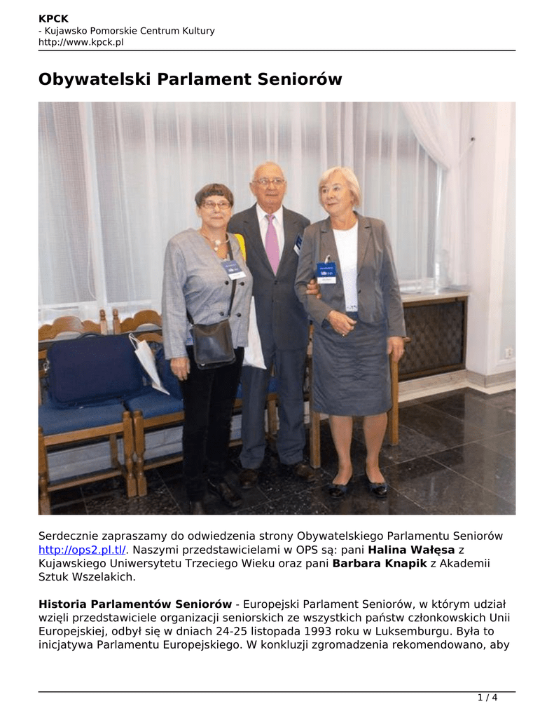 KPCK - Kujawsko Pomorskie Centrum Kultury http://www.kpck.pl Obywatelski Parlament Seniorów Serdecznie zapraszamy do odwiedzenia strony Obywatelskiego Parlamentu Seniorów http://ops2.pl.tl/. Naszymi przedstawicielami w OPS są: pani Halina Wałęsa z Kujawskiego Uniwersytetu Trzeciego Wieku oraz pani Barbara Knapik z Akademii Sztuk Wszelakich. Historia Parlamentów Seniorów - Europejski Parlament Seniorów, w którym udział wzięli przedstawiciele organizacji seniorskich ze wszystkich państw członkowskich Unii Europejskiej, odbył się w dniach 24-25 listopada 1993 roku w Luksemburgu. Była to inicjatywa Parlamentu Europejskiego. W konkluzji zgromadzenia rekomendowano, aby 1/4 KPCK - Kujawsko Pomorskie Centrum Kultury http://www.kpck.pl w każdym państwie członkowskim powstał Parlament Seniorów jako krajowe forum osób starszych i reprezentacja seniorów, która mogłaby wpływać na politykę państwa wobec osób starszych. Rekomendacje z 1993 roku zostały wdrożone w modelowej formie w Irlandii, gdzie od 1994 roku funkcjonuje Obywatelski Parlament Seniorów jako największa organizacja przedstawicielska osób starszych. 2/4 KPCK - Kujawsko Pomorskie Centrum Kultury http://www.kpck.pl 3/4 KPCK - Kujawsko Pomorskie Centrum Kultury http://www.kpck.pl Julian Waszak, [email protected], tel. 52 585 15 01 Zapraszamy do polubienia PIMu na Facebooku! 4/4 Powered by TCPDF (www.tcpdf.org)