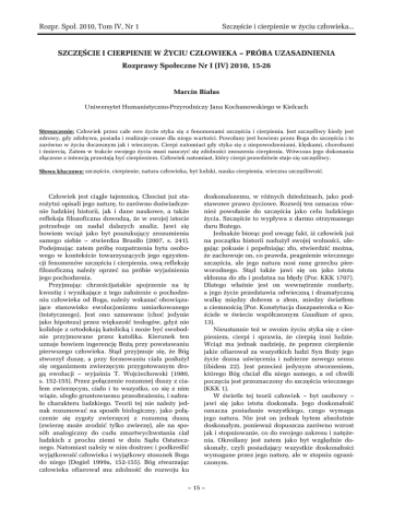 Rozpr. Społ. 2010, Tom IV, Nr 1 Szczęście i cierpienie w życiu człowieka... SZCZĘŚCIE I CIERPIENIE W ŻYCIU CZŁOWIEKA – PRÓBA UZASADNIENIA Rozprawy Społeczne Nr I (IV) 2010, 15-26 Marcin Białas Uniwersytet Humanistyczno-Przyrodniczy Jana Kochanowskiego w Kielcach Streszczenie: Człowiek przez całe swe życie styka się z fenomenami szczęścia i cierpienia. Jest szczęśliwy kiedy jest zdrowy, gdy zdobywa, posiada i realizuje cenne dla niego wartości. Powołany jest bowiem przez Boga do szczęścia i to zarówno w życiu doczesnym jak i wiecznym. Cierpi natomiast gdy styka się z niepowodzeniami, klęskami, chorobami i śmiercią. Zatem w trakcie swojego życia musi nauczyć się zdolności znoszenia cierpienia. Wówczas jego dokonania złączone z intencją przestają być cierpieniem. Człowiek natomiast, który cierpi prawdziwie staje się szczęśliwy. Słowa kluczowe: szczęście, cierpienie, natura człowieka, byt ludzki, nauka cierpienia, wieczna szczęśliwość. Człowiek jest ciągle tajemnicą. Chociaż już starożytni opisali jego naturę, to zarówno doświadczenie ludzkiej historii, jak i dane naukowe, a także refleksja filozoficzna dowodzą, że w swojej istocie potrzebuje on nadal dalszych analiz. Jawi się bowiem wciąż jako byt poszukujący zrozumienia samego siebie – stwierdza Brusiło (2007, s. 241). Podejmując zatem próbę rozpatrzenia bytu osobowego w kontekście towarzyszących jego egzystencji fenomenów szczęścia i cierpienia, ową refleksję filozoficzną należy oprzeć na próbie wyjaśnienia jego pochodzenia. Przyjmując chrześcijańskie spojrzenie na tę kwestię i wynikające z tego założenie o pochodzeniu człowieka od Boga, należy wskazać obowiązujące stanowisko ewolucjonizmu umiarkowanego (teistycznego). Jest ono uznawane (choć jedynie jako hipoteza) przez większość teologów, gdyż nie koliduje z ortodoksją katolicką i może być swobodnie przyjmowane przez katolika. Kierunek ten uznaje bowiem ingerencję Bożą przy powstawaniu pierwszego człowieka. Stąd przyjmuje się, że Bóg stworzył duszę, a przy formowaniu ciała posłużył się organizmem zwierzęcym przygotowanym drogą ewolucji – wyjaśnia T. Wojciechowski (1980, s. 152-155). Przez połączenie rozumnej duszy z ciałem zwierzęcym, ciało i to wszystko, co się z nim wiąże, uległo gruntownemu przeobrażeniu, i nabrało charakteru ludzkiego. Teorii tej nie należy jednak rozumować na sposób biologiczny, jako połączenie się zygoty zwierzęcej z rozumną duszą (zwierzę może zrodzić tylko zwierzę), ale na sposób analogiczny do cudu zmartwychwstania ciał ludzkich z prochu ziemi w dniu Sądu Ostatecznego. Natomiast należy w nim dostrzec i podkreślić wyjątkowość człowieka i wyjątkowy stosunek Boga do niego (Dogiel 1999a, 152-155). Bóg stwarzając człowieka ofiarował mu zdolność do rozwoju ku doskonalszemu, w różnych dziedzinach, jako podstawowe prawo życiowe. Rozwój ten oznacza również powołanie do szczęścia jako celu ludzkiego życia. Szczęście to wypływa z darmo otrzymanego daru Bożego. Jednakże biorąc pod uwagę fakt, iż człowiek już na początku historii nadużył swojej wolności, ulegając pokusie i popełniając zło, stwierdzić można, że zachowuje on, co prawda, pragnienie wiecznego szczęścia, ale jego natura nosi ranę grzechu pierworodnego. Stąd także jawi się on jako istota skłonna do zła i podatna na błędy (Por. KKK 1707). Dlatego właśnie jest on wewnętrznie rozdarty, a jego życie przedstawia odwieczną i dramatyczną walkę między dobrem a złem, miedzy światłem a ciemnością (Por. Konstytucja duszpasterska o Kościele w świecie współczesnym Gaudium et spes, 13). Nieustannie też w swoim życiu styka się z cierpieniem, cierpi i sprawia, że cierpią inni ludzie. Wciąż ma jednak nadzieję, że poprzez cierpienie jakie ofiarował za wszystkich ludzi Syn Boży jego życie dozna uświęcenia i nabierze nowego sensu (ibidem 22). Jest przecież jedynym stworzeniem, którego Bóg chciał dla niego samego, a od chwili poczęcia jest przeznaczony do szczęścia wiecznego (KKK 1). W świetle tej teorii człowiek – byt osobowy – jawi się jako istota doskonała. Jego doskonałość oznacza posiadanie wszystkiego, czego wymaga jego natura. Nie jest on jednak bytem absolutnie doskonałym, ponieważ dopuszcza zarówno wzrost jak i stopniowanie, co do swojego zakresu i natężenia. Określany jest zatem jako byt względnie doskonały, czyli posiadający wszystkie doskonałości wymagane przez jego naturę, ale w stopniu ograniczonym. – 15 – Rozpr. Społ. 2010, Tom IV, Nr 1 Szczęście i cierpienie w życiu człowieka... Już w okresie prenatalnym następuje jego wzrost i doskonalenie, a także niepowtarzalna aktywność, wskazująca na specyficzne i indywidualne cechy osobnicze. Zatem można przypuszczać, iż już w okresie płodowym następuje dążenie człowieka do pozytywnych doświadczeń, rozumianych tu jako osiąganie namiastki szczęścia, a także nieuchronność w zetknięciu się z przykrymi doznaniami, związanymi z cierpieniem. Argumentami potwierdzającymi pierwszą tezę, są dowody o aktywności płodu. Dziecko niemalże „tańczy” w macicy, wykonuje skoki, zgina kolana, odpycha się od ściany, unosi ku górze, opada. Zajmuje w niej pozycję najbardziej dla niego dogodną, i jest w stanie ją zmienić na przykład przy ucisku, lub wskutek niewygodnego ułożenia matki. W czasie snu obiera swoją ulubioną pozycję, która jest dość trwała, gdyż pozostaje na całe życie jako najczęstsza pozycja snu i wypoczynku, zwłaszcza w okresie choroby, przeciążeń i stresów. Również w czasie poruszania się i chodu matki płód doświadcza pozytywnych doświadczeń, które, także po urodzeniu (w postaci kołysania, kolebania) dają mu poczucie ciągłości doświadczeń, uspokajając i rozluźniając – wyjaśnia D. Kornas-Biela (2007, s. 15). Argumentem mog