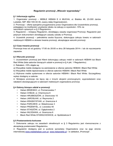 Regulamin promocji „Wieczór wyprzedaży” § 1 Informacje ogólne 1. Organizator promocji – MEBLE HEBAN E A MUCHA, ul. Bialska 46, 23-300 Janów Lubelski, NIP: 862-100-34-30, zwany dalej Organizatorem. 2. Promocja – oferta specjalna przygotowana przez Organizatora dla Uczestników promocji, polegająca na możliwości uzyskania rabatu na zakupy w wysokości -15% na warunkach opisanych w § 3 Regulaminu. 3. Regulamin – niniejszy Regulamin, określający zasady organizacji Promocji. Regulamin jest jedynym dokumentem określającym zasady udziału w Promocji. 4. Uczestnik promocji – pełnoletnia osoba fizyczna, dokonująca zakupu towaru w salonach meblowych HEBAN w okresie trwania promocji, akceptująca warunki promocji. § 2 Czas trwania promocji Promocja trwa od od godziny 17:00 do 20:00 w dniu 28 listopada 2014 r. lub do wyczerpania zapasów. § 3 Warunki promocji 1. Uczestnikiem promocji jest Klient dokonujący zakupu mebli w salonach HEBAN lub Black Red White (lista salonów biorących udział w promocji w § 4 pkt. 1 Regulaminu) 2. Rabatem -15% objęte są: a) Wszystkie meble dostępne na zamówienie w ofercie salonów HEBAN i Black Red White b) Wszystkie meble tapicerowane w ofercie salonów HEBAN i Black Red White c) Wybrane meble systemowe w ofercie salonów HEBAN i Black Red White. Szczegółowy wykaz dostępny w salonie. 4. Niniejsza promocja nie łączy się z innymi akcjami promocyjnymi, wyprzedażami oraz rabatami obowiązującymi w salonach meblowych organizatora promocji. § 4 Salony biorące udział w promocji • Heban BRZESKO, ul. Pomianowska 7 • Heban CHEŁM, ul. Chemiczna 6 • Heban HRUBIESZÓW, ul. Dworcowa 10 • Heban JAROSŁAW, ul. Reymonta 2 • Heban KRASNYSTAW, ul. Graniczna 4 • Heban PARCZEW, ul. Składnicowa 3 • Heban PRZEMYŚL, ul. Lwowska 40 • Heban STASZÓW, ul. Oględowska 2 • Heban WŁODAWA, ul. Graniczna 6 • Black Red White STARACHOWICE, ul. Spółdzielcza 6 § 5 Postanowienia końcowe 1. Dokonanie zakupu na zasadach określonych w § 3 Regulaminu jest równoznaczne z akceptacją postanowień Regulaminu. 2. Regulamin dostępny jest w punkcie sprzedaży Organizatora oraz na jego stronie internetowej www.mebleheban.com.pl, www.hebanelite.pl - w zakładce „Promocje”. 7. Reklamacje dotyczące przebiegu Promocji mogą być składane pisemnie (na adres Organizatora) najpóźniej w terminie 14 dni od daty zakończenia Promocji. Reklamacje rozpatrywać będzie specjalnie powołana do tego komisja – powołana przez Organizatora i składająca się przynajmniej z 3 osób – w terminie 14 dni roboczych od daty wpłynięcia (zgłoszenia) reklamacji. Uczestnik promocji zostanie niezwłocznie poinformowany o sposobie rozpatrzenia reklamacji. 8. Od decyzji komisji nie przysługuje odwołanie. Uczestnik promocji niezadowolony ze sposobu rozpatrzenia reklamacji przez komisję może skierować sprawę na drogę postępowania sądowego.