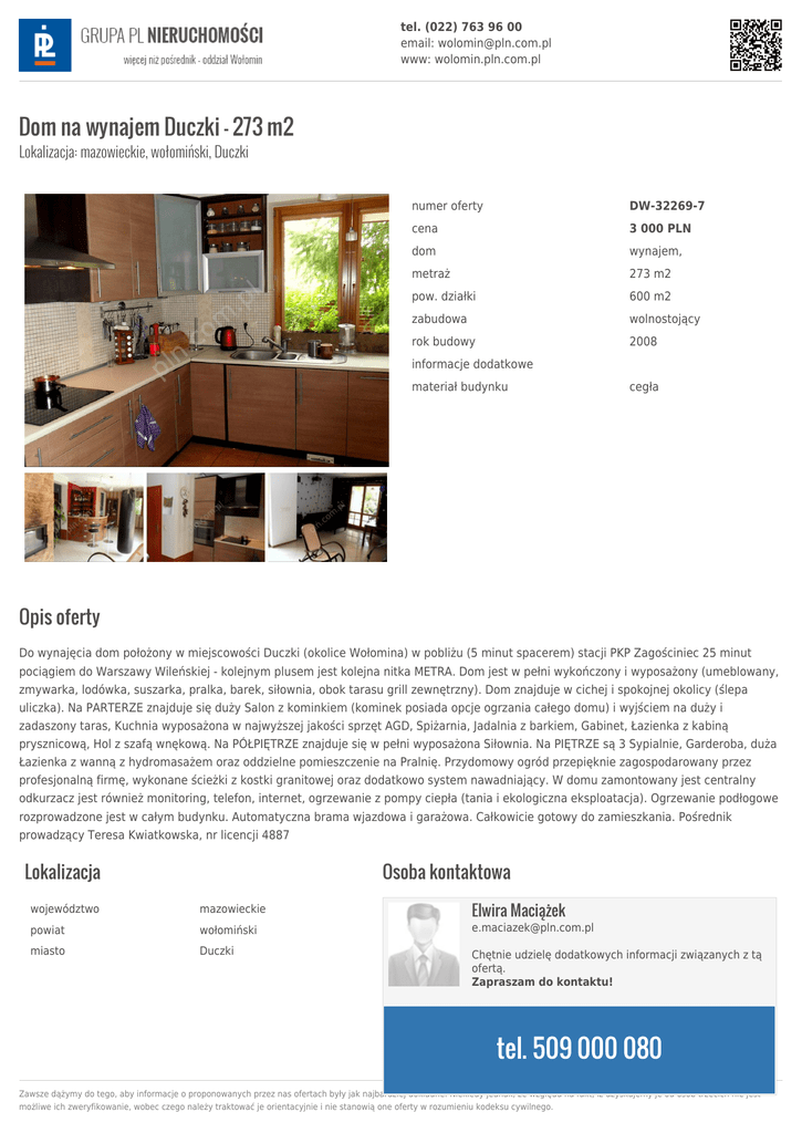 tel. (022) 763 96 00 email: [email protected] www: wolomin.pln.com.pl Dom na wynajem Duczki - 273 m2 Lokalizacja: mazowieckie, wołomiński, Duczki numer oferty DW-32269-7 cena 3 000 PLN dom wynajem, metraż 273 m2 pow. działki 600 m2 zabudowa wolnostojący rok budowy 2008 informacje dodatkowe materiał budynku cegła Opis oferty Do wynajęcia dom położony w miejscowości Duczki (okolice Wołomina) w pobliżu (5 minut spacerem) stacji PKP Zagościniec 25 minut pociągiem do Warszawy Wileńskiej - kolejnym plusem jest kolejna nitka METRA. Dom jest w pełni wykończony i wyposażony (umeblowany, zmywarka, lodówka, suszarka, pralka, barek, siłownia, obok tarasu grill zewnętrzny). Dom znajduje w cichej i spokojnej okolicy (ślepa uliczka). Na PARTERZE znajduje się duży Salon z kominkiem (kominek posiada opcje ogrzania całego domu) i wyjściem na duży i zadaszony taras, Kuchnia wyposażona w najwyższej jakości sprzęt AGD, Spiżarnia, Jadalnia z barkiem, Gabinet, Łazienka z kabiną prysznicową, Hol z szafą wnękową. Na PÓŁPIĘTRZE znajduje się w pełni wyposażona Siłownia. Na PIĘTRZE są 3 Sypialnie, Garderoba, duża Łazienka z wanną z hydromasażem oraz oddzielne pomieszczenie na Pralnię. Przydomowy ogród przepięknie zagospodarowany przez profesjonalną firmę, wykonane ścieżki z kostki granitowej oraz dodatkowo system nawadniający. W domu zamontowany jest centralny odkurzacz jest również monitoring, telefon, internet, ogrzewanie z pompy ciepła (tania i ekologiczna eksploatacja). Ogrzewanie podłogowe rozprowadzone jest w całym budynku. Automatyczna brama wjazdowa i garażowa. Całkowicie gotowy do zamieszkania. Pośrednik prowadzący Teresa Kwiatkowska, nr licencji 4887 Lokalizacja Osoba kontaktowa Elwira Maciążek województwo mazowieckie powiat wołomiński [email protected] miasto Duczki Chętnie udzielę dodatkowych informacji związanych z tą ofertą. Zapraszam do kontaktu! tel. 509 000 080 Zawsze dążymy do tego, aby informacje o proponowanych przez nas ofertach były jak najbardziej dokładne. Niekiedy jednak, ze względu na fakt, iż uzyskujemy je od osób trzecich nie jest możliwe ich zweryfikowanie, wobec czego należy traktować je orientacyjnie i nie stanowią one oferty w rozumieniu kodeksu cywilnego.