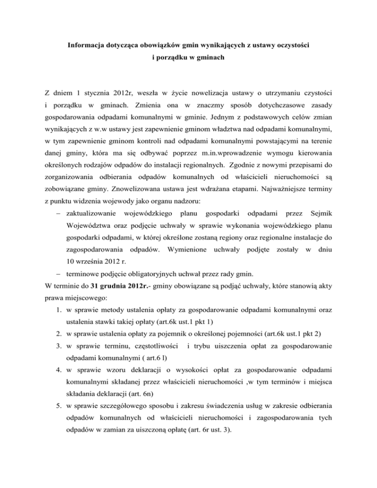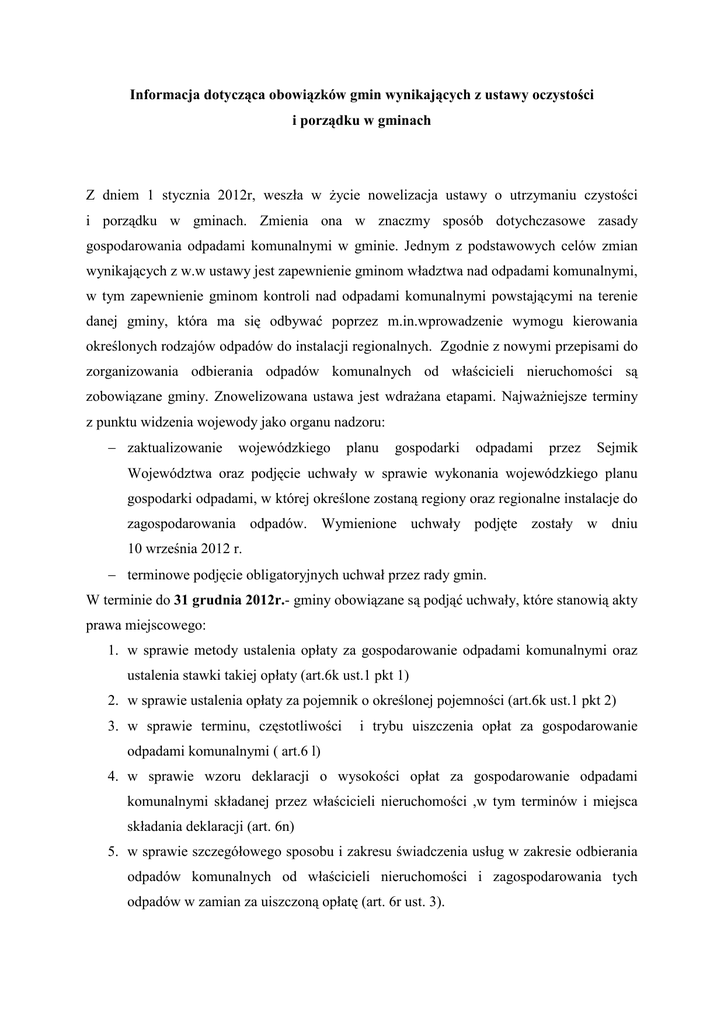 Informacja dotycząca obowiązków gmin wynikających z ustawy oczystości i porządku w gminach Z dniem 1 stycznia 2012r, weszła w życie nowelizacja ustawy o utrzymaniu czystości i porządku w gminach. Zmienia ona w znaczmy sposób dotychczasowe zasady gospodarowania odpadami komunalnymi w gminie. Jednym z podstawowych celów zmian wynikających z w.w ustawy jest zapewnienie gminom władztwa nad odpadami komunalnymi, w tym zapewnienie gminom kontroli nad odpadami komunalnymi powstającymi na terenie danej gminy, która ma się odbywać poprzez m.in.wprowadzenie wymogu kierowania określonych rodzajów odpadów do instalacji regionalnych. Zgodnie z nowymi przepisami do zorganizowania odbierania odpadów komunalnych od właścicieli nieruchomości są zobowiązane gminy. Znowelizowana ustawa jest wdrażana etapami. Najważniejsze terminy z punktu widzenia wojewody jako organu nadzoru: − zaktualizowanie wojewódzkiego planu gospodarki odpadami przez Sejmik Województwa oraz podjęcie uchwały w sprawie wykonania wojewódzkiego planu gospodarki odpadami, w której określone zostaną regiony oraz regionalne instalacje do zagospodarowania odpadów. Wymienione uchwały podjęte zostały w dniu 10 września 2012 r. − terminowe podjęcie obligatoryjnych uchwał przez rady gmin. W terminie do 31 grudnia 2012r.- gminy obowiązane są podjąć uchwały, które stanowią akty prawa miejscowego: 1. w sprawie metody ustalenia opłaty za gospodarowanie odpadami komunalnymi oraz ustalenia stawki takiej opłaty (art.6k ust.1 pkt 1) 2. w sprawie ustalenia opłaty za pojemnik o określonej pojemności (art.6k ust.1 pkt 2) 3. w sprawie terminu, częstotliwości i trybu uiszczenia opłat za gospodarowanie odpadami komunalnymi ( art.6 l) 4. w sprawie wzoru deklaracji o wysokości opłat za gospodarowanie odpadami komunalnymi składanej przez właścicieli nieruchomości ,w tym terminów i miejsca składania deklaracji (art. 6n) 5. w sprawie szczegółowego sposobu i zakresu świadczenia usług w zakresie odbierania odpadów komunalnych od właścicieli nieruchomości i zagospodarowania tych odpadów w zamian za uiszczoną opłatę (art. 6r ust. 3). Uchwały wymienione w pkt 1-4 oraz uchwała nieobowiązkowa podjęta na podstawie art. 6j ust. 2 ustawy są objęte działalnością nadzorczą Regionalnej Izby Obrachunkowej w Zielonej Górze. Organem nadzoru nad wszystkimi pozostałymi uchwałami podejmowanymi przez gminy na podstawie w/w ustawy jest wojewoda. Jeżeli rady gmin nie podejmą w terminie uchwał wskazanych w pkt 1-5, wojewoda wzywa je do ich podjęcia, wyznaczając termin, a po jego bezskutecznym upływie wyda w tych sprawach zarządzenia zastępcze. Zarządzenia zastępcze wywołają skutki prawne, takie jak akty prawa miejscowego. Uchwały i zarządzenia zastępcze nie mogą wejść w życie później niż w terminie 18 miesięcy od dnia wejścia w życie ustawy czyli 1 lipca 2013r. W terminie 6 miesięcy od uchwalenia wojewódzkiego planu gospodarki odpadami rady gmin mają obowiązek dostosować regulamin utrzymania czystości i porządku na terenie gminy do wojewódzkiego plany gospodarki odpadami. Ponadto gminy mają obowiązek podjąć uchwały w sprawie: 1. górnych stawek opłat ponoszonych przez właścicieli nieruchomości, którzy pozbywają się terenu nieruchomości nieczystości ciekłych, oraz właścicieli nieruchomości, którzy są zobowiązani zawrzeć umowy na odbieranie odpadów komunalnych (art. 6 ust. 2), 2. wymagań, jakie powinien spełnić przedsiębiorca ubiegający się o uzyskanie zezwolenia w zakresie opróżniania zbiorników bezodpływowych i transportu nieczystości ciekłych (art. 7 ust. 3a) Na podjęcie tych uchwał ustawodawca nie wyznaczył radom gmin terminu. Ustawa daje również możliwość podjęcia przez rady gmin uchwał w sprawach: 1. przejęcia od właścicieli nieruchomości wszystkich albo wskazanych obowiązków w zakresie pozbywania się nieczystości ciekłych oraz uprzątania zanieczyszczeń z chodników (art. 6a) 2. odbierania odpadów komunalnych od właścicieli nieruchomości, na których nie zamieszkują mieszkańcy, a powstają odpady (art. 6c) 3. podziału gminy na sektory ( art. 6d ust. 2) 4. rodzaju dodatkowych usług świadczonych przez gminę w zakresie odbierania odpadów komunalnych oraz wysokości cen za te usługi (art. 6r ust. 4) 5. uchwalenia jednej stawki opłaty za gospodarowanie odpadami komunalnymi od gospodarstwa domowego (art. 6 j ust. 2) 6. innego sposobu udokumentowania wykonania obowiązków pozbywania się z terenu nieruchomości nieczystości ciekłych oraz odpadów komunalnych (art.6 ust.1a) Decyzje co do podjęcia w.w. uchwał jak i termin ich podjęcia ustawodawca pozostawił radom gmin.