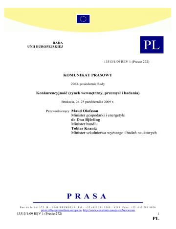 PL RADA UII EUROPEJSKIEJ 13513/1/09 REV 1 (Presse 272) KOMUIKAT PRASOWY 2963. posiedzenie Rady Konkurencyjność (rynek wewnętrzny, przemysł i badania) Bruksela, 24-25 października 2009 r. Przewodniczący Maud Olofsson Minister gospodarki i energetyki dr Ewa Björling Minister handlu Tobias Krantz Minister szkolnictwa wyższego i badań naukowych PRASA Rue de la Loi 175 B – 1048 BRUKSELA T el.: +32 (0)2 281 5389 / 6319 Fak s: +32 (0 )2 281 8026 [email protected] http://www.consilium.europa.eu/Newsroom 13513/1/09 REV 1 (Presse 272) 1 PL 24.-25.X.2009 Główne wyniki posiedzenia Rady Rada przyjęła konkluzje w sprawie praktycznych środków służących poprawie funkcjonowania rynku wewnętrznego, w tym skutecznego wdrożenia dyrektywy usługowej. Rada przeprowadziła dwie debaty jawne w ramach przygotowań do przeglądu polityki innowacyjnej Wspólnoty, odpowiednio z punktu widzenia konkurencyjności i rozwoju europejskiej przestrzeni badawczej. Rada przeprowadziła debatę w sprawie projektu dyrektywy, która ma uprościć otoczenie biznesu, zwłaszcza w odniesieniu do mikroprzedsiębiorstw, tak aby zwiększyć ich konkurencyjność. Rada została poinformowana przez Komisję o najnowszych wydarzeniach mających wpływ na przemysł motoryzacyjny w Europie, a zwłaszcza o sytuacji firmy Opel. Rada przyjęła − bez przeprowadzania dyskusji − trzy rozporządzenia wchodzące w skład pakietu dotyczącego transportu drogowego. 13513/1/09 REV 1 (Presse 272) 2 PL 24.-25.X.2009 SPIS TREŚCI1 UCZESTICY .................................................................................. Error! Bookmark not defined. OMAWIAE PUKTY Przegląd polityki innowacyjnej ....................................................... Error! Bookmark not defined. Środki mające służyć poprawie funkcjonowania rynku wewnętrznego − konkluzje Rady................. 8 Dyrektywa usługowa: stan realizacji ............................................... Error! Bookmark not defined. Uproszczenie otoczenia biznesu w odniesieniu do mikroprzedsiębiorstwError! Bookmark not defined. Europejska przestrzeń badań i innowacji ....................................................................................... 11 Sprawy różne ................................................................................................................................ 13 IE ZATWIERDZOE PUKTY WSPÓLNA POLITYKA ZAGRANICZNA I BEZPIECZEŃSTWA – Międzynarodowy Trybunał Karny dla Byłej Jugosławii − wsparcie dla mandatu...............................................16 WYMIAR SPRAWIEDLIWOŚCI I SPRAWY WEWNĘTRZNE – Baza danych systemu informacyjnego Schengen − budżet korygujący na rok 2009...........................................16 ROLNICTWO – Ochrona zwierząt podczas ich uśmiercania *....................................................................................................16 – Zrównoważone stosowanie pestycydów ...........................................................................................................18 – Wprowadzanie do obrotu środków ochrony roślin............................................................................................19 – Maszyny do stosowania pestycydów................................................................................................................20 1 Jeżeli deklaracje, konkluzje lub rezolucje zostały przez Radę formalnie przyjęte, jest to zaznaczone w tytule danego punktu, a tekst jest umieszczony w cudzysłowie. Dokumenty, do których odesłano w tekście, są dostępne na internetowej stronie Rady (http://www.consilium.europa.eu). Gwiazdką oznaczono akty przyjęte wraz z oświadczeniami do protokołu Rady przeznaczonymi do wiadomości publicznej; oświadczenia te można znaleźć na wyżej wspomnianej internetowej stronie Rady lub uzyskać z biura prasowego. 13513/1/09 REV 1 (Presse 272) 3 PL 24.-25.X.2009 ŚRODOWISKO – Emisja gazów cieplarnianych – wnioski w ramach procedury komitetowej .......................................................20 – Emisje ze stacji paliw ......................................................................................................................................21 TRANSPORT – Licencje maszynisty – interoperacyjność systemu kolei – wnioski w ramach procedury komitetowej ................21 – Pakiet dotyczący transportu drogowego ...........................................................................................................21 ENERGIA – Dyrektywa w sprawie ekoprojektu* .................................................................................................................22 POLITYKA HANDLOWA – Środki antydumpingowe: rury i przewody z żelaza lub stali – folia aluminiowa – wózki jezdniowe ręczne (paletowe) .......................................................................................................................................................22 WSPÓŁPRACA NA RZECZ ROZWOJU – Wyspy Fidżi – odpowiednie środki ..................................................................................................................23 MIANOWANIA – Komitet Regionów ..........................................................................................................................................23 13513/1/09 REV 1 (Presse 272) 4 PL 24.-25.X.2009 UCZESTICY Rządy państw członkowskich oraz Komisja Europejska były reprezentowane przez następujące osoby: Belgia: Vincent VAN QUICKENBORNE Benoît CEREXHE minister ds. przedsiębiorstw i uproszczeń administracyjnych minister rządu Regionu Stołecznego Brukseli odpowiedzialny za pracę, gospodarkę, badania naukowe, pożarnictwo i ratownictwo medyczne Bułgaria: Trajczo TRAJKOW Sergej IGNATOW minister gospodarki, energetyki i turystyki wiceminister ds. edukacji, młodzieży i nauki Republika Czeska: Martin TLAPA Vlastimil RŮŽIČKA wiceminister przemysłu i handlu wiceminister ds. ed