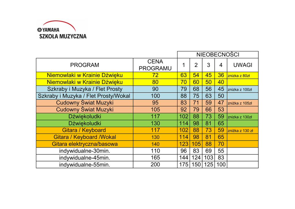NIEOBECNOŚCI PROGRAM Niemowlaki w Krainie Dźwięku Niemowlaki w Krainie Dźwięku Szkraby i Muzyka / Flet Prosty Szkraby i Muzyka / Flet Prosty/Wokal Cudowny Świat Muzyki Cudowny Świat Muzyki Dźwiękoludki Dźwiękoludki Gitara / Keyboard Gitara / Keyboard /Wokal Gitara elektryczna/basowa indywidualne-30min. indywidualne-45min. indywidualne-55min. CENA PROGRAMU 72 80 90 100 95 105 117 130 117 130 140 110 165 200 1 2 3 4 63 70 79 88 83 92 102 114 102 114 123 96 144 175 54 60 68 75 71 79 88 98 88 98 105 83 124 150 45 50 56 63 59 66 73 81 73 81 88 69 103 125 36 40 45 50 47 53 59 65 59 65 70 55 83 100 UWAGI znizka z 80zł znizka z 100zł zniżka z 105zł znizka z 130zł zniżka z 130 zł