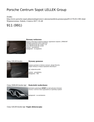 Porsche Centrum Sopot LELLEK Group Źródło: http://www.porsche-sopot.pl/pos/uslugi/czesci-i-akcesoria/oferta-promocyjna/911/170,911-991.html Wygenerowano: Sobota, 4 marca 2017, 01:48 911 (991) Dywany welurowe Dywany welurowe w kolorze wnętrza, sygnowane napisem „PORSCHE” dostępne wszystkie kolory tapicerek cena 820,00 brutto kpl. przód + tył cena 440,00 brutto kpl. przód montaż - samodzielny dostępność - na zapytanie Cena 330,00 brutto Dywany gumowe Dywany gumowe w kolorze czarnym, design Porsche szybki montaż w miejsce dywanów welurowych kpl. wyłącznie przód montaż - samodzielny dostępnośc - TAK Cena 3500,00 brutto kpl Końcówki wydechowe Końcówki wydechowe SPORT ze stali pokrytej chromem Carrera i Carrera S bez wyposażenia w sportowy wydech dostępność - na zamówienie Cena 520,00 brutto kpl Napis dekoracyjny Napis dekoracyjny przyklejany na drzwi Carrera S lub 4S do wyboru w dwóch kolorach: czarny i srebrny dostępność - na zamówienie Tweetnij