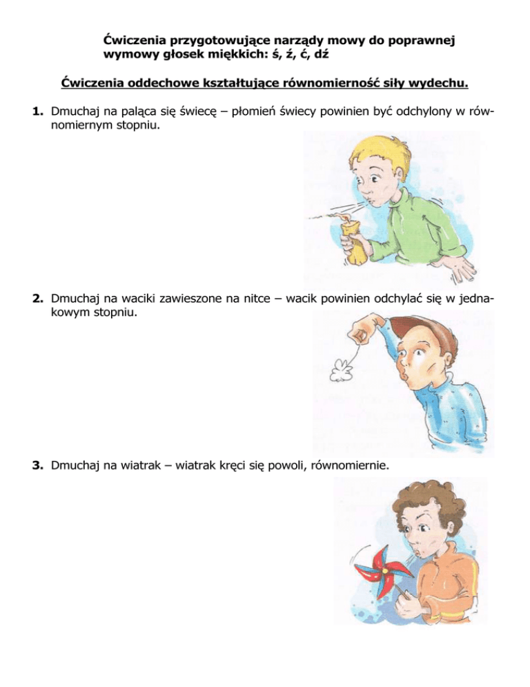 Ćwiczenia przygotowujące narządy mowy do poprawnej wymowy głosek miękkich: ś, ź, ć, dź Ćwiczenia oddechowe kształtujące równomierność siły wydechu. 1. Dmuchaj na paląca się świecę – płomień świecy powinien być odchylony w równomiernym stopniu. 2. Dmuchaj na waciki zawieszone na nitce – wacik powinien odchylać się w jednakowym stopniu. 3. Dmuchaj na wiatrak – wiatrak kręci się powoli, równomiernie. Ćwiczenia przygotowujące narządy mowy do poprawnej wymowy głosek miękkich: ś, ź, ć, dź Ćwiczenia warg 1. Ściągniętymi wargami chwyć koniec ołówka tak, jak mama – ptak, która w dziobie niesie pokarm pisklętom. 2. Ściągnij usta i przesuwaj je w lewą a potem w prawą stronę, jak królik. Ćwiczenia języka 1. Wysuwaj szeroki język w kierunku brody, jak zdyszany pies. 2. Układaj szeroki język na dolnej wardze (boki dotykają kącików ust), tak by przypominał wysuniętą szufladę. 3. Przy mocno opuszczonej szczęce nej, dotykaj czubkiem języka wnętrznej powierzchni zębów nych, pacaj tak, jak silne ręce pchają zepsuty samochód. dolwedoltaty Ćwiczenia przygotowujące narządy mowy do poprawnej wymowy głosek miękkich: ś, ź, ć, dź 4. Przesuwaj grzbiet języka tak, aby ocierał się o górne żeby, jak kocur, który ociera swój grzbiet o stołek (w tym czasie czubek języka powinien być przyciśnięty do wewnętrznej powierzchni dolnych siekaczy). 5. Przyciskaj język do wewnętrznej powierzchni zębów górnych i cofaj go, silnie trąc nim dziąsła i podniebienie aż do wytworzenia mlaskania, pobaw się w galopujące konie. 6. Mlaskaj środkiem języka, jak prosiaczki w trakcie jedzenia. 7. Ssij cukierek środkiem języka. Ćwiczenia przygotowujące narządy mowy do poprawnej wymowy głosek miękkich: ś, ź, ć, dź