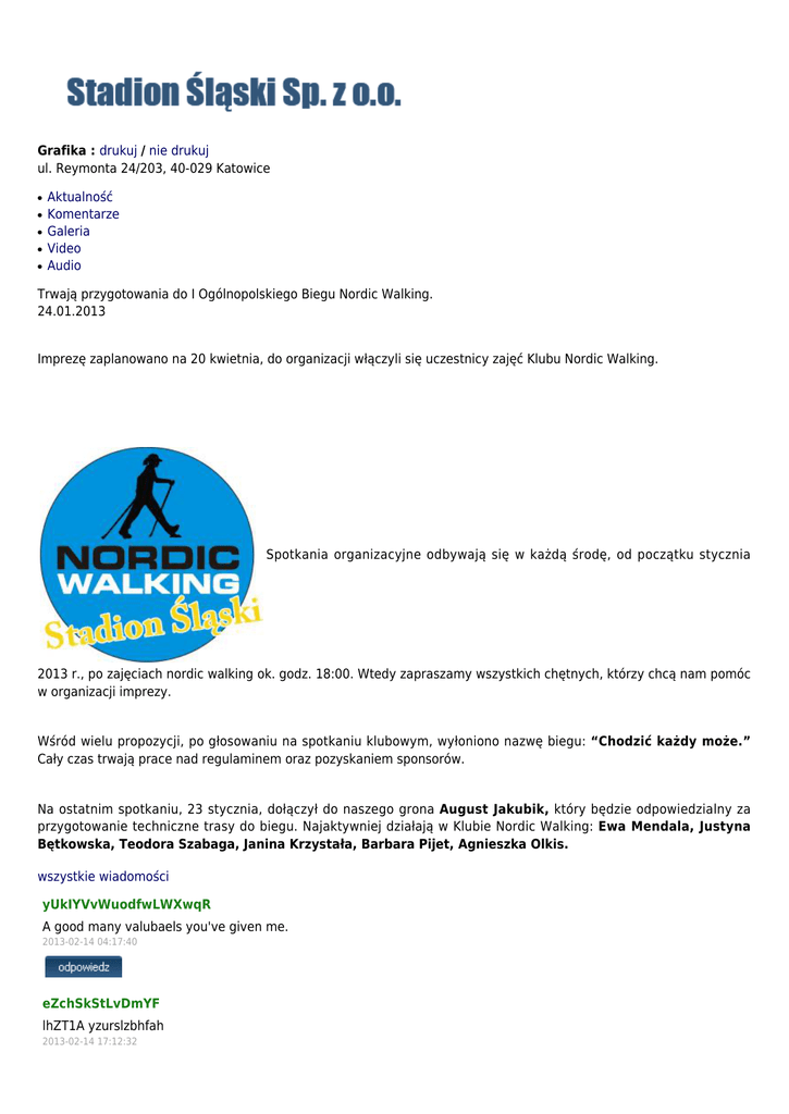 Grafika : drukuj / nie drukuj ul. Reymonta 24/203, 40-029 Katowice ● ● ● ● ● Aktualność Komentarze Galeria Video Audio Trwają przygotowania do I Ogólnopolskiego Biegu Nordic Walking. 24.01.2013 Imprezę zaplanowano na 20 kwietnia, do organizacji włączyli się uczestnicy zajęć Klubu Nordic Walking. Spotkania organizacyjne odbywają się w każdą środę, od początku stycznia 2013 r., po zajęciach nordic walking ok. godz. 18:00. Wtedy zapraszamy wszystkich chętnych, którzy chcą nam pomóc w organizacji imprezy. Wśród wielu propozycji, po głosowaniu na spotkaniu klubowym, wyłoniono nazwę biegu: “Chodzić każdy może.” Cały czas trwają prace nad regulaminem oraz pozyskaniem sponsorów. Na ostatnim spotkaniu, 23 stycznia, dołączył do naszego grona August Jakubik, który będzie odpowiedzialny za przygotowanie techniczne trasy do biegu. Najaktywniej działają w Klubie Nordic Walking: Ewa Mendala, Justyna Bętkowska, Teodora Szabaga, Janina Krzystała, Barbara Pijet, Agnieszka Olkis. wszystkie wiadomości yUkIYVvWuodfwLWXwqR A good many valubaels you've given me. 2013-02-14 04:17:40 eZchSkStLvDmYF lhZT1A yzurslzbhfah 2013-02-14 17:12:32 Treść komentarza: Autor: Przepisz token jeżeli chcesz wysłać powyższy komentarz to NIE ZAZNACZAJ tego pola dodaj komentarz