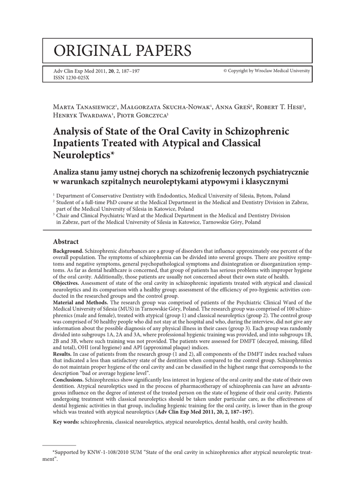 original papers Adv Clin Exp Med 2011, 20, 2, 187–197 ISSN 1230-025X © Copyright by Wroclaw Medical University Marta Tanasiewicz1, Małgorzata Skucha-Nowak1, Anna Greń2, Robert T. Hese3, Henryk Twardawa1, Piotr Gorczyca3 Analysis of State of the Oral Cavity in Schizophrenic Inpatients Treated with Atypical and Classical Neuroleptics* Analiza stanu jamy ustnej chorych na schizofrenię leczonych psychiatrycznie w warunkach szpitalnych neuroleptykami atypowymi i klasycznymi Department of Conservative Dentistry with Endodontics, Medical University of Silesia, Bytom, Poland Student of a full-time PhD course at the Medical Department in the Medical and Dentistry Division in Zabrze, part of the Medical University of Silesia in Katowice, Poland 3 Chair and Clinical Psychiatric Ward at the Medical Department in the Medical and Dentistry Division in Zabrze, part of the Medical University of Silesia in Katowice, Tarnowskie Góry, Poland 1 2 Abstract Background. Schizophrenic disturbances are a group of disorders that influence approximately one percent of the overall population. The symptoms of schizophrenia can be divided into several groups. There are positive symptoms and negative symptoms, general psychopathological symptoms and disintegration or disorganization symptoms. As far as dental healthcare is concerned, that group of patients has serious problems with improper hygiene of the oral cavity. Additionally, those patients are usually not concerned about their own state of health. Objectives. Assessment of state of the oral cavity in schizophrenic inpatients treated with atypical and classical neuroleptics and its comparison with a healthy group; assessment of the efficiency of pro-hygienic activities conducted in the researched groups and the control group. Material and Methods. The research group was comprised of patients of the Psychiatric Clinical Ward of the Medical University of Silesia (MUS) in Tarnowskie Góry, Poland. The research group was comprised of 100 schizophrenics (male and female), treated with atypical (group 1) and classical neuroleptics (group 2). The control group was comprised of 50 healthy people who did not stay at the hospital and who, during the interview, did not give any information about the possible diagnosis of any physical illness in their cases (group 3). Each group was randomly divided into subgroups 1A, 2A and 3A, where professional hygienic training was provided, and into subgroups 1B, 2B and 3B, where such training was not provided. The patients were assessed for DMFT (decayed, missing, filled and total), OHI (oral hygiene) and API (approximal plaque) indices. Results. In case of patients from the research group (1 and 2), all components of the DMFT index reached values that indicated a less than satisfactory state of the dentition when compared to the control group. Schizophrenics do not maintain proper hygiene of the oral cavity and can be classified in the highest range that corresponds to the description “bad or average hygiene level”. Conclusions. Schizophrenics show significantly less interest in hygiene of the oral cavity and the state of their own dentition. Atypical neuroleptics used in the process of pharmacotherapy of schizophrenia can have an advantageous influence on the degree of interest of the treated person on the state of hygiene of their oral cavity. Patients undergoing treatment with classical neuroleptics should be taken under particular care, as the effectiveness of dental hygienic activities in that group, including hygienic training for the oral cavity, is lower than in the group which was treated with atypical neuroleptics (Adv Clin Exp Med 2011, 20, 2, 187–197). Key words: schizophrenia, classical neuroleptics, atypical neuroleptics, dental health, oral cavity health. *Supported by KNW-1-108/2010 SUM “State of the oral cavity in schizophrenics after atypical neuroleptic treatment”. 188 M. Tanasiewicz et al. Streszczenie Wprowadzenie. Zaburzenia schizofreniczne to grupa schorzeń, która dotyka około 1/100 osób w populacji ogólnej. W schizofrenii wyróżnia się objawy pozytywne, objawy negatywne, ogólne objawy psychopatologiczne i objawy dezintegracyjne. Z punktu widzenia opieki stomatologicznej, w tej grupie chorych wyraźne problemy są związane z nieodpowiednią higieną jamy ustnej, na którą dodatkowy wpływ ma brak zainteresowania chorych własną kondycją. Cel pracy. Ocena stanu jamy ustnej u chorych na schizofrenię, leczonych psychiatrycznie w warunkach szpitalnych neuroleptykami atypowymi i klasycznymi w porównaniu z grupą osób zdrowych; ocena skuteczności stomatologicznych działań higienizacyjnych przeprowadzanych w grupach badanych i kontrolnej. Materiał i metody. Grupę badaną stanowili pacjenci Oddziału Klinicznego Psychiatrii SUM w Tarnowskich Górach. Grupa badana obejmowała 100 osób (kobiet i mężczyzn) chorych na schizofrenię leczonych neuroleptykami atypowymi (grupa 1) i klasycznymi (grupa 2). Średnia wieku pacjentów badanych wynosiła 37,5 ± 0,5 lat. Grupę kontrolną stanowiło 50 osób zdrowych (kobiet i mężczyzn), nieprzebywających w warunkach szpitalnych, u których w wywiadzie nie uzyskano informacji na temat rozpoznania chorób psychiatrycznych (grupa 3). Średnia wieku pacjentów grupy kontrolnej wynosiła 39,5 ± 0,5 lat. W każdej grupie u połowy pacjentów losowo podporządkowanych do podgrupy 1A, 2A i 3A przeprowadzono profesjonalny instruktaż higieny. U pacjentów oznaczono wskaźniki PUW, OHI i API. Wyniki. Wszystkie składowe wskaźnika PUW u pacjentów grupy 1 i 2 osiągnęły wartości wskazujące na mniej zadowalający, w porównaniu z grupą kontrolną, stan uzębienia. U osób chorujących na schizofrenię higiena jamy ustnej jest niewłaściwa; są one klasyfikowane w najwyższym przedziale korelującym z określeniem „higiena zła i średnia”. Wnioski. Pacjenci chorzy na schizofrenię wykazują mniejsze zainteresowanie higieną jamy ustnej i s