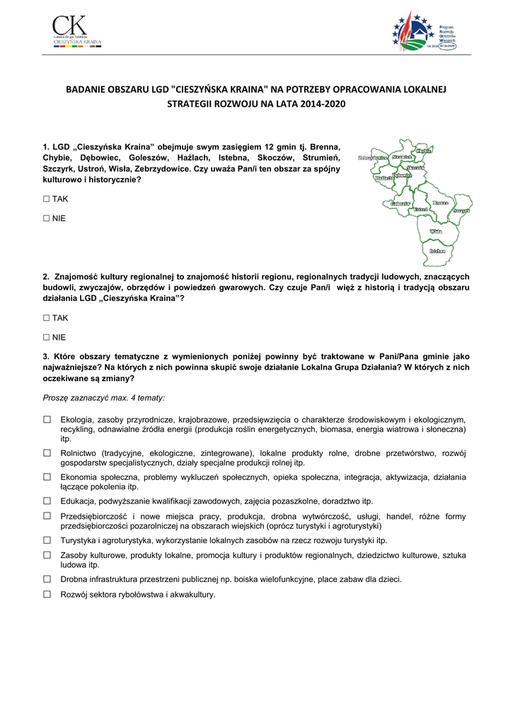 BADANIE OBSZARU LGD "CIESZYŃSKA KRAINA" NA POTRZEBY OPRACOWANIA LOKALNEJ STRATEGII ROZWOJU NA LATA 2014-2020 1. LGD „Cieszyńska Kraina” obejmuje swym zasięgiem 12 gmin tj. Brenna, Chybie, Dębowiec, Goleszów, Hażlach, Istebna, Skoczów, Strumień, Szczyrk, Ustroń, Wisła, Zebrzydowice. Czy uważa Pan/i ten obszar za spójny kulturowo i historycznie? TAK NIE 2. Znajomość kultury regionalnej to znajomość historii regionu, regionalnych tradycji ludowych, znaczących budowli, zwyczajów, obrzędów i powiedzeń gwarowych. Czy czuje Pan/i więź z historią i tradycją obszaru działania LGD „Cieszyńska Kraina”? TAK NIE 3. Które obszary tematyczne z wymienionych poniżej powinny być traktowane w Pani/Pana gminie jako najważniejsze? Na których z nich powinna skupić swoje działanie Lokalna Grupa Działania? W których z nich oczekiwane są zmiany? Proszę zaznaczyć max. 4 tematy: Ekologia, zasoby przyrodnicze, krajobrazowe, przedsięwzięcia o charakterze środowiskowym i ekologicznym, recykling, odnawialne źródła energii (produkcja roślin energetycznych, biomasa, energia wiatrowa i słoneczna) itp. Rolnictwo (tradycyjne, ekologiczne, zintegrowane), lokalne produkty rolne, drobne przetwórstwo, rozwój gospodarstw specjalistycznych, działy specjalne produkcji rolnej itp. Ekonomia społeczna, problemy wykluczeń społecznych, opieka społeczna, integracja, aktywizacja, działania łączące pokolenia itp. Edukacja, podwyższanie kwalifikacji zawodowych, zajęcia pozaszkolne, doradztwo itp. Przedsiębiorczość i nowe miejsca pracy, produkcja, drobna wytwórczość, usługi, handel, różne formy przedsiębiorczości pozarolniczej na obszarach wiejskich (oprócz turystyki i agroturystyki) Turystyka i agroturystyka, wykorzystanie lokalnych zasobów na rzecz rozwoju turystyki itp. Zasoby kulturowe, produkty lokalne, promocja kultury i produktów regionalnych, dziedzictwo kulturowe, sztuka ludowa itp. Drobna infrastruktura przestrzeni publicznej np. boiska wielofunkcyjne, place zabaw dla dzieci. Rozwój sektora rybołówstwa i akwakultury. 4. Który z poniżej wymienionych czterech wiodących tematów powinien zostać uznany za priorytetowy dla LGD? Który z tych tematów jest kluczowy dla rozwoju obszarów wiejskich na terenie LGD „Cieszyńska Kraina”? Proszę uporządkować w kolejności od 1-6 od najważniejszych do najmniej ważnych priorytetów. Innowacje – zastosowanie nowych informacji, wiedzy, nowych technologii w celu podniesienia konkurencyjności produktów i usług świadczonych na terenach wiejskich Poprawa jakości życia na obszarach wiejskich, w tym projekty odnowy wsi np. budowa małej infrastruktury, placów zabaw, chodników, zagospodarowanie terenów zielonych itp. Wspieranie powstawania i promowanie produktów i usług lokalnych, w tym opartych na produkcji rolnej, zasobach dziedzictwa kulturowego, lokalnych atrakcjach itp. Wykorzystanie zasobów naturalnych, przyrodniczych i krajobrazowych obszarów wiejskich Przedsiębiorczość – powstanie nowych miejsc pracy. Kultura – zachowanie dziedzictwa kulturowego. 5. Która grupa społeczna na obszarze LGD ma największe trudności z dostępem do rynku pracy? Proszę zaznaczyć max. 2 odpowiedzi Młodzież wchodząca na rynek pracy, absolwenci Osoby starsze Kobiety Niepełnosprawni Długotrwale bezrobotni 6. Co Pana/i zdaniem może świadczyć o atrakcyjności gminy, w której Pan/i zamieszkuje? (np. przyroda, zabytki, inne) ………………………………………………………………………………………………………………………………………… ………………………………………………………………………………………………………………………………………… ………………………………………………………………………………………………………………………………………… ………………………………………………………………………………………………………………………………………… ………………………………………………………………………………………………………………………………………… 7. Jak ocenia Pan/i potencjał turystyczny i środowiskowy obszaru działania LGD „Cieszyńska Kraina” na lata 2014-2020. Czy potencjał turystyczny i środowiskowy jest w pełni wykorzystany? Zdecydowanie tak Zdecydowanie nie Raczej tak Trudno powiedzieć Raczej nie 8. Czy może Pan/i wymienić produkty rybołówstwa i akwakultury charakterystyczne dla obszaru działania stowarzyszenia LGD „Cieszyńska Kraina”? Produkt rybołówstwa - wszystkie zwierzęta morskie i słodkowodne (z wykluczeniem żywych małży, szkarłupni, osłonic i ślimaków morskich, a także wszystkich ssaków, gadów i żab), dzikie i hodowlane, oraz wszystkie ich jadalne formy, części i pochodzące z nich produkty. ………………………………………………………………………………………………………………………………………… ………………………………………………………………………………………………………………………………………… 9. Poniżej przedstawiono silne strony regionu LGD „Cieszyńska Kraina”. Które z nich są najważniejsze dla rozwoju obszaru? Proszę zaznaczyć max. 5 odpowiedzi Rozwinięte tradycje drobnej wytwórczości i przetwórstwa rolno-spożywczego. Znaczne obszary, na których możliwa jest produkcja zdrowej żywności. Duża ilość obszarów o wysokich walorach przyrodniczo-krajobrazowych . Sprzyjające warunki do rozwoju agroturystyki. Rozwinięta infrastruktura turystyczna - baseny, boiska, skocznie, wyciągi narciarskie – Wisła, Ustroń, trasy zjazdowe, szlaki turystyczne, zwłaszcza trasy turystyki pieszej w Beskidzie Śląskim. Relatywnie niski stopień degradacji środowiska oraz występowan