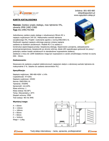 Infolinia: 801-005-885 [email protected] www.egsystem-sklep.pl KARTA KATALOGOWA Nazwa: Zasilacz prądu stałego, max tętnienie 5%, otwarte IP00 24RC-C400 Typ: EG-24RC75C400 Jednofazowy zasilacz prądu stałego z wbudowanym filtrem RC o napięciu wyjściowym 24V DC. Maksymalna wartość tętnienia szczątkowego 5%. Projekt i wykonanie zgodne z normą EN61558-2-6. Możliwość regulacji napięcia wtórnego poprzez zmianę napięcia zasilania na kostkach zaciskowych. Modele RC-C to zasilacz o konstrukcji zapewniającej prostą i bezpieczną obsługę. Separowane uzwojenia, zabezpieczenie przeciwprzeciążeniowe, bezpiecznik po stronie wtórnej, dioda LED sygnalizująca gotowość do pracy i podwójny zestaw kostek zaciskowych to standardowe wyposażenie zasilaczy. Zasilacze o mocy do 120W dodatkowo mogą być wyposażone w zacisk umożliwiający montaż na szynę DIN - 35mm. Zastosowanie: Stosowane do zasilania urządzeń elektronicznych napięciem stałym o obniżonej wartości tętnienia do maksymalnie 5 %. Idealne do zasilania sterowników PLC. Specyfikacja: Napięcie wejściowe: 380-400-420V +/-6% Częstotliwość: 47-63Hz Napięcie wyjściowe: 24VDC Norma: EN61558-2-6 Tętnienie: 5%RMS Sprawność: min.64% Klasa ochrony: 1 Klasa izolacji: B(130°) Temp. Otoczenia(ta): 25°C Stopień ochrony: IP00 Test izolacji: 4kV AC RMS Wymiary/waga: A = 65mm B = 110mm C = 100mm E = 95mm F = 50mm G = 5x9mm Waga = 1,6kg Twój sklep internetowy – tanio, sprawnie, profesjonalnie! Infolinia: 801-005-885 [email protected] www.egsystem-sklep.pl Układ połączeń: Program standardowy: Napięcie SEC DC: 24V Prąd SEC DC: 3,1A Moc: 75W Bezpiecznik: 5,0A – sec. Twój sklep internetowy – tanio, sprawnie, profesjonalnie!