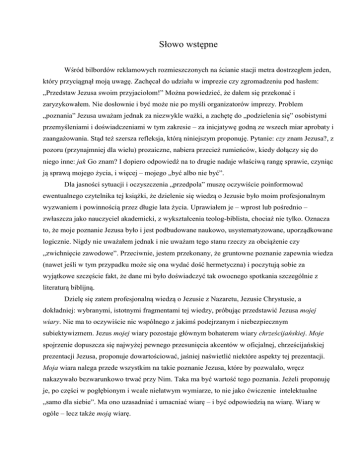 Słowo wstępne Wśród bilbordów reklamowych rozmieszczonych na ścianie stacji metra dostrzegłem jeden, który przyciągnął moją uwagę. Zachęcał do udziału w imprezie czy zgromadzeniu pod hasłem: „Przedstaw Jezusa swoim przyjaciołom!” Można powiedzieć, że dałem się przekonać i zaryzykowałem. Nie dosłownie i być może nie po myśli organizatorów imprezy. Problem „poznania” Jezusa uważam jednak za niezwykle ważki, a zachętę do „podzielenia się” osobistymi przemyśleniami i doświadczeniami w tym zakresie – za inicjatywę godną ze wszech miar aprobaty i zaangażowania. Stąd też szersza refleksja, którą niniejszym proponuję. Pytanie: czy znam Jezusa?, z pozoru (przynajmniej dla wielu) prozaiczne, nabiera przecież rumieńców, kiedy dołączy się do niego inne: jak Go znam? I dopiero odpowiedź na to drugie nadaje właściwą rangę sprawie, czyniąc ją sprawą mojego życia, i więcej – mojego „być albo nie być”. Dla jasności sytuacji i oczyszczenia „przedpola” muszę oczywiście poinformować ewentualnego czytelnika tej książki, że dzielenie się wiedzą o Jezusie było moim profesjonalnym wyzwaniem i powinnością przez długie lata życia. Uprawiałem je – wprost lub pośrednio – zwłaszcza jako nauczyciel akademicki, z wykształcenia teolog-biblista, chociaż nie tylko. Oznacza to, że moje poznanie Jezusa było i jest podbudowane naukowo, usystematyzowane, uporządkowane logicznie. Nigdy nie uważałem jednak i nie uważam tego stanu rzeczy za obciążenie czy „zwichnięcie zawodowe”. Przeciwnie, jestem przekonany, że gruntowne poznanie zapewnia wiedza (nawet jeśli w tym przypadku może się ona wydać dość hermetyczna) i poczytują sobie za wyjątkowe szczęście fakt, że dane mi było doświadczyć tak owocnego spotkania szczególnie z literaturą biblijną. Dzielę się zatem profesjonalną wiedzą o Jezusie z Nazaretu, Jezusie Chrystusie, a dokładniej: wybranymi, istotnymi fragmentami tej wiedzy, próbując przedstawić Jezusa mojej wiary. Nie ma to oczywiście nic wspólnego z jakimś podejrzanym i niebezpiecznym subiektywizmem. Jezus mojej wiary pozostaje głównym bohaterem wiary chrześcijańskiej. Moje spojrzenie dopuszcza się najwyżej pewnego przesunięcia akcentów w oficjalnej, chrześcijańskiej prezentacji Jezusa, proponuje dowartościować, jaśniej naświetlić niektóre aspekty tej prezentacji. Moja wiara nalega przede wszystkim na takie poznanie Jezusa, które by pozwalało, wręcz nakazywało bezwarunkowo trwać przy Nim. Taka ma być wartość tego poznania. Jeżeli proponuję je, po części w pogłębionym i wcale niełatwym wymiarze, to nie jako ćwiczenie intelektualne „samo dla siebie”. Ma ono uzasadniać i umacniać wiarę – i być odpowiedzią na wiarę. Wiarę w ogóle – lecz także moją wiarę.