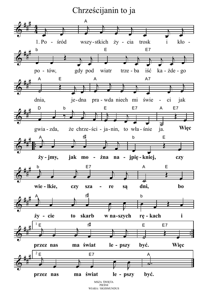 Chrześcijanin to ja ## 4 & # 4 œj & & & ### ### ### 1. Po - śród b œ po - tów, A je- dna # # # . Aj .œ œ & & ży - jmy, œ wie - lkie, # # # Aj œ & & & ### ### j j œ œj œj œj œj œ œ wiatr trze - ba iść ka - żde - go œ j œ œ 1E przez nas 2E œ przez nas j j œ œ A7 pra - wda niech mi świe j f œ œ j œ œj # - ci A œ Œ ˙ czy œ sza f# œ to skarb j œ f # œ ma świat j œ j œ E7 E œ E7 œ ma świat - j œ Œ œ A œ Œ ˙ są dni, œ J œ J b œ le - pszy być. le - pszy MSZA ŚWIĘTA PIEŚNI WIARA / SIGISMUNDUS Œ œ rę - kach E œ J œ bo œ j j œ œ œ J czy E re w na-szych œ Więc ja. b jak E7 jak mo - żna na - jpię - kniej, j œ kło - E7 że chrze -ści - ja- nin, to wła - śnie j œ ży - cie j œ i b œ j œ trosk E E7 j j j j œ ‰ œ œ œ œ œ œj œ D b j j œ œ j œ j œ œ A Œ gwia - zda, ### j œ j j œj œj œj j œ œ œ œ E dnia, E gdy pod ˙ j œ wszy -stkich ży - cia Œ œ j œ j œ A j œ i E7 Œ ˙ A ˙. być. œ Więc .. & ### j œ j œ 2. Wie - lka 3. Mo - że, & & & ### ### ### b œ le - stwa wie - kiem, A trwa. dnia, D # # # . Aj .œ œ & & ży - jmy, j œ b œ & & ### ### œ ży - cie j œ 1 E œ przez nas j œ j œ j œ - wę Kró brym czło - E7 j j j j œ œ œ œ j œ w ka - żdym z nas na za - wsze le - pszym być ka - żde - go j œj j j œ œ œ œ A j j œ œ A7 E j j j ‰ œ œ œ j œ œ 2 E œ przez nas E7 A j œ œ œ j f œ œ j œ œj # E7 Œ ˙ bo chrze - ści - ja- nin, to wła - śnie bo chrze - ści - ja- nin, to wła - śnie ja. ja. b czy j œ j œ E7 E œ œ sza f# œ to skarb j œ f# œ ma świat j œ E7 œ ma świat - j œ Œ œ A œ Œ ˙ są dni, œ J œ J b œ le - pszy być. le - pszy MSZA ŚWIĘTA PIEŚNI WIARA / SIGISMUNDUS Œ œ rę - kach E œ J œ bo œ j j œ œ œ J czy E re w na-szych œ Więc jak mo - żna na - jpię - kniej, j œ wie - lkie, # # # Aj œ & j œ œ b ro - snąć, ba - czy, ### j j œ œ œ I prze - ze mnie ta - kże Ko - ściół ma Pa - na Bo - ga ktoś prze - ze mnie zo - œ œ E j j œ œ Œ j œ o bu - do bę - dę do nie - chaj więc któ - ry chce E ˙ j œ tro - ska je - śli Œ œ j œ j œ A i E7 Œ ˙ œ .. Więc A ˙. być. Chrześcijanin to ja 2.