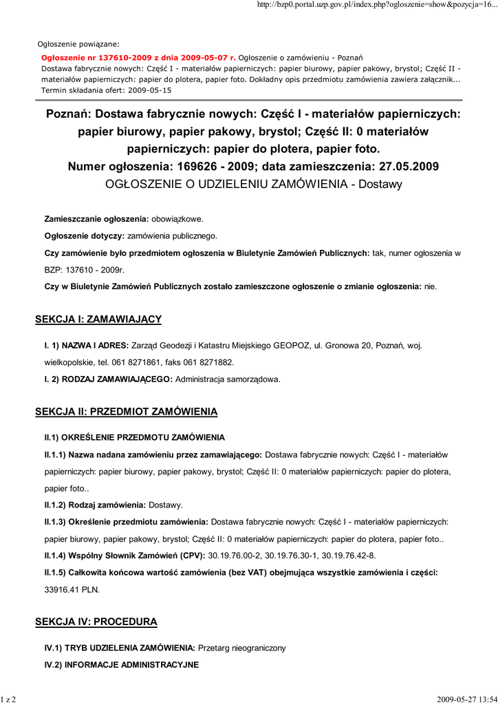 1z2 http://bzp0.portal.uzp.gov.pl/index.php?ogloszenie=show&pozycja=16... Ogłoszenie powiązane: Ogłoszenie nr 137610-2009 z dnia 2009-05-07 r. Ogłoszenie o zamówieniu - Poznań Dostawa fabrycznie nowych: Część I - materiałów papierniczych: papier biurowy, papier pakowy, brystol; Część II materiałów papierniczych: papier do plotera, papier foto. Dokładny opis przedmiotu zamówienia zawiera załącznik... Termin składania ofert: 2009-05-15 Poznań: Dostawa fabrycznie nowych: Część I - materiałów papierniczych: papier biurowy, papier pakowy, brystol; Część II: 0 materiałów papierniczych: papier do plotera, papier foto. Numer ogłoszenia: 169626 - 2009; data zamieszczenia: 27.05.2009 OGŁOSZENIE O UDZIELENIU ZAMÓWIENIA - Dostawy Zamieszczanie ogłoszenia: obowiązkowe. Ogłoszenie dotyczy: zamówienia publicznego. Czy zamówienie było przedmiotem ogłoszenia w Biuletynie Zamówień Publicznych: tak, numer ogłoszenia w BZP: 137610 - 2009r. Czy w Biuletynie Zamówień Publicznych zostało zamieszczone ogłoszenie o zmianie ogłoszenia: nie. SEKCJA I: ZAMAWIAJĄCY I. 1) NAZWA I ADRES: Zarząd Geodezji i Katastru Miejskiego GEOPOZ, ul. Gronowa 20, Poznań, woj. wielkopolskie, tel. 061 8271861, faks 061 8271882. I. 2) RODZAJ ZAMAWIAJĄCEGO: Administracja samorządowa. SEKCJA II: PRZEDMIOT ZAMÓWIENIA II.1) OKREŚLENIE PRZEDMOTU ZAMÓWIENIA II.1.1) Nazwa nadana zamówieniu przez zamawiającego: Dostawa fabrycznie nowych: Część I - materiałów papierniczych: papier biurowy, papier pakowy, brystol; Część II: 0 materiałów papierniczych: papier do plotera, papier foto.. II.1.2) Rodzaj zamówienia: Dostawy. II.1.3) Określenie przedmiotu zamówienia: Dostawa fabrycznie nowych: Część I - materiałów papierniczych: papier biurowy, papier pakowy, brystol; Część II: 0 materiałów papierniczych: papier do plotera, papier foto.. II.1.4) Wspólny Słownik Zamówień (CPV): 30.19.76.00-2, 30.19.76.30-1, 30.19.76.42-8. II.1.5) Całkowita końcowa wartość zamówienia (bez VAT) obejmująca wszystkie zamówienia i części: 33916.41 PLN. SEKCJA IV: PROCEDURA IV.1) TRYB UDZIELENIA ZAMÓWIENIA: Przetarg nieograniczony IV.2) INFORMACJE ADMINISTRACYJNE 2009-05-27 13:54 2z2 http://bzp0.portal.uzp.gov.pl/index.php?ogloszenie=show&pozycja=16... Zamówienie dotyczy projektu/programu finansowanego ze środków Unii Europejskiej: nie SEKCJA V: UDZIELENIE ZAMÓWIENIA Część NR: 1 Nazwa: Dostawa fabrycznie nowych: Część I - materiałów papierniczych: papier biurowy, papier pakowy, brystol; V.1) DATA UDZIELENIA ZAMÓWIENIA: 26.05.2009. V.2) LICZBA OTRZYMANYCH OFERT: 3. V.3) NAZWA I ADRES WYKONAWCY, KTÓREMU UDZIELONO ZAMÓWIENIA: JTP Grocholewski J. Datkiewicz T. sp. j., ul. MArcelińska 71, 60-201 Poznań, kraj/woj. wielkopolskie. V.4) INFORMACJA O CENIE WYBRANEJ OFERTY ORAZ O NIE PODLEGAJĄCYCH ODRZUCENIU OFERTACH Z NAJNIśSZĄ I NAJWYśSZĄ CENĄ (bez VAT) Cena wybranej oferty: 33916.41 Oferta z najniŜszą ceną: 33916.41 oferta z najwyŜszą ceną: 37751.07 Waluta: PLN. 2009-05-27 13:54