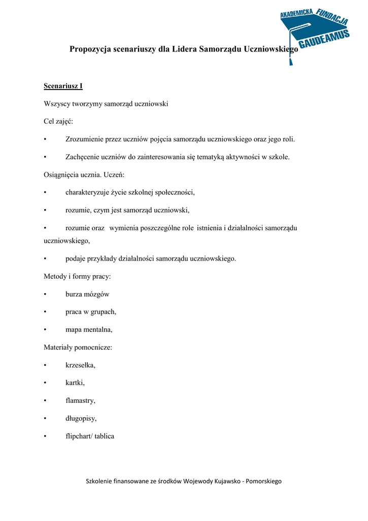 Propozycja scenariuszy dla Lidera Samorządu Uczniowskiego Scenariusz I Wszyscy tworzymy samorząd uczniowski Cel zajęć: • Zrozumienie przez uczniów pojęcia samorządu uczniowskiego oraz jego roli. • Zachęcenie uczniów do zainteresowania się tematyką aktywności w szkole. Osiągnięcia ucznia. Uczeń: • charakteryzuje życie szkolnej społeczności, • rozumie, czym jest samorząd uczniowski, • rozumie oraz wymienia poszczególne role istnienia i działalności samorządu uczniowskiego, • podaje przykłady działalności samorządu uczniowskiego. Metody i formy pracy: • burza mózgów • praca w grupach, • mapa mentalna, Materiały pomocnicze: • krzesełka, • kartki, • flamastry, • długopisy, • flipchart/ tablica Szkolenie finansowane ze środków Wojewody Kujawsko - Pomorskiego Przebieg zajęć: I Faza wstępna – 10 minut Przywitaj się z uczestnikami zajęć i zapisz na środku tablicy słowo: samorządzenie. Oddziel kreską człon ,,samo’’ od ,,rządzenie’’. Zaproś ich do wspólnego zastanowienia się, z czym kojarzy im się słowo ,,rządzenie’’. Swoje pomysły niech wpisują wokół hasła. Warto dopilnować, aby padło jak najwięcej skojarzeń. II Faza realizacyjna – czas: 20 minut • Zapytaj uczestników, czy w ich szkole istnieje i działa samorząd uczniowski. Jeżeli tak, to poproś, aby wyjaśnili, czym on jest i jakimi sprawami się zajmuje. Możliwe, że uczestnicy jako samorząd uczniowski znają jego rangę. Zawsze jednak warto dodać, że zgodnie z prawem samorządem uczniowskim są wszyscy uczniowie w szkole. Podkreśl, że wszyscy uczniowie mają prawo do wpływania na to, co się dzieje w ich otoczeniu szkolnym. • Korzystając z notatek zapisanych na tablicy zapytaj uczniów, czy wiedzą, kto rządzi w szkole? Wspólnie omów pojęcia: władza, podejmowanie decyzji, lider i jego cechy. Jeżeli uczestnicy nie będą mieli mieli pomysłu, zapisz na hasła np.: dyrekcja, nauczyciele, uczniowie. Podziel uczniów na trzy grupy i poproś, aby wspólnie zastanowili się w grupach, jak te osoby wpływają na szkołę i jak w niej rządzą. • Poproś, aby przedstawiciel każdej grupy zaprezentował wyniki dyskusji. Zapytaj się, w jaki sposób i w jakich kwestiach chcieliby, aby organy samorządu uczniowskiego reprezentowały interesy uczniów. III Faza podsumowująca - czas: 15 minut • Zapytaj się, co według nich należy w szkole zrobić, żeby samorząd uczniowski rzeczywiście współrządził? Zapiszcie pomysły w jednym dokumencie i jego kopie przekażcie do reprezentacji samorządu uczniowskiego oraz do dyrekcji jako pomysły do ulepszania pracy SU. opracował: dr Maciej Jabłoński Szkolenie finansowane ze środków Wojewody Kujawsko - Pomorskiego Scenariusz II Rządzenie, wpływ? Czym jest samorząd uczniowski? Cel zajęć: • Zrozumienie przez uczniów pojęcia samorządu uczniowskiego oraz jego roli. • Zachęcenie uczniów do zainteresowania się tematyką aktywności w szkole. Osiągnięcia uczniów: • rozumie, czym jest samorząd uczniowski • rozumie oraz wymienia poszczególne role istnienia i działalności samorządu uczniowskiego • podaje przykłady działalności samorządu uczniowskiego. Metody i formy pracy: • Burza mózgów, • praca w grupach, • mapa mentalna, • gra w skojarzenia. Materiały pomocnicze: • piłka, • kolorowe kartki, • flamastry, długopisy, • flipchart, • narysowana mapka szkoły (3 egzemplarze). Szkolenie finansowane ze środków Wojewody Kujawsko - Pomorskiego Przebieg zajęć Faza wprowadzająca – od 5 do 10 minut Przywitaj uczestników i zaproś ich do ustawienia się w kółku. Poproś, aby rzucali do siebie piłkę. Osoba, która złapie piłkę musi podać swoje skojarzenie ze słowem, które powiedział jego poprzednik. Rozpocznij grę, rzucając piłkę do wybranego ucznia i mówiąc: władza. Pozostaw dzieci w kółku i zapisuj na flipcharcie ich skojarzenia, tworząc mapę myśli. W wypadku, gdy uczestnicy nie będą miały pomysłu na dalsze skojarzenia albo ich skojarzenia zaczną być zupełnie nie związane z tematem zajęć, włączaj się do zabawy. Warto dopilnować, aby padło jak najwięcej słów związanych z władzą, rządzeniem. I Faza realizacyjna – czas: 25 minut • Korzystając z notatek zapisanych na tablicy zapytaj, czy wiedzą, kto rządzi w szkole? Jeżeli nie będą mieli pomysłu, zapisz na flipcharcie hasła: dyrekcja, nauczyciele, uczniowie. Podziel uczniów na trzy grupy i poproś, aby wspólnie zastanowili się w grupach, jak te osoby wpływają na szkołę i jak w niej rządzą. Zapytaj uczniów, czy w ich szkole istnieje i działa samorząd uczniowski. Jeżeli tak, to poproś, aby wyjaśnili, czym on jest i jakimi sprawami się zajmuje. • Podziel uczniów na trzy grupy. Każda z nich dostaje narysowaną mapkę szkoły, na której wyszczególnione są sale lekcyjne, pokój nauczycielski, gabinet dyrekcji, korytarz z tablicami na ścianach itp. Każda z grup sugerując się mapką, ma za zadanie opisać, co może zrobić samorząd uczniowski, żeby te miejsca lepiej służyły uczniom? Z kim może współpracować, w jaki sposób, aby osiągnąć swój cel? Poproś każdą z grup o przestawienie swoich pomysłów. II Faza podsumowująca - czas: 10 minut • Zachęć uczniów, aby powtórzyli, czym może zajmować się samorząd uczniowski w szkole. Podkreśl, że uczniowie mogą mieć realny wpływ, na to, co dzieje się w ich szkole. Poproś, aby w domu samodzielnie przygotowali listę rzeczy, które by chcieli zmienić w szkole albo wprowadzić. W jaki sposób mogliby to osiągnąć i z kim powinni współpracować, aby odnieść sukces? Rozdaj im przygotowane przykładowe zadania wraz z opisem. Wersja alternatywna: Poproś uczniów, aby na następne zajęcia dopracowali mapkę szkoły. Podziękuj za udział w lekcji. Szkolenie finansowane ze środków Wojewody Kujawsko - Pomorskiego opracował: dr Maciej Jab