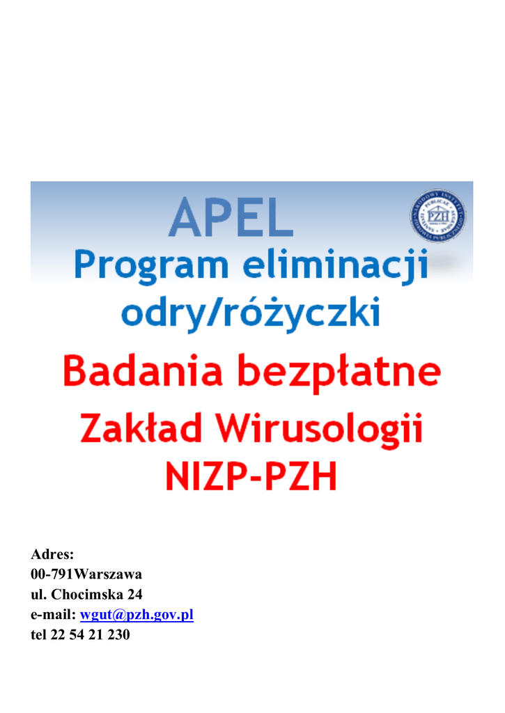 Adres: 00-791Warszawa ul. Chocimska 24 e-mail: [email protected] tel 22 54 21 230 Szczegółowe dane o materiałach i warunkach transportu na stronie internetowej NIZP-PZH: http://www.pzh.gov.pl/program-who-eliminacji-odryrozyczki/
