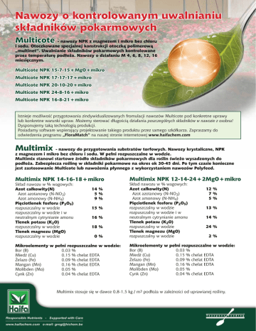 Nawozy o kontrolowanym uwalnianiu składników pokarmowych Multicote - nawozy NPK z magnezem i mikro bez chloru i sodu. Otoczkowane specjalnej konstrukcji otoczką polimerową „multinet”. Uwalnianie składników pokarmowych kontrolowane przez temperaturę podłoża. Nawozy o działaniu M 4, 6, 8, 12, 16 miesięcznym. Multicote NPK 15-7-15+MgO+mikro Multicote NPK 17-17-17+mikro Multicote NPK 20-10-20+mikro Multicote NPK 24-8-16+mikro Multicote NPK 16-8-21+mikro Istnieje możliwość przygotowania zindywidualizowanych fromulacji nawozów Multicote pod konkretne uprawy lub konkretne warunki upraw. Możemy sterować długością działania poszczególnych składników w nawozie z osobna! Dysponujemy taką technologią produkcji. Posiadamy software wspierający projektowanie takiego produktu przez samego szkółkarza. Zapraszamy do odwiedzenia programu „FloraMatch” na naszej stronie internetowej www.haifachem.com Multimix - nawozy do przygotowania substratów torfowych. Nawozy krystaliczne, NPK z magnezem i mikro bez chloru i sodu. W pełni rozpuszczalne w wodzie. Multimix stanowi startowe źródło składników pokarmowych dla roślin świeżo wysadzonych do podłoża. Zabezpiecza roślinę w składniki pokarmowe na okres ok 30-45 dni. Po tym czasie konieczne jest zastosowanie Multicote lub nawożenia płynnego z wykorzystaniem nawozów Polyfeed. Multimix NPK 14-16-18+mikro Skład nawozu w % wagowych: Azot całkowity(N) Azot azotanowy (N-NO3) Azot amonowy (N-NH4) Pięciotlenek fosforu (P2O5) rozpuszczalny w wodzie rozpuszczalny w wodzie i w neutralnym cytrynianie amonu Tlenek potasu (K2O) rozpuszczalny w wodzie Tlenek magnezu (MgO) rozpuszczalny w wodzie 14 % 5% 9% 15 % 16 % 18 % 0% Mikroelementy w pełni rozpuszczalne w wodzie: Bor (B) 0,03 % Miedź (Cu) 0,15 % chelat EDTA Żelazo (Fe) 0,09 % chelat EDTA Mangan (Mn) 0,16 % chelat EDTA Molibden (Mo) 0,05 % Cynk (Zn) 0,04 % chelat EDTA Multimix NPK 12-14-24+2MgO+mikro Skład nawozu w % wagowych: Azot całkowity(N) Azot azotanowy (N-NO3) Azot amonowy (N-NH4) Pięciotlenek fosforu (P2O5) rozpuszczalny w wodzie rozpuszczalny w wodzie i w neutralnym cytrynianie amonu Tlenek potasu (K2O) rozpuszczalny w wodzie Tlenek magnezu (MgO) rozpuszczalny w wodzie 12 % 7% 5% 13 % 14 % 24 % 2% Mikroelementy w pełni rozpuszczalne w wodzie: Bor (B) 0,03 % Miedź (Cu) 0,15 % chelat EDTA Żelazo (Fe) 0,09 % chelat EDTA Mangan (Mn) 0,16 % chelat EDTA Molibden (Mo) 0,05 % Cynk (Zn) 0,04 % chelat EDTA Multimix stosuje się w dawce 0,8-1,5 kg / m3 podłoża w zależności od uprawianej rośliny. Multicote – nawóz bardzo precyzyjny i bezpieczny dla roślin! Takie właściwości nawozu Multicote umożliwione są przez zastosowanie unikalnej otoczki „multinet” – membrany półprzepuszczalnej umożliwiającej dyfuzję składników pokarmowych do roztworu. Otoczka Granula Przekrój poprzeczny granuli nawozu Multicote widziany przez mikroskop elektronowy. Granula nawozu jest ściśle otoczona przez otoczkę będącą półprzepuszczalną membraną. Ścisłe przyleganie otoczki do nawozu zabezpiecza ją przed uszkodzeniami – zgniataniem w trakcie aplikacji nawozu do podłoża i jego mieszaniu i napełnianiu pojemników uprawowych. Multicote jest bardzo precyzyjnym i bezpiecznym nawozem! Otoczka Otoczka nawozu Multicote widziana przez mikroskop elektronowy. Unikalna budowa otoczki nawozu Multicote, umożliwiająca kontrolowaną przez temperaturę dyfuzję składników pokarmowych z nawozu na zewnątrz. Otoczka „multinet” składa się z wielu warstw „siatki” naniesionych na siebie, tak aby wielowarstwowa struktura membrany była szczelna dla swobodnego wypływu składników na zewnątrz, a umożliwiała jedynie dyfuzję. Multicote jest bardzo precyzyjnym i bezpiecznym nawozem! Rodzaje nawozów Multicote w ofercie: Dystrybutor: Zalecenia przedstawiane w tej broszurze mają charakter jedynie ogólny i poglądowy. Firma Hi-Chem N.V. ani autor tych zaleceń nie ponoszą żadnej odpowiedzialności za skutki ich stosowania w praktyce ogrodniczej Nawóz przyjazny korzeniom roślin. Składniki pokarmowe uwalniają się w sposób kontrolowany i są od razu pobierane przez korzenie roślin.
