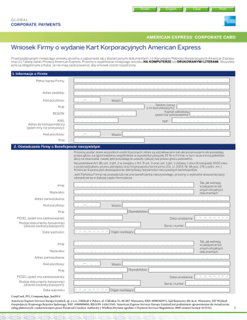 Polish English Clear Print AMERICAN EXPRESS® CORPORATE CARD Wniosek Firmy o wydanie Kart Korporacyjnych American Express Przed podpisaniem niniejszego wniosku prosimy o zapoznanie się z dostarczonymi dokumentami: (i) Warunkami Płatności Korporacyjnych American Express oraz (ii) Tabelą Opłat i Prowizji American Express. Prosimy o wypełnienie niniejszego wniosku NA KOMPUTERZE lub DRUKOWANYMI LITERAMI. Wszystkie pola są obligatoryjne (chyba, że nie mają zastosowania), aby wniosek został rozpatrzony. 1. Informacje o Firmie Pełna nazwa Firmy: Adres siedziby: — Kod pocztowy: Kraj: — Miasto: REGON: Telefon (wraz z nr kierunkowym): Kapitał zakładowy (jeżeli ma zastosowanie): KRS: Adres do korespondencji (jeżeli inny niż powyższy): — Kod pocztowy: NIP: Miasto: Kraj: 2. Oświadczenie Firmy o Beneficjencie rzeczywistym Prosimy podać dane wszystkich osób fizycznych, które są udziałowcami lub akcjonariuszami lub posiadają prawo głosu na zgromadzeniu wspólników w wysokości powyżej 25 % w Firmie, w tym za pomocą pakietów akcji na okaziciela, nawet jeśli posiadają te udziały (akcje) lub prawo głosu pośrednio. Na podstawie Art. 8b ust. 3 pkt. 2 w związku z Art. 9 ust. 3 oraz ust. 1 pkt. 1 Ustawy z dnia 16 listopada 2000 roku o przeciwdziałaniu praniu pieniędzy oraz finansowaniu terroryzmu (Dz. U. 2003, Nr 46 poz. 276 z późn. zm.) American Express jest obowiązana do identyfikacji tożsamości rzeczywistych beneficjentów. Jeśli Państwa Firma nie posiada lub nie zna beneficjenta rzeczywistego, prosimy o wybranie stosownej opcji oświadczenia w dalszej części formularza: Tak, jak widnieją w paszporcie lub innych oficjalnych dokumentach. Imię: Nazwisko: Adres zamieszkania: — Kod pocztowy: Miasto: Obywatelstwo: Kraj: Rodzaj dokumentu tożsamości (dowód osobisty/paszport): Data ważności: Data urodzenia: D D M M R R R R PESEL (jeżeli ma zastosowanie): Seria i numer: D D M M R R R R Organ wydający: Tak, jak widnieją w paszporcie lub innych oficjalnych dokumentach. Imię: Nazwisko: Adres zamieszkania: Kod pocztowy: — Miasto: Obywatelstwo: Kraj: PESEL (jeżeli ma zastosowanie): Rodzaj dokumentu tożsamości (dowód osobisty/paszport): Data ważności: Data urodzenia: D D M M R R R R Seria i numer: D D M M R R R R Organ wydający: CorpCard_PO_CompanyApp_Jan2014 American Express Services Europe Limited, sp. z o.o., Oddział w Polsce, ul. Chłodna 51, 00-867 Warszawa, KRS: 0000366972, Sąd Rejonowy dla m.st. Warszawy, XII Wydział Gospodarczy Krajowego Rejestru Sądowego, NIP: 1080009600, REGON 142613563. American Express Services Europe Limited jest podmiotem uprawnionym do świadczenia usług płatniczych i nadzorowanym przez Financial Conduct Authority z Wielkiej Brytanii zgodnie z Payment Services Regulations 2009 (numer licencji 415532). 1 AMERICAN EXPRESS® CORPORATE CARD Tak, jak widnieją w paszporcie lub innych oficjalnych dokumentach. Imię: Nazwisko: Adres zamieszkania: — Kod pocztowy: Miasto: Obywatelstwo: Kraj: Data ważności: Data urodzenia: D D M M R R R R PESEL (jeżeli ma zastosowanie): Rodzaj dokumentu tożsamości (dowód osobisty/paszport): Seria i numer: D D M M R R R R Organ wydający: Oświadczam, iż Firma nie posiada beneficjenta rzeczywistego. Oświadczam, iż Firma nie zna beneficjenta rzeczywistego. Oświadczam, iż Firma jest podmiotem świadczącym usługi finansowe lub jej papiery wartościowe, albo papiery wartościowe podmiotu kontrolującego ponad 75% udziałów w Firmie, są dopuszczone do publicznego obrotu na rynku regulowanym w Unii Europejskiej lub w państwie równoważnym. 3. Dodatkowe informacje o Rachunku Karty Produkt 1: Sposób rozliczania (należy wybrać jedną z trzech opcji): Karta Korporacyjna Złota Karta Korporacyjna Indywidualne zestawienie i indywidualne rozliczanie wydatków Indywidualne zestawienie i centralne rozliczanie wydatków Centralne zestawienie i centralne rozliczanie wydatków Cykl rozliczeniowy: Rodzaj odpowiedzialności Usługa „Polecenie Zapłaty”(prosimy wypełnić tylko w przypadku rozliczania centralnego): Produkt 2: Sposób rozliczania (należy wybrać jedną z trzech opcji): 3 5 8 15 Odpowiedzialność Wspólna 25 28 Pełna Odpowiedzialność Korporacyjna Tak Nie W przypadku wybrania odpowiedzi TAK prosimy o wypełnienie formularza „Polecenie Zapłaty”. Karta Korporacyjna Złota Karta Korporacyjna Indywidualne zestawienie i indywidualne rozliczanie wydatków Indywidualne zestawienie i centralne rozliczanie wydatków Centralne zestawienie i centralne rozliczanie wydatków Cykl rozliczeniowy: Rodzaj odpowiedzialności Usługa „Polecenie Zapłaty”(prosimy wypełnić tylko w przypadku rozliczania centralnego): 3 5 8 15 Odpowiedzialność Wspólna 25 28 Pełna Odpowiedzialność Korporacyjna Tak Nie W przypadku wybrania odpowiedzi TAK prosimy o wypełnienie formularza „Polecenie Zapłaty”. Wypełnia American Express: Produkt 1: Opłata roczna: (PLN) Limit produktu: (PLN) Produkt 2: Opłata roczna: (PLN) Limit produktu: (PLN) Limit globalny (dot. wszystkich produktów dla Firmy): (PLN) CorpCard_PO_CompanyApp_Jan2014 American Express Services Europe Limited, sp. z o.o., Oddział w Polsce, ul. Chłodna 51, 00-867 Warszawa, KRS: 0000366972, Sąd Rejonowy dla m.st. Warszawy, XII Wydział Gospodarczy Krajowego Rejestru Sądowego, NIP: 1080009600, REGON 142613563. American Express Services Europe Limited jest podmiotem uprawnionym do świadczenia usług płatniczych i nadzorowanym przez Financial Conduct Authority z Wielkiej Brytanii zgodnie z Payment Services Regulations 2009 (numer licencji 415532). 2 AMERICAN EXPRESS® CORPORATE CARD 4. Oświadczenia Na podstawie art. 105 ust. 4a i 4a1 ustawy z dnia 29 sierpnia 1997r. Prawo bankowe (t.j., Dz.U. z 2002, Nr 72, poz. 665 z późn. zm.) w związku z art. 13 ustawy z dnia 9 kwietnia 2010 r. o udostępnianiu informacji gospodarczych i wymianie danych gospodarczych (Dz.U. z 2010, Nr 81, poz. 530 z późn. zm.) upoważniam ninie