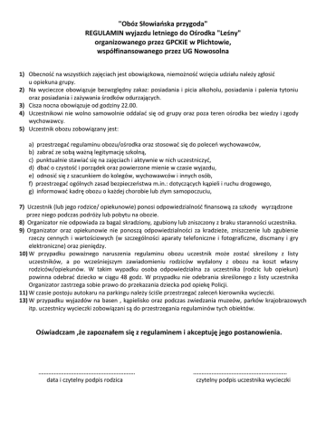 "Obóz Słowiańska przygoda" REGULAMIN wyjazdu letniego do Ośrodka "Leśny" organizowanego przez GPCKiE w Plichtowie, współfinansowanego przez UG Nowosolna 1) Obecność na wszystkich zajęciach jest obowiązkowa, niemożność wzięcia udziału należy zgłosić u opiekuna grupy. 2) Na wycieczce obowiązuje bezwzględny zakaz: posiadania i picia alkoholu, posiadania i palenia tytoniu oraz posiadania i zażywania środków odurzających. 3) Cisza nocna obowiązuje od godziny 22.00. 4) Uczestnikowi nie wolno samowolnie oddalać się od grupy oraz poza teren ośrodka bez wiedzy i zgody wychowawcy. 5) Uczestnik obozu zobowiązany jest: a) przestrzegać regulaminu obozu/ośrodka oraz stosować się do poleceń wychowawców, b) zabrać ze sobą ważną legitymację szkolną, c) punktualnie stawiać się na zajęciach i aktywnie w nich uczestniczyć, d) dbać o czystość i porządek oraz powierzone mienie w czasie wyjazdu, e) odnosić się z szacunkiem do kolegów, wychowawców i innych osób, f) przestrzegać ogólnych zasad bezpieczeństwa m.in.: dotyczących kąpieli i ruchu drogowego, g) informować kadrę obozu o każdej chorobie lub złym samopoczuciu, 7) Uczestnik (lub jego rodzice/ opiekunowie) ponosi odpowiedzialność finansową za szkody wyrządzone przez niego podczas podróży lub pobytu na obozie. 8) Organizator nie odpowiada za bagaż skradziony, zgubiony lub zniszczony z braku staranności uczestnika. 9) Organizator oraz opiekunowie nie ponoszą odpowiedzialności za kradzieże, zniszczenie lub zgubienie rzeczy cennych i wartościowych (w szczególności aparaty telefoniczne i fotograficzne, discmany i gry elektroniczne) oraz pieniędzy. 10) W przypadku poważnego naruszenia regulaminu obozu uczestnik może zostać skreślony z listy uczestników, a po wcześniejszym zawiadomieniu rodziców wydalony z obozu na koszt własny rodziców/opiekunów. W takim wypadku osoba odpowiedzialna za uczestnika (rodzic lub opiekun) powinna odebrać dziecko w ciągu 48 godz. W przypadku nie odebrania skreślonego z listy uczestnika Organizator zastrzega sobie prawo do przekazania dziecka pod opiekę Policji. 11) W czasie postoju autokaru na parkingu należy ściśle przestrzegać zaleceń kierownika wycieczki. 13) W przypadku wyjazdów na basen , kąpielisko oraz podczas zwiedzania muzeów, parków krajobrazowych itp. uczestnicy wycieczki zobowiązani są do przestrzegania regulaminów tych obiektów. Oświadczam ,że zapoznałem się z regulaminem i akceptuję jego postanowienia. .................................................................... data i czytelny podpis rodzica .................................................................. czytelny podpis uczestnika wycieczki