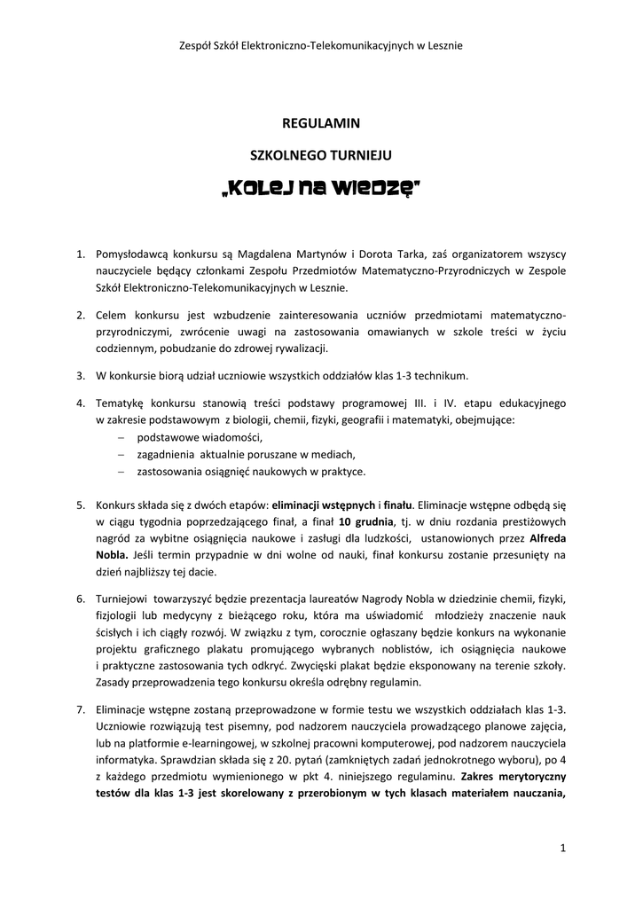 Zespół Szkół Elektroniczno-Telekomunikacyjnych w Lesznie REGULAMIN SZKOLNEGO TURNIEJU „KOLEJ NA WIEDZĘ” 1. Pomysłodawcą konkursu są Magdalena Martynów i Dorota Tarka, zaś organizatorem wszyscy nauczyciele będący członkami Zespołu Przedmiotów Matematyczno-Przyrodniczych w Zespole Szkół Elektroniczno-Telekomunikacyjnych w Lesznie. 2. Celem konkursu jest wzbudzenie zainteresowania uczniów przedmiotami matematycznoprzyrodniczymi, zwrócenie uwagi na zastosowania omawianych w szkole treści w życiu codziennym, pobudzanie do zdrowej rywalizacji. 3. W konkursie biorą udział uczniowie wszystkich oddziałów klas 1-3 technikum. 4. Tematykę konkursu stanowią treści podstawy programowej III. i IV. etapu edukacyjnego w zakresie podstawowym z biologii, chemii, fizyki, geografii i matematyki, obejmujące: podstawowe wiadomości, zagadnienia aktualnie poruszane w mediach, zastosowania osiągnięć naukowych w praktyce. 5. Konkurs składa się z dwóch etapów: eliminacji wstępnych i finału. Eliminacje wstępne odbędą się w ciągu tygodnia poprzedzającego finał, a finał 10 grudnia, tj. w dniu rozdania prestiżowych nagród za wybitne osiągnięcia naukowe i zasługi dla ludzkości, ustanowionych przez Alfreda Nobla. Jeśli termin przypadnie w dni wolne od nauki, finał konkursu zostanie przesunięty na dzień najbliższy tej dacie. 6. Turniejowi towarzyszyć będzie prezentacja laureatów Nagrody Nobla w dziedzinie chemii, fizyki, fizjologii lub medycyny z bieżącego roku, która ma uświadomić młodzieży znaczenie nauk ścisłych i ich ciągły rozwój. W związku z tym, corocznie ogłaszany będzie konkurs na wykonanie projektu graficznego plakatu promującego wybranych noblistów, ich osiągnięcia naukowe i praktyczne zastosowania tych odkryć. Zwycięski plakat będzie eksponowany na terenie szkoły. Zasady przeprowadzenia tego konkursu określa odrębny regulamin. 7. Eliminacje wstępne zostaną przeprowadzone w formie testu we wszystkich oddziałach klas 1-3. Uczniowie rozwiązują test pisemny, pod nadzorem nauczyciela prowadzącego planowe zajęcia, lub na platformie e-learningowej, w szkolnej pracowni komputerowej, pod nadzorem nauczyciela informatyka. Sprawdzian składa się z 20. pytań (zamkniętych zadań jednokrotnego wyboru), po 4 z każdego przedmiotu wymienionego w pkt 4. niniejszego regulaminu. Zakres merytoryczny testów dla klas 1-3 jest skorelowany z przerobionym w tych klasach materiałem nauczania, 1 Zespół Szkół Elektroniczno-Telekomunikacyjnych w Lesznie zgodnym z obowiązującą nową podstawą programową kształcenia ogólnego – III i IV etap edukacyjny w zakresie podstawowym. 8. Do kolejnego etapu konkursu z każdego poziomu klas zostanie zakwalifikowanych 3. zawodników z największą liczbą punktów. Jeśli większa liczba uczniów (danego poziomu) zdobędzie jednakową liczbę punktów, to zostanie przeprowadzona dogrywka, w celu wyłonienia finalistów. W finale startuje łącznie 9 zawodników klas 1-3. 9. Niemożliwy jest udział w finale osób innych niż zakwalifikowane do tego etapu, nawet jeśli osoby te nie będą mogły w nim uczestniczyć z przyczyn losowych. 10. Finał odbędzie się przed publicznością składającą się z uczniów klas, których przedstawiciele biorą udział w konkursie. Klasy dopingując swoich kolegów, będą współzawodniczyć ze sobą o nagrodę: „Dzień bez pytania”. Zwycięska klasa ustali z dyrekcją szkoły termin jej realizacji. 11. Finał konkursu zostanie przeprowadzony na wzór teleturnieju „Jeden z dziesięciu”. I etap – rozpoczęcie gry Uczestnicy losują stanowisko i według ustalonej w ten sposób kolejności będą odpowiadać na pytania z puli pytań konkursowych, zadawanych przez prowadzącego. Zawodnik ma 5 sekund na udzielenie odpowiedzi. Każdy gracz dostanie trzy szanse. Każdemu graczowi prowadzący zadaje dwa pytania. Za jedną złą odpowiedź lub jej brak – zawodnik traci jedną szansę. W przypadku złej odpowiedzi prowadzący podaje poprawną. Dwa błędy eliminują uczestnika z gry. Ci, którzy odpowiedzieli na co najmniej jedno pytanie, przechodzą dalej. II etap W tym etapie każdy z grających ma tyle szans, ile wyniósł z I etapu. Gracze, po udzieleniu poprawnej odpowiedzi, wskazują zawodnika do następnego pytania. Prowadzący rozpoczyna zadawanie pytań od pierwszego w kolejności ucznia. Jeśli nie udzielił on dobrej odpowiedzi, traci jedną szansę, a prowadzący zadaje kolejno następne pytania kolejnym graczom tak długo, aż padnie poprawna odpowiedź. Jeżeli wskazany gracz nie odpowie poprawnie - traci jedną szansę, a wskazuje nadal gracz, który ostatni udzielił prawidłowej odpowiedzi. II etap trwa do chwili, kiedy pozostaje trzech zawodników. Zwycięzcy dostają po tyle punktów, ile szans zachowali po dwóch etapach (czyli maksymalnie mogą otrzymać trzy punkty). III etap – ścisły finał W ścisłym finale każdy zawodnik będzie odpowiadał na 10 losowo wybranych przez siebie pytań konkursowych. Za dobrą odpowiedź gracz dostaje 10 punktów. 2 Zespół Szkół Elektroniczno-Telekomunikacyjnych w Lesznie W wyniku finału zostanie przyznane I, II i III miejsce. W przypadku, gdy 2 lub 3 uczniów zdobędzie jednakową liczbę punktów, organizatorzy przeprowadzą dogrywkę w celu wyłonienia laureata I, II i III miejsca. 12. Finaliści konkursu otrzymają dyplomy. 13. Laureaci I, II i III miejsca otrzymają dyplomy i nagrody. 14. Ponadto laureat I miejsca, jako zwycięzca konkursu, otrzyma tytuł Mistrza Turnieju „KOLEJ NA WIEDZĘ” i nagrodę przechodnią – statuetkę konkursową. Statuetka przechodzi na własność ucznia, który w trzech kolejnych edycjach turnieju zostanie jego mistrzem. Organizatorzy zobowiązani są do stworzenia nowego trofeum. 15. Twórca zwycięskiego projektu graficznego plakatu dla Turnieju „KOLEJ NA WIEDZĘ” otrzyma dyplom i nagrodę. Najciekawsze projekty zostaną wyróżnione, a ich 