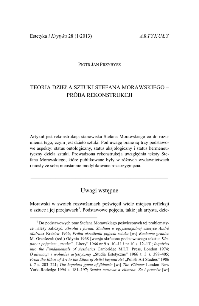 Estetyka i Krytyka 28 (1/2013) ARTYKUŁY PIOTR JAN PRZYBYSZ TEORIA DZIEŁA SZTUKI STEFANA MORAWSKIEGO – PRÓBA REKONSTRUKCJI Artykuł jest rekonstrukcją stanowiska Stefana Morawskiego co do rozumienia tego, czym jest dzieło sztuki. Pod uwagę brane są trzy podstawowe aspekty: status ontologiczny, status aksjologiczny i status hermeneutyczny dzieła sztuki. Prowadzona rekonstrukcja uwzględnia teksty Stefana Morawskiego, które publikowane były w różnych wydawnictwach i niosły ze sobą nieustannie modyfikowane rozstrzygnięcia. _______________________________________________________ Uwagi wstępne Morawski w swoich rozważaniach poświęcił wiele miejsca refleksji o sztuce i jej przejawach1. Podstawowe pojęcia, takie jak artysta, dzie1 Do podstawowych prac Stefana Morawskiego poświęconych tej problematyce należy zaliczyć: Absolut i forma. Studium o egzystencjalnej estetyce André Malraux Kraków 1966; Próba określenia pojęcia sztuka [w:] Ruchome granice M. Grześczak (red.) Gdynia 1968 [wersja skrócona podstawowego tekstu: Kłopoty z pojęciem „sztuka” „Litery” 1966 nr 9 s. 10–11 i nr 10 s. 12–13]; Inquiries into the Fundamentals of Aesthetics Cambridge M.I.T. Press, London 1974; O alienacji i wolności artystycznej „Studia Estetyczne” 1966 t. 3 s. 398–405; From the Ethos of Art to the Ethos of Artist beyond Art „Polish Art Studies” 1986 t. 7 s. 203–221; The hopeless game of flânerie [w:] The Flâneur London–New York–Rotledge 1994 s. 181–197; Sztuka masowa a elitarna. Za i przeciw [w:] 118 Piotr Jan Przybysz ______________________________________________________________________________________________________________________________________________________________________________________________________ ło sztuki, odbiorca, sformułował w latach sześćdziesiątych. W kolejnych dekadach porównywał zdefiniowane pojęcia z praktyką artystyczną, teorią i recepcją sztuki. Zgodnie z typologią przyjętą przez Morawskiego ze sztuką mieliśmy do czynienia do połowy lat pięćdziesiątych XX wieku, po tym okresie nastała epoka antysztuki – neoawangardy do początku lat osiemdziesiątych, a następnie po-sztuki – sztuki postmodernistycznej, która jest zjawiskiem nam współczesnym. Przedstawione cezury w trakcie formułowania stanowiska wobec rzeczywistości artystycznej podlegały modyfikacjom i korektom. Jednocześnie wyodrębnione w ten sposób etapy rozwoju fenomenu XX-wiecznej „sztuki” niosły w sobie elementy, które były ich zaprzeczeniem i podstawą do kolejnego rozwoju. Morawski poprzez kompetentną i erudycyjną krytykę „sztuki” XX wieku potrafił to w sposób niepowtarzalny wydobyć i uzasadnić, posługując się kontekstem historycznym, filozoficznym oraz kulturowym. W swojej metodologii poznawania tego, czym jest sztuka, wykorzystywał wiele współczesnych mu teorii, jednak podstawą coraz bardziej krystalizującego się stanowiska była metoda genetyczno-strukturalistyczna osadzona w obszarze hermeneutyki kulturowej. Dzieło sztuki Morawski, tworząc podstawy teorii dzieła sztuki, zmuszony był określić swoje stanowisko wobec wielu kwestii. Rozstrzygnięcia wymagała ontologia dzieła sztuki. Kluczowa kategoria w tej teorii – dzieło sztuki – wymagała sprecyzowanego sposobu rozumienia owego pojęPolska popularna kultura artystyczna materiały sesji „Polska popularna kultura artystyczna” Warszawa 1977 s. 91–119 [wersja skrócona: Sztuka masowa a elitarna. Za i przeciw „Kino” 1975 nr 8 s. 28–31]; Na zakręcie: od sztuki do posztuki Kraków 1985; The Artistic Avantgarde (On two 20th Century Formation) „The Polish Art Studies” 1989 t. 10 s. 79–107; Niewdzięczne rysowanie mapy... O postmodernie(izmie) i kryzysie kultury Toruń 1999; Action paiting w świetle świadomości mitycznej „Więź” 1984 nr 5 s. 125–128; Pop-art po trzydziestu latach „Acta Universitatis Lodziensis. Folia Scientiae Artium et Litterarum” 1990 z. 1 s. 189–224. Omawiana problematyka jest podejmowana miedzy innymi w pracach: P. J. Przybysz, A. Zeidler-Janiszewska Wstępny szkic do portretu [w:] S. Morawski Wybór pism estetycznych Kraków 2007 s. VII–LXIV; P. J. Przybysz Filozofia sztuki Stefana Morawskiego Gdańsk 2010. Teoria dzieła sztuki Stefana Morawskiego... 119 ______________________________________________________________________________________________________________________________________________________________________________________________________ cia. Poczynione w tej kwestii ustalenia wyznaczyły postawę i strategię badawczą. W teorii nie mogło zabraknąć sformułowania warunków niezbędnych, które musi spełnić przedmiot określany mianem dzieła sztuki. Należało ponadto rozstrzygnąć, czy przedmiot tej klasy dysponuje skończoną ilością cech charakterystycznych dla niego, czy też nie, oraz co stanowi kryterium wyodrębniające klasę przedmiotów określanych dziełami sztuki. Przy rozstrzyganiu kwestii pojawiła się konieczność charakterystyki wyodrębnionych w ten sposób kategorii. W celu dopełnienia swojej teorii Morawski określił zatem pojęcia: ekspresywnej struktury jakości zmysłowo danych, względnej autonomiczności, artefaktu i ekspresji indywidualnej. Podstawą rozważań o dziele sztuki było rozstrzygnięcie jego statusu ontologicznego: „niemniej dzieło sztuki tak samo jak stół i grządka kwiatów egzystuje jako przedmiot materialny w swoistym kontakcie z innymi, znacznie wyżej zorganizowanymi przedmiotami materialnymi, jakimi są odbiorcy”2. Morawski na samym wstępie rozstrzygnął więc o materialnym fundamencie dzieła sztuki. Istotną kwestią jest związek istniejący pomiędzy dziełem sztuki a przedmiotem estetycznym. Pojawiają się tutaj następujące wątpliwości: czy przedmiot estetyczny istnieje tak samo jak dzieło sztuki, czy dzieło sztuki jest jednym z przedmiotów estetycznych, czy dzieło sztuki i przedmiot estetyczny