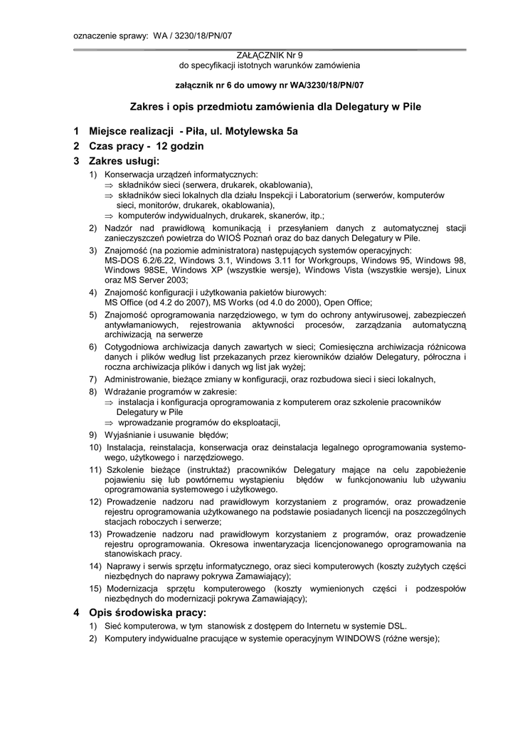 oznaczenie sprawy: WA / 3230/18/PN/07 ZAŁĄCZNIK Nr 9 do specyfikacji istotnych warunków zamówienia załącznik nr 6 do umowy nr WA/3230/18/PN/07 Zakres i opis przedmiotu zamówienia dla Delegatury w Pile 1 Miejsce realizacji - Piła, ul. Motylewska 5a 2 Czas pracy - 12 godzin 3 Zakres usługi: 1) Konserwacja urządzeń informatycznych: ⇒ składników sieci (serwera, drukarek, okablowania), ⇒ składników sieci lokalnych dla działu Inspekcji i Laboratorium (serwerów, komputerów sieci, monitorów, drukarek, okablowania), ⇒ komputerów indywidualnych, drukarek, skanerów, itp.; 2) Nadzór nad prawidłową komunikacją i przesyłaniem danych z automatycznej stacji zanieczyszczeń powietrza do WIOŚ Poznań oraz do baz danych Delegatury w Pile. 3) Znajomość (na poziomie administratora) następujących systemów operacyjnych: MS-DOS 6.2/6.22, Windows 3.1, Windows 3.11 for Workgroups, Windows 95, Windows 98, Windows 98SE, Windows XP (wszystkie wersje), Windows Vista (wszystkie wersje), Linux oraz MS Server 2003; 4) Znajomość konfiguracji i uŜytkowania pakietów biurowych: MS Office (od 4.2 do 2007), MS Works (od 4.0 do 2000), Open Office; 5) Znajomość oprogramowania narzędziowego, w tym do ochrony antywirusowej, zabezpieczeń antywłamaniowych, rejestrowania aktywności procesów, zarządzania automatyczną archiwizacją na serwerze 6) Cotygodniowa archiwizacja danych zawartych w sieci; Comiesięczna archiwizacja róŜnicowa danych i plików według list przekazanych przez kierowników działów Delegatury, półroczna i roczna archiwizacja plików i danych wg list jak wyŜej; 7) Administrowanie, bieŜące zmiany w konfiguracji, oraz rozbudowa sieci i sieci lokalnych, 8) WdraŜanie programów w zakresie: ⇒ instalacja i konfiguracja oprogramowania z komputerem oraz szkolenie pracowników Delegatury w Pile ⇒ wprowadzanie programów do eksploatacji, 9) Wyjaśnianie i usuwanie błędów; 10) Instalacja, reinstalacja, konserwacja oraz deinstalacja legalnego oprogramowania systemowego, uŜytkowego i narzędziowego. 11) Szkolenie bieŜące (instruktaŜ) pracowników Delegatury mające na celu zapobieŜenie pojawieniu się lub powtórnemu wystąpieniu błędów w funkcjonowaniu lub uŜywaniu oprogramowania systemowego i uŜytkowego. 12) Prowadzenie nadzoru nad prawidłowym korzystaniem z programów, oraz prowadzenie rejestru oprogramowania uŜytkowanego na podstawie posiadanych licencji na poszczególnych stacjach roboczych i serwerze; 13) Prowadzenie nadzoru nad prawidłowym korzystaniem z programów, oraz prowadzenie rejestru oprogramowania. Okresowa inwentaryzacja licencjonowanego oprogramowania na stanowiskach pracy. 14) Naprawy i serwis sprzętu informatycznego, oraz sieci komputerowych (koszty zuŜytych części niezbędnych do naprawy pokrywa Zamawiający); 15) Modernizacja sprzętu komputerowego (koszty wymienionych części i podzespołów niezbędnych do modernizacji pokrywa Zamawiający); 4 Opis środowiska pracy: 1) Sieć komputerowa, w tym stanowisk z dostępem do Internetu w systemie DSL. 2) Komputery indywidualne pracujące w systemie operacyjnym WINDOWS (róŜne wersje); oznaczenie sprawy: WA / 3230/18/PN/07 3) Programy komputerowe: Programy komputerowe: pakiety biurowe, oprogramowanie zabezpieczające (antywirusowe, antywłamaniowe itp.), programy do nadzoru i zarządzania typu LABO-2000, programy do obsługi prawnej typu LEX/Lex Polonica, inne programy specjalistyczne, jak np. program KARY (naliczanie kar pienięŜnych), bazy danych o środowisku, docelowo takŜe program do zarządzania obiegiem dokumentów w urzędzie oraz inne programy specjalistyczne. 5 Opis sprzętu objętego usługą: 1) Sieć składająca się z okablowania i serwera; 2) Komputery (róŜne typy i konfiguracje) monitory, pracujące jako indywidualne oraz w sieci; 3) Drukarki i monitory (róŜne typy), skanery, nagrywarki, zasilacze UPS, routery, switche itp. 6 Terminy i czas wykonania usługi: 1) Administrowanie i konserwacja minimum 12 (dwanaście) godzin tygodniowo w dni 00 00 robocze w godzinach od 8 do 14 (szczegółowe terminy do uzgodnienia). Udokumentowanie wykonanej pracy w dziale Obsługi. 2) Czas reakcji – nie więcej niŜ 1 (jedna) godzina od momentu otrzymania zgłoszenia przez telefon, telefon komórkowy, sms, bądź pocztą elektroniczną (w przypadku konieczności przesłania szczegółowych informacji jako uzupełnienia zgłoszenia przekazanego uprzednio jedną z metod łączności telefonicznej. W sytuacji bardzo pilnej zagraŜającej znaczną awarią sprzętu bądź utratą istotnych danych – niezwłoczne udzielanie przez telefon (w sposób prosty i komunikatywny) instrukcji mających na celu zapobieŜenie rozszerzaniu się awarii sprzętowej lub utracie danych, bądź zwiększeniu się skali tej utraty; 3) Usunięcie awarii I stopnia – usterki hostów, serwerów oraz innego uzgodnionego sprzętu ograniczające w istotny sposób normalną pracę Inspektoratu: ⇒ 4 godziny od chwili zgłoszenia, z wyjątkiem sytuacji gdy usunięcie awarii wymaga wymiany podzespołów lub oddania sprzętu do specjalistycznego serwisu 4) Usunięcie awarii II stopnia – usterki sprzętu niekrytyczne dla funkcjonowania Inspektoratu: ⇒ 48 godzin od chwili zgłoszenia, 7. Zamawiający przewiduje moŜliwość wymiany lub modernizacji przestarzałego sprzętu komputerowego, drukarek, itp. zgodnie z umową 8. załącznik jest integralną częścią umowy nr WA/3230/18/PN/07 z dnia …………..