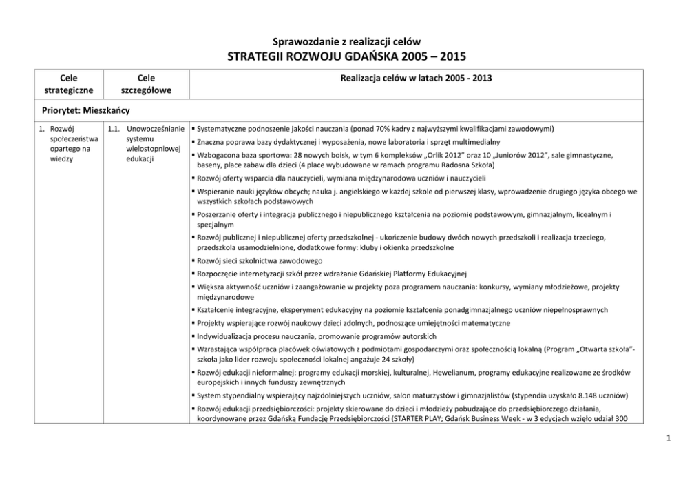 Sprawozdanie z realizacji celów STRATEGII ROZWOJU GDAŃSKA 2005 – 2015 Cele strategiczne Cele szczegółowe Realizacja celów w latach 2005 - 2013 Priorytet: Mieszkańcy 1. Rozwój społeczeństwa opartego na wiedzy 1.1. Unowocześnianie systemu wielostopniowej edukacji Systematyczne podnoszenie jakości nauczania (ponad 70% kadry z najwyższymi kwalifikacjami zawodowymi) Znaczna poprawa bazy dydaktycznej i wyposażenia, nowe laboratoria i sprzęt multimedialny Wzbogacona baza sportowa: 28 nowych boisk, w tym 6 kompleksów „Orlik 2012” oraz 10 „Juniorów 2012”, sale gimnastyczne, baseny, place zabaw dla dzieci (4 place wybudowane w ramach programu Radosna Szkoła) Rozwój oferty wsparcia dla nauczycieli, wymiana międzynarodowa uczniów i nauczycieli Wspieranie nauki języków obcych; nauka j. angielskiego w każdej szkole od pierwszej klasy, wprowadzenie drugiego języka obcego we wszystkich szkołach podstawowych Poszerzanie oferty i integracja publicznego i niepublicznego kształcenia na poziomie podstawowym, gimnazjalnym, licealnym i specjalnym Rozwój publicznej i niepublicznej oferty przedszkolnej - ukończenie budowy dwóch nowych przedszkoli i realizacja trzeciego, przedszkola usamodzielnione, dodatkowe formy: kluby i okienka przedszkolne Rozwój sieci szkolnictwa zawodowego Rozpoczęcie internetyzacji szkół przez wdrażanie Gdańskiej Platformy Edukacyjnej Większa aktywność uczniów i zaangażowanie w projekty poza programem nauczania: konkursy, wymiany młodzieżowe, projekty międzynarodowe Kształcenie integracyjne, eksperyment edukacyjny na poziomie kształcenia ponadgimnazjalnego uczniów niepełnosprawnych Projekty wspierające rozwój naukowy dzieci zdolnych, podnoszące umiejętności matematyczne Indywidualizacja procesu nauczania, promowanie programów autorskich Wzrastająca współpraca placówek oświatowych z podmiotami gospodarczymi oraz społecznością lokalną (Program „Otwarta szkoła”szkoła jako lider rozwoju społeczności lokalnej angażuje 24 szkoły) Rozwój edukacji nieformalnej: programy edukacji morskiej, kulturalnej, Hewelianum, programy edukacyjne realizowane ze środków europejskich i innych funduszy zewnętrznych System stypendialny wspierający najzdolniejszych uczniów, salon maturzystów i gimnazjalistów (stypendia uzyskało 8.148 uczniów) Rozwój edukacji przedsiębiorczości: projekty skierowane do dzieci i młodzieży pobudzające do przedsiębiorczego działania, koordynowane przez Gdańską Fundację Przedsiębiorczości (STARTER PLAY; Gdańsk Business Week - w 3 edycjach wzięło udział 300 1 osób; Działam Twórczo - 128 uczestników i Grywalizacja Biznesowa - 74 uczestników) Prowadzenie edukacji osób starszych w ramach Uniwersytetów Drugiego Wieku oraz Akademii Trzeciego Wieku. 1.2. Rozwój nauki Wspieranie rozwoju wyższych uczelni Gdańska poprzez pomoc i wsparcie finansowe organizacji konferencji i sympozjów oraz projektów międzynarodowych Wsparcie planistyczne i logistyczne rozwoju bazy naukowej i dydaktycznej gdańskich uczelni, w tym UG, PG i GUMed Działania wspierające integrację środowisk akademickich i biznesowych w ramach projektu InnoBaltica System stypendialny nagradzający osiągnięcia studentów, w tym stypendia PMG dla studentów: naukowe (na rok akademicki) i jednorazowe (za wybitne osiągnięcia i na studia zagraniczne) – przyznano 429 stypendiów od 2005 roku; stypendium naukowe Prezydenta Miasta Gdańska im. G. D. Fahrenheita (studia zagraniczne) – 241 stypendiów (w tym kontynuacje) od 2005 r. Nagroda Naukowa Miasta Gdańska imienia Jana Heweliusza - przyznawana od 1988 r. za wybitne osiągnięcia naukowe. Od 2001 r. Nagroda jest przyznawana w dwóch kategoriach: nauk humanistycznych, nauk przyrodniczych i ścisłych. Od 1988 do 2013 r. Nagrody otrzymało 37 naukowców (w 2013 wysokość nagrody wynosiła 16 tys. zł) Nagroda dla Młodych Naukowców imienia Jana Uphagena, przyznawana od 2003 roku (do 2006 r, „Młody Heweliusz) osobom w wieku do 30 lat za wybitne osiągnięcia naukowe w dwóch kategoriach: nauk ścisłych i przyrodniczych oraz nauk humanistycznych. Nagrodę, w wysokości 7 tys. zł otrzymało dotychczas 20 naukowców. 2. Poprawa warunków zamieszkania 2.1. Poprawa warunków mieszkaniowych Pozyskiwanie nowych mieszkań (w latach 2006-2012 zakupiono 130 lokali mieszkalnych za kwotę 36,2 mln zł) Program wymiany nieruchomości gruntowych za lokale mieszkalne (pozyskano 520 lokali za kwotę 142,1 mln zł) Modernizacja budynków i mieszkań komunalnych (w latach 2006-2012 wyremontowano 280 lokali komunalnych, na których modernizację i remonty wydatkowano 29,9 mln zł, w tym 127 lokali w budynkach na rewitalizowanym terenie Letnicy). Modernizacje i remonty budynków wspólnot mieszkaniowych (w latach 2005 – 2012 wydatki Miasta w ramach funduszu remontowego wspólnot mieszkaniowych wyniosły łącznie 111,1 mln zł) System pożyczek dla wspólnot mieszkaniowych na remonty nieruchomości wspólnych (w latach 2005 – 2012 udzielono pożyczek na remonty części wspólnych w budynkach wspólnot mieszkaniowych z udziałem Gminy na łączną kwotę 1,5 mln zł, w tym udzielono 38 pożyczek dla indywidualnych właścicieli lokali wykupionych w tych budynkach na kwotę 236,8 tys.zł) Udostępnianie mieszkań bez barier z zasobów miejskich osobom niepełnosprawnym Zapewnienie miejsc zamieszkania w mieszkaniach chronionych dla osób niepełnosprawnych i dla usamodzielniających się wychowanków placówek opiekuńczo – wychowawczych i rodzin zastępczych 2.2. Rozwój zróżnicowanych form budownictwa mieszkaniowego Finansowanie budownictwa społecznego w ramach TBS (w latach 2005-2012 gminne TBS-y wybudowały łącznie 44 budynki z 1.439 lokalami mieszkalnymi, z których 1.045 zostało oddanych do dyspozycji Gminy na realizację zarejestrowanych potrzeb mieszkaniowych. Wkład Miasta wyniósł 161,6 mln zł) Rewitalizacja zabytkowego XIX-wiecznego budynku na Dolnym Mi