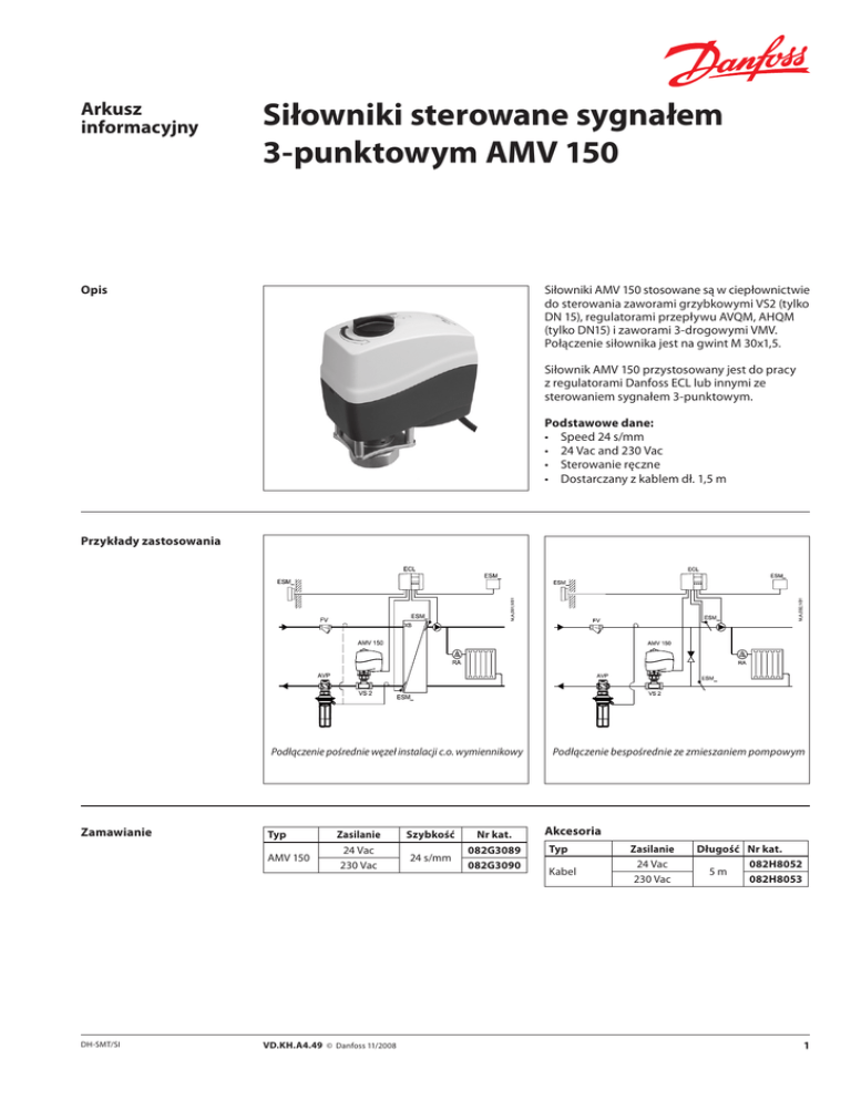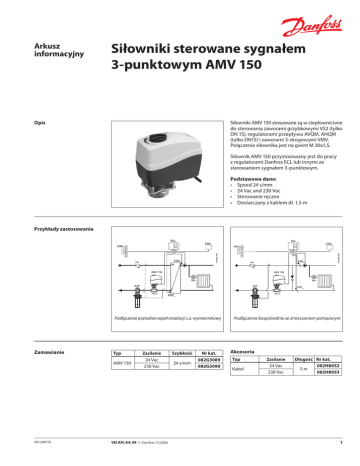 Arkusz informacyjny Siłowniki sterowane sygnałem 3-punktowym AMV 150 Opis Siłowniki AMV 150 stosowane są w ciepłownictwie do sterowania zaworami grzybkowymi VS2 (tylko DN 15), regulatorami przepływu AVQM, AHQM (tylko DN15) i zaworami 3-drogowymi VMV. Połączenie siłownika jest na gwint M 30x1,5. Siłownik AMV 150 przystosowany jest do pracy z regulatorami Danfoss ECL lub innymi ze sterowaniem sygnałem 3-punktowym. Podstawowe dane: • Speed 24 s/mm • 24 Vac and 230 Vac • Sterowanie ręczne • Dostarczany z kablem dł. 1,5 m Przykłady zastosowania Podłączenie pośrednie węzeł instalacji c.o. wymiennikowy Zamawianie Typ AMV 150 DH-SMT/SI Zasilanie 24 Vac 230 Vac VD.KH.A4.49 © Danfoss 11/2008 Szybkość 24 s/mm Nr kat. 082G3089 082G3090 Podłączenie bespośrednie ze zmieszaniem pompowym Akcesoria Typ Kabel Zasilanie 24 Vac 230 Vac Długość Nr kat. 082H8052 5m 082H8053 1 Arkusz informacyjny Dane techniczne Siłowniki sterowane sygnałem 3-punktowym AMV 150 Zasilanie Zużycie energii Częstotliwość Siła Skok Szybkość Max. temperature czynnika Stopień ochrony Temp. otoczenia Temp. przech. i transportu Ciężar - Znak zgodności z normami 24 Vac, 230 Vac; +10 do –15% 1 VA - 24 Vac, 8 VA - 230 Vac 50 Hz / 60 Hz 250 N 5 mm 24 s/mm 150 °C IP 54 0 - 55 °C –40 ... +70 °C 0,34 kg Dyrektywa Niskich Napięć 73/23/EEC, EMC-Directive 2004/108/EEC: - EN 60730-1, EN 60730-2-14 Mechaniczny Siłownik powinien być tak zamontowany, aby trzpień zaworu był skierowany do góry lub poziomo. Montaż Elektryczny Uwaga: Nie uruchamiać siłownika przed zamontowaniem na zaworze. Każdy siłownik jest wyposażony w kabel podłączeniowy. Podłączenia elektryczne 24 V Szary Trzpień do dołu Czarny zero Czerwony Trzpień do góry 230 V Czarny Trzpień do dołu Niebieski zero Brązowy Trzpień do góry Złomowanie Przed złomowaniem siłownik należy rozłożyć na części i posortować na różne grupy materiałowe. 2 VD.KH.A4.49 © Danfoss 11/2008 DH-SMT/SI Arkusz informacyjny Siłowniki sterowane sygnałem 3-punktowym AMV 150 Sterowanie ręczne 1 Podczas sterowania ręcznego naciśnij i przytrzymaj przycisk (umieszczony od spodu siłownika). Uwaga: Załączenie napięcia do siłownika sygnalizowane jest przez „kliknięcie” odgłos świadczący o tym, że siłownik ustawił się w pozycji normalnej. Kombinacje siłownik-zawór AMV 150 + VS2 AMV 150 + VMV AMV 150 + AVQM AMV 150 + AHQM Wymiary DH-SMT/SI VD.KH.A4.49 © Danfoss 11/2008 3 Arkusz informacyjny Siłowniki sterowane sygnałem 3-punktowym AMV 150 4 VD.KH.A4.49 Produced by Danfoss A/S © 11/2008