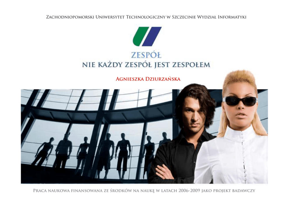Zachodniopomorski Uniwersytet Technologiczny w Szczecinie Wydział Informatyki Agnieszka Dziurzańska Praca naukowa finansowana ze środków na naukę w latach 2006-2009 jako projekt badawczy Copyright © Agnieszka Dziurzańska Copyright © by Wydział Informatyki Zachodniopomorskiego Uniwersytetu Technologicznego w Szczecinie grupa grupa definicja „(…) dwie lub więcej jednostek, między którymi istnieje określony stosunek społeczny (…), gdy jej członkowie wchodzą ze sobą w jakiś typ kontaktu.” (Wiatr ,1982) grupa pracownicza definicja „(…) podstawową jednostkę pracy, powstałą w wyniku projektowania organizacji, składającą się z elementarnych stanowisk pracy. Członkami jej są poszczególni pracownicy wchodzący ze sobą w interakcje i wspólnie przyczyniający się do osiągnięcia celu grupy oraz organizacji.” (Kozdrój, 1988) formy współpracy formy współpracy klasyfikacja • • • • • grupa robocza, pseudozespół, zespół potencjalny, zespół (prawdziwy), zespół osiągający ponadprzeciętne wyniki. (Katzenbach, Smith, 2001) formy współpracy grupa robocza to forma współpracy, w której członkowie wymieniają między sobą informacje, opinie i przykłady najlepszych rozwiązań, jak również pomagają sobie nawzajem. Jednak ich wysiłki to praca indywidualna, w której nie ma potrzeby łączenia wspólnych sił do rozwiązania problemu. Odpowiedzialność i rozliczanie się z wykonanej pracy są również indywidualne. Grupa taka składa się z jednostek niestanowiących całości. Grupa nie wyznacza sobie celów, lecz po prostu wykonuje przekazane do realizacji zadanie. formy współpracy pesudozespół to formacja dążąca do osiągnięcia nadzwyczajnych wyników pracy i czasami ma ona taką możliwość. Jednakże ze względu na brak koncentracji na wspólnej pracy, pseudozespół nigdy takich wyników nie osiągnie. Ta forma współpracy nie potrafi również sformułować celu. W pseudozespole prywatne ambicje przedkładane są nad wspólną pracę, podczas wykonywania, której brakuje wzajemnego zaufania, a suma wspólnych wysiłków jest tu mniejsza niż indywidualne możliwości każdego z członków takiego zespołu. formy współpracy zespół potencjalny Zespół taki posiada możliwość oraz wewnętrzną potrzebę osiągania nadzwyczajnych wyników, jednakże jego członkowie nie do końca potrafią określić cele, a co z tego wynika, istnieje wśród nich zbyt małe poczucie współodpowiedzialności. W tej formacji istnieją też problemy z wypracowaniem wspólnego podejścia do pracy. Przy odpowiedniej mobilizacji jednak zespoły te mogą przekształcić się, i często tak się staje, w zespoły prawdziwe. formy współpracy zespół osiągający ponad przeciętne wyniki to formacja, która spełnia wszystkie kryteria wymienione w definicji zespołu prawdziwego, tym jednak od niego się różni, że jej członkowie dodatkowo wykazują dbałość o osobisty rozwój innych członków i ich indywidualny sukces. Ta forma współpracy zespołowej posiada największy spośród wszystkich form wpływ na wyniki osiągane przez organizację. zespół prawdziwy zespół prawdziwy definicja „(…) niewielka liczba ludzi posiadających komplementarne umiejętności, zaangażowanych w realizację wspólnego celu ogólnego oraz celów cząstkowych, których podejście opiera się na współodpowiedzialności.” (Katzenbach, Smith, 2001) zespół a grupa zespół a grupa różnica obszar cecha grupa robocza zespół prawdziwy cel istnienie celu cel jest toŜsamy z przekazanym zadaniem tak cel konieczność wyznaczenia celu nie tak cel sposób określenia celu narzucony odgórnie w postaci zadania cel jest wypracowywany wspólnie przez członków cel jednolitość celu róŜne cele dla róŜnych członków jeden cel wspólny dla wszystkich cel utoŜsamienie się z celem nie konieczne cel nastawienie na osiągnięcie celu nie tak cel ambitność celu mała i przeciętna duŜa lub bardzo duŜa zadanie zaleŜność pomiędzy częściami zadania brak lub słaba duŜa lub bardzo duŜa zadanie ryzyko niepowodzenia zadania małe lub średnie duŜe lub bardzo duŜe zadanie ambitność zadania mała i przeciętna duŜa i bardzo duŜa wynik osiągnięty rezultat suma indywidualnego wkładu pracy poszczególnych suma wspólnej pracy wszystkich członków członków wynik metoda osiągnięcia wyniku jest ściśle określona brak określonej metody wynik wynik pracy typowy ponadprzeciętny zespół a grupa różnica cd. obszar cecha grupa robocza zespół prawdziwy sposób pracy sposób wykonywania pracy narzucony odgórnie wspólnie wypracowany spójny sposób sposób pracy rzeczywisty wkład w pracę uzaleŜniony od stanowiska kaŜdy z członków dostarcza swój wkład w rzeczywistą pracę sposób pracy sposób rozwiązywania problemów pasywny aktywny sposób pracy sposób podejmowania decyzji niezaleŜnie przez lidera ogólna akceptacja sposób pracy reakcja na zmiany wolna szybka sposób pracy komunikacja formalna nieformalna struktura wielkość formacji nieograniczona 2-25 osób struktura hierarchia stanowisk istnieje nie istnieje struktura współzaleŜność członków ograniczona tak struktura lider jeden dzielona rola lidera indywidualnie sumarycznie (w powiązaniu z pozostałymi cechy członków znaczenie umiejętności członkami) cechy członków zaangaŜowanie członków przeciętne bardzo duŜe cechy członków wymagana kreatywność przeciętna duŜa i bardzo duŜa cechy członków wymagane zaufanie pomiędzy członkami przeciętne bardzo duŜe cechy członków wymagane doświadczenie tak nie koniecznie otoczenie nieistotne sprzyjające otoczenie zespół a grupa istota różnicy •grupa jest formacją skupiającą ludzi •zespół jest formacją składającą się z ludzi zespół a grupa istota różnicy przez analogię •grupa jest formacją skupiającą ludzi magazyn skupia części samochodowe •zespół jest form