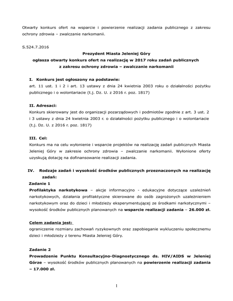 Otwarty konkurs ofert na wsparcie i powierzenie realizacji zadania publicznego z zakresu ochrony zdrowia – zwalczanie narkomanii. S.524.7.2016 Prezydent Miasta Jeleniej Góry ogłasza otwarty konkurs ofert na realizację w 2017 roku zadań publicznych z zakresu ochrony zdrowia – zwalczanie narkomanii I. Konkurs jest ogłoszony na podstawie: art. 11 ust. 1 i 2 i art. 13 ustawy z dnia 24 kwietnia 2003 roku o działalności pożytku publicznego i o wolontariacie (t.j. Dz. U. z 2016 r. poz. 1817) II. Adresaci: Konkurs skierowany jest do organizacji pozarządowych i podmiotów zgodnie z art. 3 ust. 2 i 3 ustawy z dnia 24 kwietnia 2003 r. o działalności pożytku publicznego i o wolontariacie (t.j. Dz. U. z 2016 r. poz. 1817) III. Cel: Konkurs ma na celu wyłonienie i wsparcie projektów na realizację zadań publicznych Miasta Jeleniej Góry w zakresie ochrony zdrowia – zwalczanie narkomanii. Wyłonione oferty uzyskują dotację na dofinansowanie realizacji zadania. IV. Rodzaje zadań i wysokość środków publicznych przeznaczonych na realizację zadań: Zadanie 1 Profilaktyka narkotykowa – akcje informacyjno - edukacyjne dotyczące uzależnień narkotykowych, działania profilaktyczne skierowane do osób zagrożonych uzależnieniem narkotykowym oraz do dzieci i młodzieży eksperymentującej ze środkami narkotycznymi – wysokość środków publicznych planowanych na wsparcie realizacji zadania – 26.000 zł. Celem zadania jest: ograniczenie rozmiaru zachowań ryzykownych oraz zapobieganie wykluczeniu społecznemu dzieci i młodzieży z terenu Miasta Jeleniej Góry. Zadanie 2 Prowadzenie Punktu Konsultacyjno-Diagnostycznego ds. HIV/AIDS w Jeleniej Górze – wysokość środków publicznych planowanych na powierzenie realizacji zadania – 17.000 zł. 1 Celem zadania jest: wykonywanie anonimowych i bezpłatnych badań wykrywających zakażenia HIV połączone z poradnictwem okołotestowym. Zwiększenie świadomości i wiedzy społeczeństwa dotyczącej HIV/AIDS, a zwłaszcza kobiet w ciąży. Uwaga! Wysokość środków publicznych przeznaczonych na realizację ww. zadań może ulec zmianie z chwilą przyjęcia przez Radę Miejską Jeleniej Góry uchwały budżetowej na 2017 rok. V. Termin i warunki realizacji zadania: 1. Niniejszy konkurs obejmuje zadania publiczne, których termin realizacji obejmuje: 1) Zadanie 1 – w okresie od 1 stycznia do 31 grudnia 2017 r. 2) Zadanie 2 – w okresie od 1 stycznia do 30 czerwca 2017 r. 2. Czas realizacji powinien obejmować: okres przygotowania, przeprowadzenia, zakończenia i rozliczenia zadania (podsumowanie, ewaluacja zadania). Wszystkie dokumenty muszą zostać wystawione do dnia zakończenia zadania. 3. Wszelkie koszty związane z realizacją zadania muszą zostać poniesione (zapłacone) najpóźniej do dnia zakończenia zadania, określonego w umowie, nawet, jeżeli wynikający z przepisów lub faktury ostateczny termin ich płatności jest dłuższy. Dotyczy to również pochodnych od wynagrodzeń. 4. W przypadku korzystania z pracy społecznej członków organizacji oferenta lub świadczeń wolontariuszy ustala się następujące zasady: 1) zakres, sposób i liczba godzin wykonywania pracy przez wolontariusza muszą być określone w porozumieniu zawartym zgodnie z art. 44 ustawy o działalności pożytku publicznego i o wolontariacie, 2) wolontariusz musi prowadzić na bieżąco karty pracy wraz ze szczegółowym opisem wykonywanej pracy (dokumentacja ta musi być przechowywana na zasadach ogólnych, tak jak dokumenty finansowe), 3) wolontariusz powinien posiadać kwalifikacje i spełniać wymagania odpowiednie do rodzaju i zakresu wykonywanej pracy, 4) jeżeli wolontariusz wykonuje pracę taką, jak stały personel, to kalkulacja wkładu pracy wolontariusza musi być dokonana w oparciu o stawki obowiązujące dla tego personelu, 5) wolontariuszem nie może być beneficjent ostateczny zadania, 6) członek organizacji bądź wolontariusz zatrudniony u Wnioskodawcy na podstawie umowy o pracę lub umowy cywilnoprawnej nie może wykonywać świadczeń objętych wolontariatem w godzinach swojej pracy. 2 7) rozliczenie pracy społecznej członka organizacji bądź świadczeń wolontariusza odbywa się na podstawie oświadczenia ww. osoby stwierdzającej wykonanie pracy społecznej bądź świadczenia, z podaniem zakresu, liczby godzin oraz jego wycenę, potwierdzoną przez koordynatora zadania lub osobę upoważnioną. 5. W sytuacji rezygnacji przez Oferenta z przystąpienia do zawarcia umowy bądź niemożności osiągnięcia celu zakładanego w ofercie, Prezydent Miasta może podjąć decyzje o przyznaniu niewykorzystanej kwoty dotacji wybranemu podmiotowi z ofert rekomendowanych do dofinansowania przez Komisję Konkursową. VI. Zasady przyznawania dotacji: 1. Konkurs rozstrzyga Prezydent Miasta Jeleniej Góry po zapoznaniu się z opinią Komisji Konkursowej. 2. Postępowanie konkursowe zostanie przeprowadzone przy uwzględnieniu zasad określonych w ustawie z dnia 24 kwietnia 2003 roku o działalności pożytku publicznego i o wolontariacie (t.j. Dz. U. z 2016 r. poz. 1817). 3. Złożenie oferty nie jest jednoznaczne z przyznaniem dotacji. 4. Dotacja na dofinansowanie realizowanego zadania: 1) Zadanie 1 – wsparcie realizacji zadania. Oferent musi wykazać udział własny i/lub z innych źródeł, w tym finansowy udział własny i niefinansowy udział własny (praca wolontariuszy, nieodpłatna praca członków organizacji), 2) Zadanie 2 – powierzenie realizacji zadania. Udział dofinansowania realizacji zadania wynosi 100%. 5. Kwota przyznanej dotacji może być niższa od wnioskowanej w ofercie. 6. Koszty zostaną uznane za kwalifikowane, gdy: 1) związane są z realizowanym zadaniem i są niezbędne do jego realizacji, 2) zostały uwzględnione w kosztorysie zadania, 3) zostały skalkulowane racjonalnie na podstawie cen rynkowych, 4) odzwierciedlają koszty rzeczywiste, są skalkulowane proporcjonalnie dla zadania objętego 