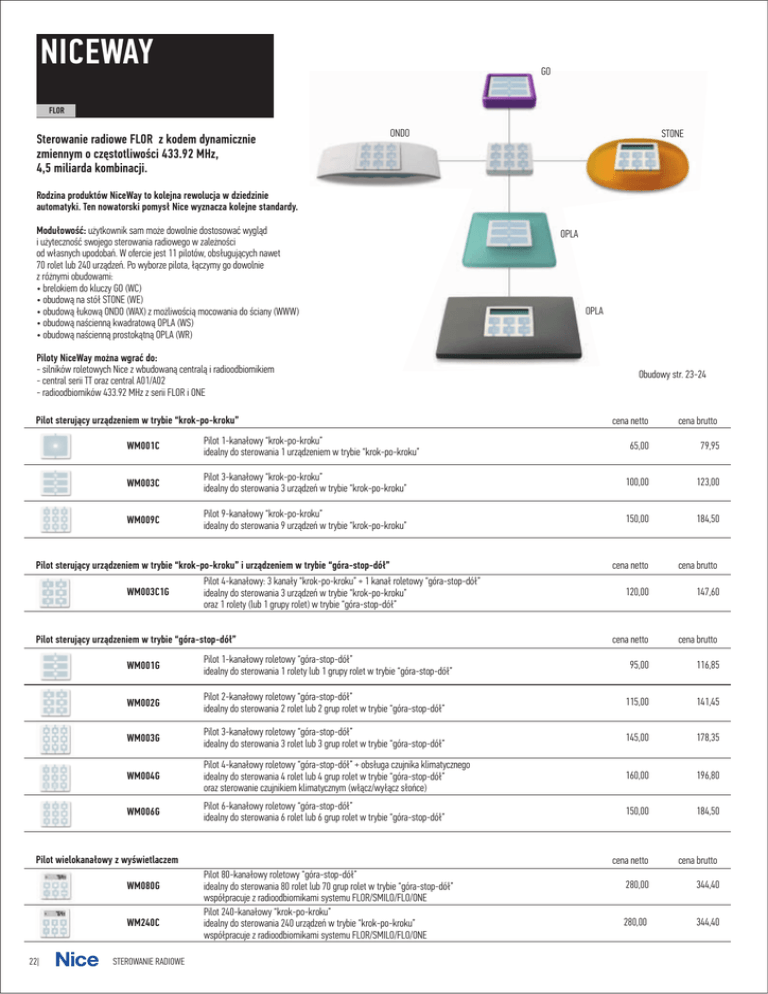 NICEWAY GO FLOR Sterowanie radiowe FLOR z kodem dynamicznie zmiennym o czêstotliwoœci 433.92 MHz, 4,5 miliarda kombinacji. ONDO STONE Rodzina produktów NiceWay to kolejna rewolucja w dziedzinie automatyki. Ten nowatorski pomys³ Nice wyznacza kolejne standardy. Modu³owoœæ: u¿ytkownik sam mo¿e dowolnie dostosowaæ wygl¹d i u¿ytecznoœæ swojego sterowania radiowego w zale¿noœci od w³asnych upodobañ. W ofercie jest 11 pilotów, obs³uguj¹cych nawet 70 rolet lub 240 urz¹dzeñ. Po wyborze pilota, ³¹czymy go dowolnie z ró¿nymi obudowami: • brelokiem do kluczy GO (WC) • obudow¹ na stó³ STONE (WE) • obudow¹ ³ukow¹ ONDO (WAX) z mo¿liwoœci¹ mocowania do œciany (WWW) • obudow¹ naœcienn¹ kwadratow¹ OPLA (WS) • obudow¹ naœcienn¹ prostok¹tn¹ OPLA (WR) Piloty NiceWay mo¿na wgraæ do: - silników roletowych Nice z wbudowan¹ central¹ i radioodbiornikiem - central serii TT oraz central A01/A02 - radioodbiorników 433.92 MHz z serii FLOR i ONE Pilot steruj¹cy urz¹dzeniem w trybie “krok-po-kroku” OPLA OPLA Obudowy str. 23-24 cena netto cena brutto 65,00 79,95 WM001C Pilot 1-kana³owy “krok-po-kroku” idealny do sterowania 1 urz¹dzeniem w trybie “krok-po-kroku” WM003C Pilot 3-kana³owy “krok-po-kroku” idealny do sterowania 3 urz¹dzeñ w trybie “krok-po-kroku” 100,00 123,00 WM009C Pilot 9-kana³owy “krok-po-kroku” idealny do sterowania 9 urz¹dzeñ w trybie “krok-po-kroku” 150,00 184,50 Pilot steruj¹cy urz¹dzeniem w trybie “krok-po-kroku” i urz¹dzeniem w trybie “góra-stop-dó³” Pilot 4-kana³owy: 3 kana³y “krok-po-kroku” + 1 kana³ roletowy “góra-stop-dó³” WM003C1G idealny do sterowania 3 urz¹dzeñ w trybie “krok-po-kroku” oraz 1 rolety (lub 1 grupy rolet) w trybie “góra-stop-dó³” cena netto cena brutto 120,00 147,60 Pilot steruj¹cy urz¹dzeniem w trybie “góra-stop-dó³” cena netto cena brutto 95,00 116,85 WM001G Pilot 1-kana³owy roletowy “góra-stop-dó³” idealny do sterowania 1 rolety lub 1 grupy rolet w trybie “góra-stop-dó³” WM002G Pilot 2-kana³owy roletowy “góra-stop-dó³” idealny do sterowania 2 rolet lub 2 grup rolet w trybie “góra-stop-dó³” 115,00 141,45 WM003G Pilot 3-kana³owy roletowy “góra-stop-dó³” idealny do sterowania 3 rolet lub 3 grup rolet w trybie “góra-stop-dó³” 145,00 178,35 WM004G Pilot 4-kana³owy roletowy “góra-stop-dó³” + obs³uga czujnika klimatycznego idealny do sterowania 4 rolet lub 4 grup rolet w trybie “góra-stop-dó³” oraz sterowanie czujnikiem klimatycznym (w³¹cz/wy³¹cz s³oñce) 160,00 196,80 WM006G Pilot 6-kana³owy roletowy “góra-stop-dó³” idealny do sterowania 6 rolet lub 6 grup rolet w trybie “góra-stop-dó³” 150,00 184,50 cena netto cena brutto 280,00 344,40 280,00 344,40 Pilot wielokana³owy z wyœwietlaczem WM080G WM240C 22| STEROWANIE RADIOWE Pilot 80-kana³owy roletowy “góra-stop-dó³” idealny do sterowania 80 rolet lub 70 grup rolet w trybie “góra-stop-dó³” wspó³pracuje z radioodbiornikami systemu FLOR/SMILO/FLO/ONE Pilot 240-kana³owy “krok-po-kroku” idealny do sterowania 240 urz¹dzeñ w trybie “krok-po-kroku” wspó³pracuje z radioodbiornikami systemu FLOR/SMILO/FLO/ONE STONE Przenoœna obudowa stolikowa. Funkcjonalnoœæ: z obudow¹ STONE sterowanie urz¹dzeniami jest praktyczne i ergonomiczne. Dziêki gumowej obudowie odpornej na wstrz¹sy modu³ pilota jest zabezpieczony przed przypadkowymi uszkodzeniami. Obudowa STONE dostêpna jest w trzech kolorach: bia³ej, przezroczystej oraz pomarañczowej. WEW WET WEO cena netto 47,00 cena brutto 57,81 obudowa owalna, idealna na biurko, kolor przezroczysty 47,00 57,81 obudowa owalna, idealna na biurko, kolor pomarañczowy 47,00 57,81 cena netto 25,00 cena brutto 30,75 20,00 24,60 Kod WEW obudowa owalna, idealna na biurko, kolor bia³y WET WEO ONDO Przenoœna obudowa z mo¿liwoœci¹ monta¿u na œcianie. WAX jest uniwersaln¹ obudow¹ z serii NiceWay, dziêki u¿ytemu systemowi wbudowanych magnesów. Przy zastosowaniu uchwytu WWW istnieje mo¿liwoœæ instalacji pilota na œcianie. Górna czêœæ obudowy wykonana jest z bia³ego designerskiego tworzywa, dó³ z ergonomicznej gumy. Modu³ pilota mo¿e byæ umieszczony w pozycji poziomowej lub pionowej. WAX WWW Kod WAX obudowa WAX, kolor bia³y, WWW uchwyt z magnesem do przymocowania na œcianie STEROWANIE RADIOWE |23 OPLA Naœcienna obudowa w dwóch kszta³tach: - kwadratowa, - prostok¹tna. Obudowy OPLA dostêpne s¹ w 6 kolorach. WSW, WRW WSB, WRB WSA, WRA WSG, WRG WST, WRT WSS, WRS cena netto 20,00 cena brutto 24,60 obudowa kwadratowa, kolor czarny 20,00 24,60 WSA obudowa kwadratowa, kolor aluminium 20,00 24,60 WSG obudowa kwadratowa, kolor grafitowy 20,00 24,60 WST obudowa kwadratowa, kolor transparentny 20,00 24,60 WSS obudowa kwadratowa, kolor morski 20,00 24,60 WRW obudowa prostok¹tna, kolor bia³y 24,00 29,52 WRB obudowa prostok¹tna, kolor czarny 24,00 29,52 WRA obudowa prostok¹tna, kolor aluminium 24,00 29,52 WRG obudowa prostok¹tna, kolor grafitowy 24,00 29,52 WRT obudowa prostok¹tna, kolor transparentny 24,00 29,52 WRS obudowa prostok¹tna, kolor morski 24,00 29,52 cena netto 16,00 cena brutto 19,68 Kod WSW obudowa kwadratowa, kolor bia³y WSB GO Obudowa jako brelok do kluczy. Obudowa GO wykonana jest z ergonomicznej, odpornej na uszkodzenia gumy. Obudowa dostêpna jest w 4 kolorach. WCF WCG WCI WCO Kod WCF obudowa brelok, kolor zielony WCG obudowa brelok, kolor grafitowy 16,00 19,68 WCI obudowa brelok, kolor b³êkit lodu 16,00 19,68 WCO obudowa brelok, kolor pomarañczowy 16,00 19,68 24| STEROWANIE RADIOWE