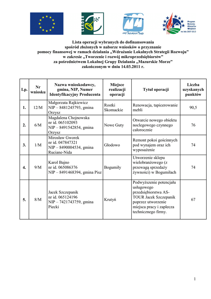 Lista operacji wybranych do dofinansowania spośród złożonych w naborze wniosków o przyznanie pomocy finansowej w ramach działania „Wdrażanie Lokalnych Strategii Rozwoju” w zakresie „Tworzenie i rozwój mikroprzedsiębiorstw” za pośrednictwem Lokalnej Grupy Działania „Mazurskie Morze” zakończonym w dniu 14.03.2011 r. Nr Lp. wniosku 1. 2. 3. 4. 5. 12/M 6/M 1/M 9/M 8/M Nazwa wnioskodawcy, gmina, NIP, Numer Identyfikacyjny Producenta Małgorzata Rajkiewicz NIP – 8481245793, gmina Orzysz Magdalena Chojnowska nr id. 065102093 NIP – 8491542854, gmina Orzysz Mirosław Gworek nr id. 047847321 NIP – 8490004534, gmina Ruciane-Nida Miejsce realizacji operacji Tytuł operacji Liczba uzyskanych punktów Rostki Skomackie Renowacja, tapicerowanie mebli 90,5 Nowe Guty Otwarcie nowego obiektu noclegowego czynnego całorocznie 76 Głodowo Remont pokoi gościnnych pod wynajem oraz ich wyposażenie 74 Karol Bajno nr id. 065086376 Bogumiły NIP – 8491468394, gmina Pisz Jacek Szczepanik nr id. 065124196 NIP – 7421743759, gmina Piecki Krutyń Utworzenie sklepu wielobranżowego (z przewagą sprzedaży żywności) w Bogumiłach Podwyższenie potencjału usługowego przedsiębiorstwa ASTOUR Jacek Szczepanik poprzez utworzenie miejsca pracy i zaplecza technicznego firmy. 74 67 1 Lista operacji niewybranych do dofinansowania spośród złożonych w naborze wniosków o przyznanie pomocy finansowej w ramach działania „Wdrażanie Lokalnych Strategii Rozwoju” w zakresie „Tworzenie i rozwój mikroprzedsiębiorstw” za pośrednictwem Lokalnej Grupy Działania „Mazurskie Morze” zakończonym w dniu 14.03.2011 r. Lp. 1. 2. Nr wniosku 4/M 7/M 3. 5/M 4. 10/M 5. 11/M 6. 3/M 7. 2/M Nazwa wnioskodawcy, Miejsce gmina, NIP, Numer realizacji Identyfikacyjny Producenta operacji Zbigniew Skopiński nr id. 065130584 Strzelniki NIP – 5832181032, gmina Orzysz Zbigniew Podbielski nr id. 057506046 NIP – 8491377444, gmina Pisz Krzysztof Pieklik nr id. 065182794 NIP – 8491091713, gmina Pisz Wojciech Grabarczyk nr id. 065191013 NIP – 1180181379, gmina Ruciane-Nida Piotr Wojciech Engwert nr id. 065181865 NIP – 8451003312, gmina Mikołajki Joanna Skopińska nr id. 065130584 NIP – 5262187315, gmina Orzysz Beata Bożena Ostrowska nr id. 065127690 NIP – 8451493428, gmina Mikołajki Pisz Tytuł operacji Zakup sprzętu do prac podwodnych oraz adaptacja pomieszczeń do magazynowania sprzętu Utworzenie profesjonalnego studia fotograficznego podniesieniem potencjału gospodarczego w powiecie piskim i możliwością stworzenia archiwum fotograficznego zabytków regionu. Liczba uzyskanych punktów 65,5 56 Wielki Las Mechanika pojazdowa 50 Piaski Zakup nawodnego apartamentu jachtu SumCamper pod wynajem 49,5 Mikołajki Wzrost konkurencyjności firmy ENART do końca 2011 roku poprzez zakup niezbędnego sprzętu video 45,5 Strzelniki Rozbudowa, adaptacja oraz wyposażenie pokoi gościnnych Mikołajki Rozbudowa pod wynajem pokoi gościnnych 42 38,5 2 Lista operacji wybranych do dofinansowania spośród złożonych w naborze wniosków o przyznanie pomocy finansowej w ramach działania „Wdrażanie Lokalnych Strategii Rozwoju” w zakresie „Różnicowanie w kierunku działalności nierolniczej” za pośrednictwem Lokalnej Grupy Działania „Mazurskie Morze” zakończonym w dniu 14.03.2011 r. Nr Lp. wniosku 1. 2. 3. Nazwa wnioskodawcy, gmina, NIP, Numer Identyfikacyjny Producenta Miejsce realizacji operacji 1/R Wiesława Zakrzewska nr id. 047672931 NIP- 8491196760, gmina Ruciane-Nida 3/R Dariusz Graszka nr id. 063575813 NIP- 5212789710, gmina Piecki Prusinowo 6/R Dariusz Kowalewski nr id. 061725761 NIP – 8491432947, gmina Pisz Łupki Wejsuny Tytuł operacji Liczba uzyskanych punktów Restauracje i inne stałe placówki gastronomiczne 100 Zakup wyposażenia pokoi elementów zagospodarowania terenu oraz zakup infrastruktury turystycznej w gospodarstwie Adaptacja i wyposażenie budynku mieszkalnego celem prowadzenia działalności agroturystycznej 92 91,5 3 Lista operacji niewybranych do dofinansowania spośród złożonych w naborze wniosków o przyznanie pomocy finansowej w ramach działania „Wdrażanie Lokalnych Strategii Rozwoju” w zakresie „Różnicowanie w kierunku działalności nierolniczej” za pośrednictwem Lokalnej Grupy Działania „Mazurskie Morze” zakończonym w dniu 14.03.2011 r. Lp. 1. Nr wniosku 8/R 2. 5/R 3. 7/R 4. 2/R 5. 4/R Nazwa wnioskodawcy, gmina, NIP, Numer Identyfikacyjny Producenta Piotr Tymiński nr id. 039272012 NIP – 7422010941, gmina Mikołajki Jacek Bałdyga nr id. 040285314 NIP – 8491462776 Gmina Pisz Grzegorz Machaj nr id. 032819343 NIP – 8442019911, gmina Biała Piska Adam Ordowski nr id. 038598643 NIP 8491405695, gmina Orzysz Barbara Rebisz –Sidło nr id. 051873475 NIP – 8521488385, gmina Mikołajki Miejsce realizacji operacji Tytuł operacji Liczba uzyskanych punktów Inulec Zwiększenie zbytu usług agroturystycznych poprzez wzbogacenie oferty oraz wydłużenie sezonu turystycznego 75 Hejdyk Chata na skraju Mazur – wypoczynek w Hejdyku 65,71 Biała Piska Uruchomienie centrum obsługi pojazdów 60,71 Czarne Usługi dla ludności poprzez zakup koparko ładowarki 60 Stare Sady Przebudowa, modernizacja budynku na potrzeby zwiększenia pokoi gościnnych oraz budowa budynku gospodarczego na potrzeby zwierząt w gospodarstwie agroturystycznym 38 4 Lista rankingowa operacji złożonych w naborze wniosków o przyznanie pomocy finansowej w ramach działania „Wdrażania Lokalnych Strategii Rozwoju” w zakresie „Tworzenie i rozwój mikroprzedsiębiorstw” za pośrednictwem Lokalnej Grupy Działania „Mazurskie Morze” zakończonym w dniu 14.03.2011 roku Lp. Nr wniosku 1 12/M 2 6/M 3 1/M 4 5 6 7 9/M Nazwa wnioskodawcy, gmina, NIP, Numer Identyfikacyjny Producenta Małgorzata Rajkiewicz NIP – 8481245793, gmina Orzysz Magdalena Chojnowska nr id. 065102093 NIP – 8491542854, gmina Orzysz Mirosław Gworek nr id. 047847321 NIP – 8490004534, gmin