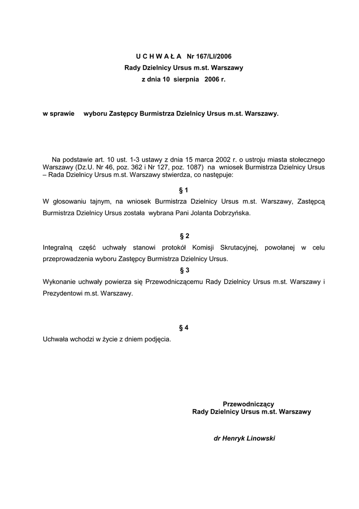 U C H W A Ł A Nr 167/LI/2006 Rady Dzielnicy Ursus m.st. Warszawy z dnia 10 sierpnia 2006 r. w sprawie wyboru Zastępcy Burmistrza Dzielnicy Ursus m.st. Warszawy. Na podstawie art. 10 ust. 1-3 ustawy z dnia 15 marca 2002 r. o ustroju miasta stołecznego Warszawy (Dz.U. Nr 46, poz. 362 i Nr 127, poz. 1087) na wniosek Burmistrza Dzielnicy Ursus – Rada Dzielnicy Ursus m.st. Warszawy stwierdza, co następuje: §1 W głosowaniu tajnym, na wniosek Burmistrza Dzielnicy Ursus m.st. Warszawy, Zastępcą Burmistrza Dzielnicy Ursus została wybrana Pani Jolanta Dobrzyńska. §2 Integralną część uchwały stanowi protokół Komisji Skrutacyjnej, powołanej w celu przeprowadzenia wyboru Zastępcy Burmistrza Dzielnicy Ursus. §3 Wykonanie uchwały powierza się Przewodniczącemu Rady Dzielnicy Ursus m.st. Warszawy i Prezydentowi m.st. Warszawy. §4 Uchwała wchodzi w Ŝycie z dniem podjęcia. Przewodniczący Rady Dzielnicy Ursus m.st. Warszawy dr Henryk Linowski Protokół Komisji Skrutacyjnej z głosowania w sprawie wyboru Zastępcy Burmistrza Dzielnicy Ursus m.st. Warszawy w dniu 10 sierpnia 2006 r. Komisja Skrutacyjna w składzie: - Przewodniczący - Mirosław Topolski - członkowie 1. Stanisław Pęziński 2. Henryk Grzegrzółka stwierdza, Ŝe w głosowaniu tajnym zostały ustalone następujące wyniki głosowania: - radnych Dzielnicy Ursus uprawnionych do głosowania 18 - radnych Dzielnicy Ursus obecnych na sesji 18 - radnych Dzielnicy Ursus, którzy wzięli udział w głosowaniu 18 - głosów waŜnych oddano 18 - głosów niewaŜnych oddano 0 w sprawie wyboru Z-cy Burmistrza Dzielnicy Ursus m.st. Warszawy P. Małgorzaty Gosiewskiej głosowano następująco: - za wyborem oddano głosów 14 - przeciwko wyborowi oddano głosów 2 - wstrzymało się od głosu 2 Komisja Skrutacyjna stwierdza, Ŝe zastępcą burmistrza Dzielnicy Ursus zostało wybrana pani Dobrzyńska Jolanta Podpisy Komisji: ............................................................... ............................................................... ..............................................................
