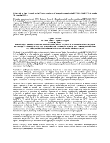 Załącznik nr 1 do Uchwały nr [●] Nadzwyczajnego Walnego Zgromadzenia PETROLINVEST S.A. z dnia 30 grudnia 2009 r. Działając na podstawie Art. 433 § 2 zdanie 4 oraz § 6 Kodeksu spółek handlowych Zarząd PETROLINVEST S.A. („Spółka”), wobec proponowanego warunkowego podwyższenia kapitału zakładowego Spółki o kwotę nie większą niż 190.000.000 (sto dziewięćdziesiąt milionów) złotych poprzez emisję nie więcej niż 19.000.0000 (dziewiętnaście milionów) akcji zwykłych na okaziciela serii V, o wartości nominalnej 10 (dziesięć) złotych każda z wyłączeniem w całości prawa poboru dotychczasowych akcjonariuszy oraz emisji z wyłączeniem w całości prawa poboru dotychczasowych akcjonariuszy do 19.000.0000 (dziewiętnaście milionów) imiennych warrantów subskrypcyjnych oraz nie więcej niż 120.000 (sto dwadzieścia tysięcy) obligacji zamiennych na akcje Spółki serii V, przedkłada Nadzwyczajnemu Walnemu Zgromadzeniu Spółki zwołanemu na dzień 30 grudnia 2009 r. poniższą opinię: Opinia Zarządu PETROLINVEST Spółka Akcyjna z dnia [●] 2009 r. uzasadniająca powody wyłączenia w całości prawa poboru akcji serii V, warrantów subskrypcyjnych uprawniających do objęcia akcji serii V oraz obligacji zamiennych na akcje serii V oraz sposób ustalania ceny emisyjnej akcji i nieodpłatny charakter warrantów subskrypcyjnych Na dzień 30 grudnia 2009 roku zwołane zostało Nadzwyczajne Walne Zgromadzenie spółki PETROLINVEST S.A. („Spółka”) w celu podjęcia m.in. uchwały w sprawie emisji nie więcej niż 120.000 (sto dwadzieścia tysięcy) obligacji zamiennych („Obligacje”), emisji do 19.000.0000 (dziewiętnaście milionów) imiennych warrantów subskrypcyjnych („Warranty Subskrypcyjne”), warunkowego podwyższenia kapitału zakładowego Spółki o kwotę nie większą niż 190.000.000 (sto dziewięćdziesiąt milionów) złotych poprzez emisję nie więcej niż 19.000.0000 (dziewiętnaście milionów) akcji zwykłych na okaziciela serii V, o wartości nominalnej 10 (dziesięć) złotych każda, („Akcje Serii V”), wyłączenia prawa poboru dotychczasowych akcjonariuszy Spółki oraz zmiany statutu Spółki. Warunkowe podwyższenie kapitału poprzez emisję Akcji Serii V oraz emisja Warrantów Subskrypcyjnych, a także emisja Obligacji, uprawniających do objęcia Akcji Serii V ma na celu uzyskanie przez Spółkę efektywnych narzędzi umożliwiających zarówno pozyskanie środków finansowych przeznaczonych na finansowanie dalszej działalności Spółki w zakresie poszukiwania i wydobywania węglowodorów w Kazachstanie, pozyskiwanie nowych aktywów kapitałowych, jak i zabezpieczenie potrzeb płynnościowych Spółki związanych ze zmniejszaniem jej zadłużenia oraz realizację programów motywacyjnych. W ocenie Zarządu Spółki podwyższenie kapitału zakładowego poprzez emisję akcji stanowi, w obecnej sytuacji Spółki, optymalne źródło pozyskania kapitału, pozyskiwania nowych aktywów kapitałowych, zmniejszania zadłużenia Spółki w sposób nie zagrażający jej płynności finansowej oraz realizacji programów motywacyjnych. Aktualna sytuacja na rynku kapitałowym oraz bieżące i przyszłe potrzeby finansowe Spółki i zamiary związane z poprawą jej wyników finansowych w drodze zmniejszania zadłużenia, uzasadniają wyłączenie w całości prawa poboru akcjonariuszy w stosunku do Akcji Serii V. Emisja Warrantów Subskrypcyjnych uprawniających do objęcia Akcji Serii V ma na celu ułatwienie i przyspieszenie wprowadzenia Akcji Serii V do publicznego obrotu na Giełdzie Papierów Wartościowych w Warszawie („GPW”). W opinii Zarządu zapewnienie płynności poprzez szybkie notowanie na GPW stanowi o atrakcyjności instrumentu dla jego nabywców i zwiększa prawdopodobieństwo powodzenia oferty, a co za tym idzie prawdopodobieństwo pozyskania niezbędnych dla Spółki środków finansowych lub efektywnego zmniejszenia zadłużenia Spółki, w sposób nie mający negatywnego wpływu na finansowanie jej bieżącej działalności inwestycyjnej. Warranty Subskrypcyjne będą oferowane inwestorom, którzy wyrażą zainteresowanie inwestycją w Spółkę, a także w celu pozyskiwania nowych aktywów kapitałowych, w tym akcji lub udziałów spółek, konwersji zadłużenia Spółki oraz realizacji programów motywacyjnych. Warranty Subskrypcyjne uprawniające do objęcia Akcji Serii V emitowane będą nieodpłatnie. Celem emisji Warrantów Subskrypcyjnych jest bowiem zapewnienie popytu na Akcje Serii V oraz ułatwienie szybkiego notowania Akcji Serii V na GPW. Biorąc pod uwagę aktualną sytuację na rynku kapitałowym oraz kurs akcji Spółki, nieodpłatna emisja Warrantów Subskrypcyjnych wydaje się w pełni uzasadniona. Emisja Obligacji przez Spółkę stanowi niezależny w stosunku do emisji Warrantów Subskrypcyjnych instrument pozyskania przez Spółkę kapitału i umożliwi Spółce dywersyfikację instrumentów finansowych oferowanych potencjalnym inwestorom. Wysokość ceny emisyjnej Akcji Serii V ustalona zostanie przez Zarząd Spółki w zależności od celów emisji, w szczególności na podstawie wartości określonej w odniesieniu do ceny rynkowej akcji lub określonej przy zastosowaniu wycen przeprowadzonych metodami porównawczymi oraz wyceny opartej o metodologię zdyskontowanych przepływów pieniężnych, jak również przewidywanych wyników finansowych Spółki. Będzie brana również pod uwagę możliwość ustalenia ceny emisyjnej Akcji przy zastosowaniu innych sposobów określania wartości Akcji, które zapewnią dostosowanie ceny emisyjnej do wielkości popytu na akcje albo do wymagań związanych z realizacją programów motywacyjnych lub realizowanego projektu inwestycyjnego. Wskazane powyżej okoliczności sprawiają, że pozbawienie dotychczasowych akcjonariuszy w całości prawa poboru Akcji Serii V jest ekonomicznie zasadne i leży w interesie Spółki. Uzasadniony jest rów