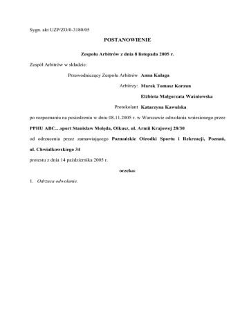 Sygn. akt UZP/ZO/0-3180/05 POSTANOWIENIE Zespołu Arbitrów z dnia 8 listopada 2005 r. Zespół Arbitrów w składzie: Przewodniczący Zespołu Arbitrów Anna Kułaga Arbitrzy: Marek Tomasz Korzun Elżbieta Małgorzata Waśniowska Protokolant Katarzyna Kawulska po rozpoznaniu na posiedzeniu w dniu 08.11.2005 r. w Warszawie odwołania wniesionego przez PPHU ABC…sport Stanisław Molęda, Olkusz, ul. Armii Krajowej 28/30 od odrzucenia przez zamawiającego Poznańskie Ośrodki Sportu i Rekreacji, Poznań, ul. Chwiałkowskiego 34 protestu z dnia 14 października 2005 r. orzeka: 1. Odrzuca odwołanie. 2. Kosztami postępowania obciąża PPHU ABC…sport Stanisław Molęda, Olkusz, ul. Armii Krajowej 28/30 i nakazuje: 1) zaliczyć na rzecz Urzędu Zamówień Publicznych koszty w wysokości 2 326 zł 78 gr (słownie: dwa tysiące trzysta dwadzieścia sześć złotych siedemdziesiąt osiem groszy) z kwoty wpisu uiszczonego przez PPHU ABC…sport Stanisław Molęda, Olkusz, ul. Armii Krajowej 28/30 2) dokonać wpłaty kwoty 0 zł 00 gr (słownie: xxx) przez xxx na rzecz xxx 3) dokonać wpłaty kwoty 0 zł 00 gr (słownie: xxx) przez xxx na rzecz Urzędu Zamówień Publicznych na rachunek środków specjalnych UZP 4) dokonać zwrotu kwoty 2 347 zł 22 gr (słownie: dwa tysiące trzysta czterdzieści siedem złotych dwadzieścia dwa grosze) z rachunku środków specjalnych Urzędu Zamówień Publicznych na rzecz PPHU ABC…sport Stanisław Molęda, Olkusz, ul. Armii Krajowej 28/30. 3. Uzasadnienie Zamawiający - Poznańskie Ośrodki Sportu i Rekreacji z siedzibą w Poznaniu w dniu 11.10.2005r. odrzucił ofertę firmy P.P.H.U. „ABC…sport” Stanisław Molęda z siedzibą w Olkuszu z uwagi na brak atestów i certyfikatów wymaganych w Specyfikacji Istotnych Warunków Zamówienia (SIWZ). Na czynność Zamawiającego odrzucenia oferty protest złożył wykonawca P.P.H.U. „ABC…sport” Stanisław Molęda. Protest został podpisany w imieniu wykonawcy przez Pana Mariusza Starczewskiego - Kierownika Biura Handlowego, działającego na Strona 2 z 4 podstawie upoważnienia właściciela P.P.H.U. „ABC…sport” Stanisława Molędy z dnia 03.01.2005r. Pan Stanisław Molęda w dniu 03.01.2005r. jako właściciel P.P.H.U. „ABC…sport” upoważnił Pana Mariusza Starczewskiego do wykonywania wszelkich czynności formalno – prawnych, zaciągania zobowiązań i występowania w imieniu firmy P.P.H.U. „ABC…sport” Stanisław Molęda w procedurach przetargowych. Zespół Arbitrów stwierdził, że wykonawca do protestu nie dołączył pełnomocnictwa dla osoby, która protest podpisała w imieniu wykonawcy, tj. dla Pana Mariusza Starczewskiego. Zespół Arbitrów ustalił, że wykonawca załączył do swojej oferty kserokopię upoważnienia dla Pana Mariusza Starczewskiego z dnia 03.01.2005r. Mając na uwadze powyższe Zespół Arbitrów uznał, że zakres upoważnienia, o którym wyżej dla Pana Mariusza Starczewskiego, z dnia 03.01.2005r. obejmował wszelkie czynności związane z procedurą przetargową, w tym podpisanie protestu, które jest elementem tej procedury. W ocenie Zespołu Arbitrów wykonawca nie jest uprawniony do poświadczenia zgodności z oryginałem upoważnienia co miało miejsce w niniejszej sprawie, a tym bardziej nie może poświadczyć za zgodność upoważnienia osoba upoważniona w imieniu wykonawcy. Pan Mariusz Starczewski osobiście poświadczył za zgodność upoważnienie z dnia 03.01.2005r. udzielone mu przez Odwołującego. W świetle powyższych ustaleń, zdaniem Zespołu Arbitrów protest został złożony przez osobę nieuprawnioną, ponieważ do protestu nie załączono oryginału upoważnienia albo jego poświadczonego notarialnie odpisu. W tym stanie rzeczy Zespół Arbitrów na podstawie art. 187 ust. 4 pkt 3 ustawy Prawo zamówień publicznych odrzucił odwołanie. O kosztach postępowania orzeczono stosownie do wyniku sprawy na podstawie art. 191 ust. 5 i 6 ustawy Prawo zamówień publicznych. Strona 3 z 4 Stosownie do art. 194 i 195 ustawy z dnia 29 stycznia 2004 r. – Prawo zamówień publicznych (Dz.U. Nr 19, poz. 177) na niniejszy wyrok – w terminie 7 dni od dnia jego doręczenia – przysługuje skarga za pośrednictwem Prezesa Urzędu Zamówień Publicznych do Sądu Okręgowego w ................................................1 Przewodniczący Zespołu Arbitrów: ................................................................... Arbitrzy: ................................................................... ................................................................... 1 Nie dotyczy postępowań wszczętych przed dniem 2 marca 2004 r. Strona 4 z 4