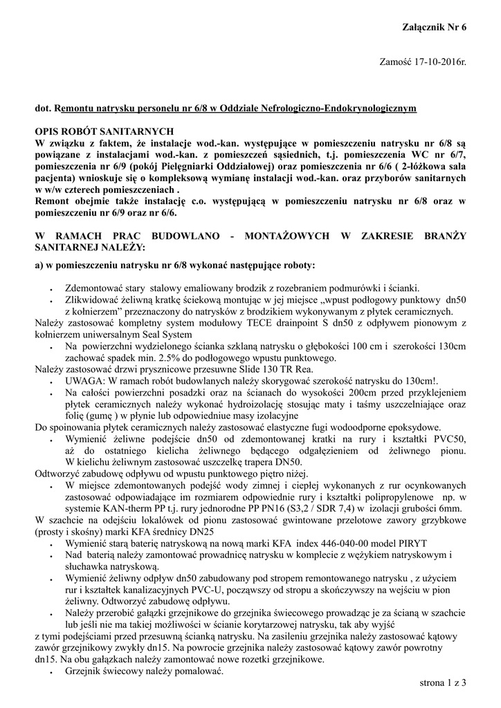 Załącznik Nr 6 Zamość 17-10-2016r. dot. Remontu natrysku personelu nr 6/8 w Oddziale Nefrologiczno-Endokrynologicznym OPIS ROBÓT SANITARNYCH W związku z faktem, że instalacje wod.-kan. występujące w pomieszczeniu natrysku nr 6/8 są powiązane z instalacjami wod.-kan. z pomieszczeń sąsiednich, t.j. pomieszczenia WC nr 6/7, pomieszczenia nr 6/9 (pokój Pielęgniarki Oddziałowej) oraz pomieszczenia nr 6/6 ( 2-łóżkowa sala pacjenta) wnioskuje się o kompleksową wymianę instalacji wod.-kan. oraz przyborów sanitarnych w w/w czterech pomieszczeniach . Remont obejmie także instalację c.o. występującą w pomieszczeniu natrysku nr 6/8 oraz w pomieszczeniu nr 6/9 oraz nr 6/6. W RAMACH PRAC BUDOWLANO SANITARNEJ NALEŻY: - MONTAŻOWYCH W ZAKRESIE BRANŻY a) w pomieszczeniu natrysku nr 6/8 wykonać następujące roboty: Zdemontować stary stalowy emaliowany brodzik z rozebraniem podmurówki i ścianki. Zlikwidować żeliwną kratkę ściekową montując w jej miejsce „wpust podłogowy punktowy dn50 z kołnierzem” przeznaczony do natrysków z brodzikiem wykonywanym z płytek ceramicznych. Należy zastosować kompletny system modułowy TECE drainpoint S dn50 z odpływem pionowym z kołnierzem uniwersalnym Seal System Na powierzchni wydzielonego ścianka szklaną natrysku o głębokości 100 cm i szerokości 130cm zachować spadek min. 2.5% do podłogowego wpustu punktowego. Należy zastosować drzwi prysznicowe przesuwne Slide 130 TR Rea. UWAGA: W ramach robót budowlanych należy skorygować szerokość natrysku do 130cm!. Na całości powierzchni posadzki oraz na ścianach do wysokości 200cm przed przyklejeniem płytek ceramicznych należy wykonać hydroizolację stosując maty i taśmy uszczelniające oraz folię (gumę ) w płynie lub odpowiedniue masy izolacyjne Do spoinowania płytek ceramicznych należy zastosować elastyczne fugi wodoodporne epoksydowe. Wymienić żeliwne podejście dn50 od zdemontowanej kratki na rury i kształtki PVC50, aż do ostatniego kielicha żeliwnego będącego odgałęzieniem od żeliwnego pionu. W kielichu żeliwnym zastosować uszczelkę trapera DN50. Odtworzyć zabudowę odpływu od wpustu punktowego piętro niżej. W miejsce zdemontowanych podejść wody zimnej i ciepłej wykonanych z rur ocynkowanych zastosować odpowiadające im rozmiarem odpowiednie rury i kształtki polipropylenowe np. w systemie KAN-therm PP t.j. rury jednorodne PP PN16 (S3,2 / SDR 7,4) w izolacji grubości 6mm. W szachcie na odejściu lokalówek od pionu zastosować gwintowane przelotowe zawory grzybkowe (prosty i skośny) marki KFA średnicy DN25 Wymienić starą baterię natryskową na nową marki KFA index 446-040-00 model PIRYT Nad baterią należy zamontować prowadnicę natrysku w komplecie z wężykiem natryskowym i słuchawka natryskową. Wymienić żeliwny odpływ dn50 zabudowany pod stropem remontowanego natrysku , z użyciem rur i kształtek kanalizacyjnych PVC-U, począwszy od stropu a skończywszy na wejściu w pion żeliwny. Odtworzyć zabudowę odpływu. Należy przerobić gałązki grzejnikowe do grzejnika świecowego prowadząc je za ścianą w szachcie lub jeśli nie ma takiej możliwości w ścianie korytarzowej natrysku, tak aby wyjść z tymi podejściami przed przesuwną ścianką natrysku. Na zasileniu grzejnika należy zastosować kątowy zawór grzejnikowy zwykły dn15. Na powrocie grzejnika należy zastosować kątowy zawór powrotny dn15. Na obu gałązkach należy zamontować nowe rozetki grzejnikowe. Grzejnik świecowy należy pomalować. strona 1 z 3 b) w pomieszczeniu WC nr 6/7 wykonać następujące roboty: Zdemontować starą umywalkę, baterię, zawór czerpalny, miskę ustępową wraz z dolnopłukiem, wężykiem i zaworkiem kątowym. Zdemontować żeliwne podejście kanalizacyjne dn100 do miski ustępowej. Zlikwidować i zdemontować starą żeliwną kratkę ściekową wraz z żeliwnym podejściem odpływowym dn50. Zlikwidować zawór czerpalny DN15. Wykonać nowe podejście DN100 dla kompaktu WC marki KOŁO model REKORD z odpływem pionowym, z rur i kształtek PVC-U110, włączając się do żeliwnego trójnika na pionie kanalizacyjnym. W kielichu żeliwnym zastosować uszczelkę trapera DN100. Zaślepić w sposób trwały ostatni kielich żeliwny po zlikwidowanym podejściu do żeliwnej kratki dn50. Odpływ DN100 od kompaktu WC zabudować na IV piętrze. Wykonać hydroizolację posadzki w miejscu naprawy po rozkuciach. Wymienić żeliwny odpływ kanalizacyjnY dn50 dla umywalki na PCV-U, wpinając go do pionu żeliwnego z użyciem uszczelki traperaDN50. Zastosować redukcję gumową 50/32 w podejściu odpływowym od umywalki W miejsce zdemontowanych podejść wody zimnej oraz ciepłej dla umywalki i sedesu wykonanych z rur ocynkowanych zastosować odpowiadające im rozmiarem odpowiednie rury i kształtki polipropylenowe np. w systemie KAN-therm PP t.j. rury jednorodne PP PN16 (S3,2 / SDR 7,4) w izolacji grubości 6mm. Zlikwidować żeliwny odpływ DN50 od kratki ściekowej oraz wymienić żeliwny odpływ DN100 od sedesu zabudowane pod stropem remontowanego pomieszczenia WC , z użyciem rur i kształtek kanalizacyjnych PVC-U, począwszy od stropu a skończywszy na wejściu w pion żeliwny. Odpływ DN100 odpowiednio umocować do stropu. Odtworzyć zabudowę odpływu. Żeliwną kratkę ściekową Dn50 w pomieszczeniu WC 7/7 (kondygnacja wyżej) zlikwidować poprzez jej częściowe podkucie i zalanie masą wodoszczelną. Na wierzchu posadzki należy uzupełnić brakująca terakotę. Wykonać montaż nowych przyborów sanitarnych, t.j. : umywalki model PRESIDENT szerokości 55cm bez otworu do montażu na kołki w komplecie z półpostumentem (kod produktu K08-12) z użyciem nowego syfonu umywalkowego, nowej baterii ściennej standardowej umywalkowej marki KFA indeks 440-840-00 model PIRYT , sedesu typu kompakt z odpływem pionowym marki KOŁO model REKORD z deską sedesową twardą, z nierdzewnymi zawiasami, z użyciem przyłącza WC1
