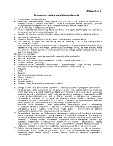 Załącznik nr 1 Szczegółowy opis przedmiotu zamówienia I. Przedmiotem zamówienia jest : Realizacja kompleksowych usług pralniczych (na sucho lub mokro w zależności od rodzaju bielizny i zaleceń producenta) wraz z leasingiem kołder, poduszek, pościeli oraz podkładów (załącznik nr 4 ) dla Wojewódzkiego Szpitala Chorób Płuc im . dr A. Pawelca w Wodzisławiu Śląskim Pranie i dezynfekcja bielizny szpitalnej zgodnie z wymaganą technologią oraz zgodnie z przepisami sanitarno-epidemiologicznymi szycie i cerowanie, wszycie zamków, uzupełnianie guzików, troków-naprawa bielizny Maglowanie, prasownie Transport bielizny czystej i brudnej- wraz z załadunkiem i wyładunkiem II. Ilość bielizny w ciągu roku wynosi łącznie ok. 9000 kg (750,00 kg miesięcznie) – 18.000 kg na 24 m-c Ilość bielizny ustalono w oparciu o dane statystyczne z lat poprzednich i obliczone są na podstawie wagi prania brudnego. Zamawiający zastrzega sobie, że ilość bielizny może ulec zmianie. Jednak zgodnie z umową rozliczanie za usługę będzie następować wg wagi asortymentu czystego. III. Asortyment bielizny: Bielizna pościelowa ( poszwy, poszewki, prześcieradła, podkłady) Bielizna zabiegowa Bielizna skażona(pościel cytostatyczna, pościel chorych zakażonych ) Odzież szpitalna ( pidżamy) Ochronna odzież personelu medycznego i pomocniczego (część odzieży ochronnej personelu medycznego przeznaczona jest do prania w temp. 40 st.C) Poduszki, Worki Ręczniki Ścierki, powłoczki na butle tlenowe Obrusy i serwety Koce, kołdry, Firanki, zasłony Żaluzje i inne asortymenty używane w szpitalu IV. Usługa winna być świadczona zgodnie z obowiązującymi wymogami sanitarnymi i higienicznymi, jakie nakładane są na proces prania (np. odzież ochronna musi być prana oddzielnie a pościel skażona poddana dezynfekcji) oraz technologią i warunkami obowiązującymi w placówkach służby zdrowia, zgodnie z przepisami rozporządzenia MZ z dnia 22.06.2005r.(DZ.U.Nr 116 z 2005r. poz.985 z późniejszymi zmianami).. Zamawiający wymaga, by używane do realizacji usługi środki i preparaty były stosowane zgodnie z zaleceniami PZH i IMiDz, a ponadto by gwarantowały właściwą jakość prania bez powodowania przyspieszonego zużycia bielizny Poduszki, koce, materace i inne asortymenty wymagające prania i dezynfekcji w niższym zakresie temperatur , zgodnie z zaleceniami producenta zapobiegającymi uszkodzeniu przez wysoką temperaturę będą prane i dezynfekowane zgodnie z zaleceniami producenta i obowiązującymi wymogami. V. Zamawiający wymaga by Wykonawca dysponował oddzielnymi środkami transportu samochodowego na brudną i czystą bieliznę lub środkami transportu posiadającymi szczelną i podzielną komorę załadunkową tak, aby bielizna czysta nie miała możliwości kontaktu z bielizną brudną. Przestrzeń ładunkowa środka transportu powinna być wyłożona materiałem nienasiąkliwym możliwym do mycia i dezynfekcji Pojazd wyposażony w środki do dezynfekcji rąk i powierzchni. Bielizna transportowana w wózkach , koszach wykonanych z materiału nadającego się do mycia i dezynfekcji. VI. Odbiór bielizny brudnej i dostawy czystej odbywać się będzie trzy dni w tygodniu : poniedziałek, środa, piątek w godzinach 7.00 – 12.00 .w okresie kumulacji dni wolnych dodatkowy odbiór brudnej bielizny i dostawa bielizny czystej po odrębnym uzgodnieniu z Zamawiającym, Szczegółowe godziny będą uzgadnianie z przedstawicielem Zamawiającego. Punktem „przyjęć” i „wydania” będą wyznaczone pomieszczenia w budynku głównym szpitala – magazyn bielizny czystej i magazyn bielizny brudnej. Wydanie brudnej bielizny oraz przyjęcie czystej bielizny będzie się odbywało na podstawie protokołu zdawczo / odbiorczego wydanego przez Zamawiającego w obecności przedstawiciela Wykonawcy. VII. Bielizna przekazana do prania w wyznaczony dzień dostarczona zostaje do Zamawiającego w kolejny dzień dostawy. W przypadku odzieży ochronnej pracowników Zamawiający wymaga aby dostawa nastąpiła do 7 dni od dnia odbioru VIII. Bielizna szpitalna jest oznakowana z podziałem na poszczególne komórki organizacyjne, w wypadku wprowadzania nowych asortymentów będą sukcesywnie znakowane przez Zamawiającego. W przypadku utraty czytelności znakowanie zostanie powtórzone. Pościel szpitalna na dzień dzisiejszy ogólnie jest koloru białego, częściowo jest w kolorach pastelowych.. Oddziały szpitalne posiadają pościel (poszwy, poszewki, prześcieradła) z trwałymi nadrukami identyfikującymi szpital, IX. Sposób pakowania bielizny: Bielizna brudna pakowna jest do dwóch worków – foliowego i płóciennego, worki foliowe winny być samorozpakowujące się. Worki foliowe i płócienne, dostarcza Wykonawca. Obowiązkiem wykonawcy będzie zabezpieczenie szpitala w jednorazowe worki rozpuszczalne w procesie prania- z przeznaczeniem na bieliznę skażoną i zawszoną. Asortymenty inne np. koce, poduszki, firany, prane w temperaturze niższej nic 40 º C będą pakowane do worków foliowych z opisem „asortymenty inne”, pościel skażona – oznaczona „bielizna skażona” X. Bielizna czysta – pakowana w worki foliowe i płócienne, z podziałem na poszczególne komórki organizacyjne. Odzież ochrona personelu (ubrania lekarskie, fartuchy medyczne, garsonki, itp. ) winny być dostarczone na wieszakach zafoliowanych jednorazowych. XI. Zamawiający zastrzega sobie możliwość kontroli procesu prania raz na kwartał u Wykonawcy oraz kontroli mikrobiologicznej – pobranie wymazów z bielizny na koszt Wykonawcy. XII. Odbiór brudnej bielizny odbywać się będzie z magazynu brudnej bielizny w budynku gospodarczym szpitala po jej zważeniu przez pracownika wykonawcy w obecności osób odpowiedzialnych z ramienia szpitala XIII. Wykonawca zobowiązany jest do : 1. Dokonania wszelkich napraw krawieckich w zakresie cerowania, uzupełniania zapięć w fartuchach, bluzach