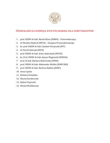 ODWOŁAWCZA KOMISJA DYSCYPLINARNA DLA DOKTORANTÓW 1. prof. UKSW dr hab. Marek Kloss (WBNS) – Przewodniczący 2. dr Monika Gładoch (WPiA) – Zastępca Przewodniczącego 3. ks. prof. UKSW dr hab. Czesław Parzyszek (WT) 4. dr Paweł Sobczyk (WPK) 5. prof. UKSW dr hab. Artur Andrzejuk (WFCH) 6. ks. Prof. UKSW dr hab. Janusz Węgrzecki (WNHiS) 7. prof. dr hab. Barbara Bobrowska (WNH) 8. prof. UKSW dr hab. Aleksander Wittlin (WMP.SNS) 9. prof. UKSW dr hab. Barbara Kałdon (WNP) 10. Anna Lipska 11. Barbara Świtalska 12. Maciej Sierakowski 13. Robert Paprocki 14. Michał Wróblewski