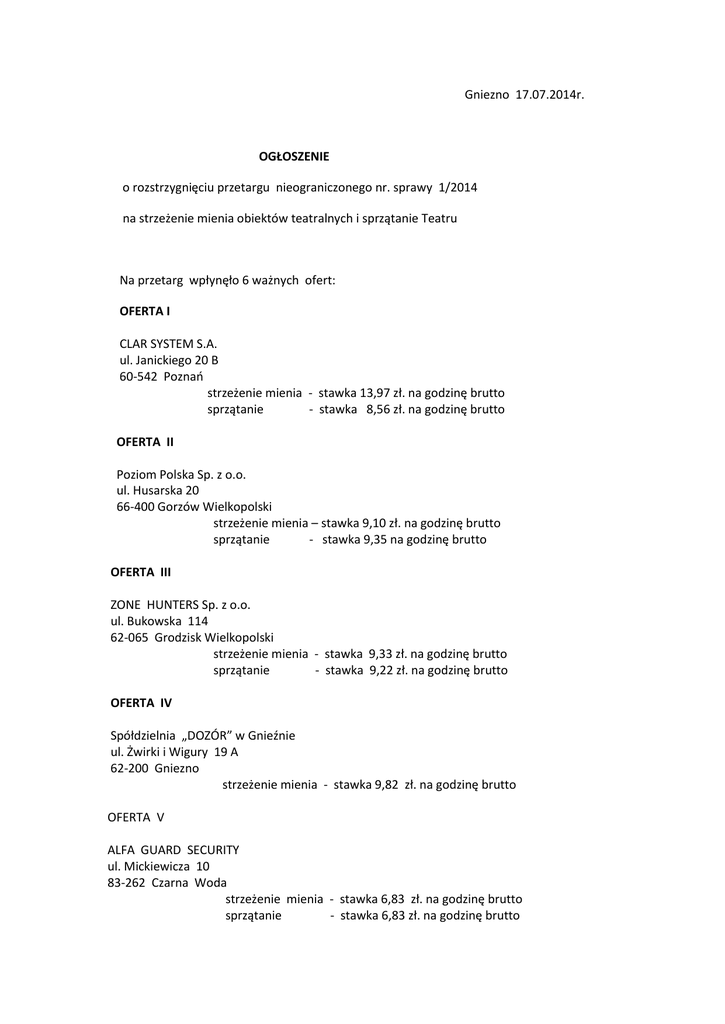 Gniezno 17.07.2014r. OGŁOSZENIE o rozstrzygnięciu przetargu nieograniczonego nr. sprawy 1/2014 na strzeżenie mienia obiektów teatralnych i sprzątanie Teatru Na przetarg wpłynęło 6 ważnych ofert: OFERTA I CLAR SYSTEM S.A. ul. Janickiego 20 B 60-542 Poznań strzeżenie mienia - stawka 13,97 zł. na godzinę brutto sprzątanie - stawka 8,56 zł. na godzinę brutto OFERTA II Poziom Polska Sp. z o.o. ul. Husarska 20 66-400 Gorzów Wielkopolski strzeżenie mienia – stawka 9,10 zł. na godzinę brutto sprzątanie - stawka 9,35 na godzinę brutto OFERTA III ZONE HUNTERS Sp. z o.o. ul. Bukowska 114 62-065 Grodzisk Wielkopolski strzeżenie mienia - stawka 9,33 zł. na godzinę brutto sprzątanie - stawka 9,22 zł. na godzinę brutto OFERTA IV Spółdzielnia „DOZÓR” w Gnieźnie ul. Żwirki i Wigury 19 A 62-200 Gniezno strzeżenie mienia - stawka 9,82 zł. na godzinę brutto OFERTA V ALFA GUARD SECURITY ul. Mickiewicza 10 83-262 Czarna Woda strzeżenie mienia - stawka 6,83 zł. na godzinę brutto sprzątanie - stawka 6,83 zł. na godzinę brutto OFERTA VI PH „ANN-JUST” Anna Karpińska ul. Głęboka 5 A 62-200 Gniezno sprzątanie - stawka 5,90 zł. na godzinę Z porównania cen roboczo-godzin wynika , że przetarg na strzeżenie mienia obiektów wygrała firma /Oferta nr. V/ ALFA GUARD SECURITY ul. Mickiewicz 10 ,83-262 Czarna Woda , ze stawką 6,63 zł . za roboczo-godzinę Na sprzątanie Teatru przetarg wygrała firma / Oferta nr. VI/ PH „ANN-JUST” Anna Karpińska ul. Głęboka 5 A , 62-200 Gniezno , ze stawką 5,90, zł. za roboczo –godzinę brutto / w przetargu dopuszczono składanie ofert częściowych / Zatwierdzam : Dyrektor Joanna Nowak