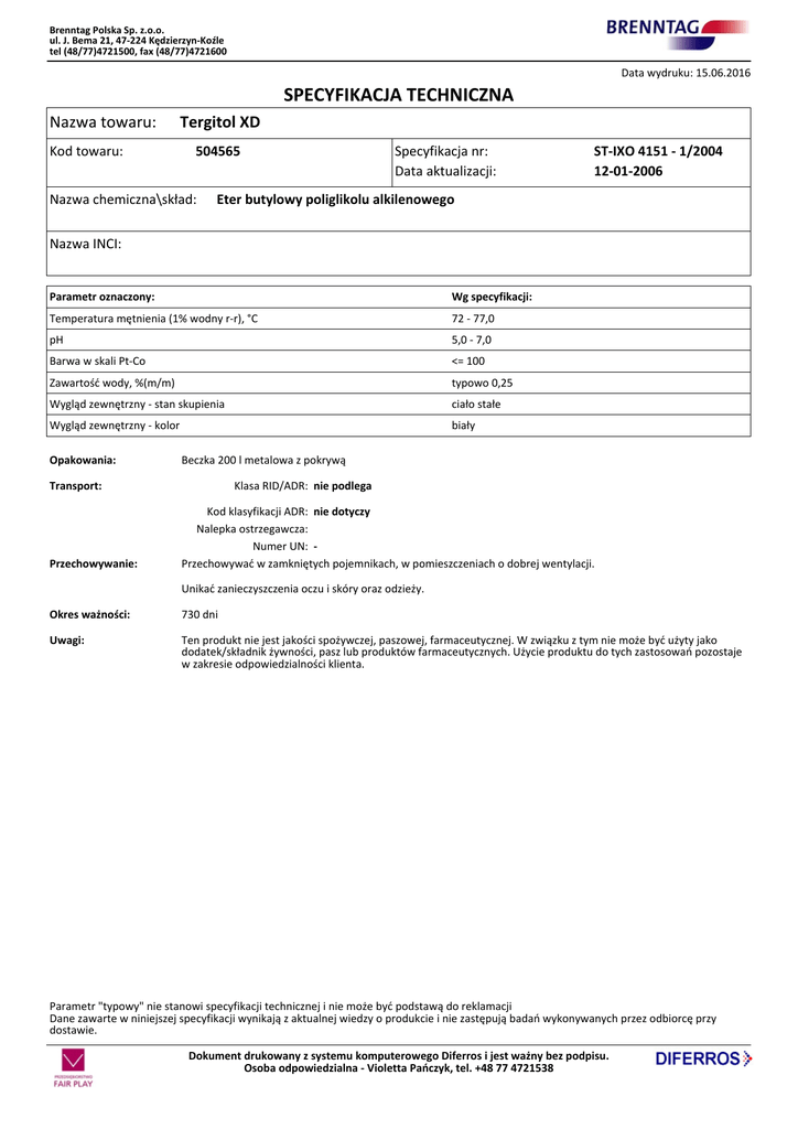 Brenntag Polska Sp. z.o.o. ul. J. Bema 21, 47-224 Kędzierzyn-Koźle tel (48/77)4721500, fax (48/77)4721600 Data wydruku: 15.06.2016 SPECYFIKACJA TECHNICZNA Nazwa towaru: Kod towaru: Tergitol XD 504565 Nazwa chemiczna\skład: Specyfikacja nr: Data aktualizacji: ST-IXO 4151 - 1/2004 12-01-2006 Eter butylowy poliglikolu alkilenowego Nazwa INCI: Parametr oznaczony: Wg specyfikacji: Temperatura mętnienia (1% wodny r-r), °C 72 - 77,0 pH 5,0 - 7,0 Barwa w skali Pt-Co <= 100 Zawartość wody, %(m/m) typowo 0,25 Wygląd zewnętrzny - stan skupienia ciało stałe Wygląd zewnętrzny - kolor biały Opakowania: Beczka 200 l metalowa z pokrywą Transport: Przechowywanie: Klasa RID/ADR: nie podlega Kod klasyfikacji ADR: nie dotyczy Nalepka ostrzegawcza: Numer UN: Przechowywać w zamkniętych pojemnikach, w pomieszczeniach o dobrej wentylacji. Unikać zanieczyszczenia oczu i skóry oraz odzieży. Okres ważności: 730 dni Uwagi: Ten produkt nie jest jakości spożywczej, paszowej, farmaceutycznej. W związku z tym nie może być użyty jako dodatek/składnik żywności, pasz lub produktów farmaceutycznych. Użycie produktu do tych zastosowań pozostaje w zakresie odpowiedzialności klienta. Parametr "typowy" nie stanowi specyfikacji technicznej i nie może być podstawą do reklamacji Dane zawarte w niniejszej specyfikacji wynikają z aktualnej wiedzy o produkcie i nie zastępują badań wykonywanych przez odbiorcę przy dostawie. Dokument drukowany z systemu komputerowego Diferros i jest ważny bez podpisu. Osoba odpowiedzialna - Violetta Pańczyk, tel. +48 77 4721538