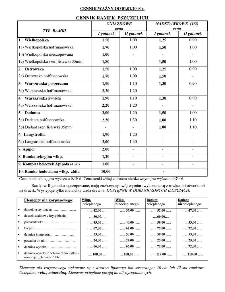 CENNIK WAŻNY OD 01.01.2008 r. CENNIK RAMEK PSZCZELICH GNIAZDOWE cena I gatunek II gatunek TYP RAMKI NADSTAWKOWE (1/2) cena I gatunek II gatunek 1. Wielkopolska 1,50 1,00 1,25 0,90 1a) Wielkopolska hoffmanowska 1,70 1,00 1,50 1,00 1b) Wielkopolska nieczopowana 1,00 - - - 1c) Wielkopolska szer. listewki 35mm 1,80 - 1,50 1,00 2. Ostrowska 1,50 1,00 1,25 0,90 2a) Ostrowska hoffmanowska 1,70 1,00 1,50 - 3. Warszawska poszerzana 1,90 1,10 1,30 0,90 3a) Warszawska hoffmanowska 2,20 1,20 - - 4. Warszawska zwykła 1,90 1,10 1,30 0,90 4a) Warszawska hoffmanowska 2,20 1,20 - - 5. Dadanta 2,00 1,20 1,50 1,00 5a) Dadanta hoffmanowska 2,30 1,30 1,80 1,10 - - 1,80 1,10 6. Langstrotha 1,90 1,20 - - 6a) Langstrotha hoffmanowska 2,00 1,30 - - 7. Apipol 2,00 - - - 8. Ramka sekcyjna wlkp. 1,20 - - - 9. Komplet beleczek Apipola (4 szt) 1,00 - - - 10. Ramka hodowlana wlkp. zbita 10,00 5b) Dadant szer. listewki 35mm - Cena ramki zbitej jest wyższa o 0,40 zł. Cena ramki zbitej z drutem nierdzewnym jest wyższa o 0,70 zł. Ramki w II gatunku są czopowane, mają zachowany swój wymiar, wykonane są z rowkami i otworkami na drucik. Występuje tylko niewielka wada drewna. DOSTĘPNE W OGRANICZONYCH ILOŚCIACH. Elementy ula korpusowego: • daszek kryty blachą ………………... • daszek szaletowy kryty blachą • Wlkp. Wlkp. Dadant Dadant ocieplanego nieocieplanego ocieplanego nieocieplanego ….. 42,00 ….. ….. 37,00 ….. ….. 52,00 ….. ….. 47,00 ….. ….50,00…. - ….60,00…. - półnadstawka ………………………. ….. 45,00 ….. ….. 40,00 ….. ….. 58,00 ….. ….. 53,00 ….. • korpus ………………………………. ….. 67,00 ….. ….. 62,00 ….. ….. 77,00 ….. ….. 72,00 ….. • dennica kompletna ………………… ….. 53,00 ….. ….. 50,00 ….. ….. 58,00 ….. ….. 55,00 ….. • powałka do ula ……………………... ….. 24,00 ….. ….. 24,00 ….. ….. 25,00 ….. ….. 25,00 ….. • dennica wysoka ……………………. ….. 66,00 ….. ….. 66,00 ….. ….. 72,00 ….. ….. 72,00 ….. • dennica wysoka z poławiaczem pyłku – nowy typ „Dennica 2006” .... 108,00 …. ... 108,00 ….. ….. 119,00 ….. ….. 119,00 ….. Elementy ula korpusowego wykonane są z drewna lipowego lub sosnowego; 10-cio lub 12-sto ramkowe. Ocieplane wełną mineralną. Elementy ocieplane pasują do uli styropianowych. CENNIK POZOSTAŁEGO SPRZĘTU PSZCZELARSKIEGO Sprzęt pszczelarski Lp. Cena zł 1. Czas palenia 1 szt. ok. 8 godz. Ekologiczne paliwo do podkurzacza z dodatkiem ziół (np.: melisa, mięta) 2. 3. 4. 1,00 Wióry lipowe z dodatkiem ziół sprasowane pod ciśnieniem 200 kg/cm2 Rojnica: • wielkopolska ……………………………... 73,00 • dadant ……………………………………. 84,00 • warszawska poszerz. / warsz. zwykła … 84,00 Wykonana ze sklejki wodoodpornej. Z jednej strony znajduje się siatka wentylacyjna, z drugiej strony umieszczona jest część kraty przegrodowej – do przesiania matki. Pojemność: Podkarmiaczka ramkowa: • ostrowska ………………………………… 15,00 Ok. 1,8 L Podkarmiaczki wykonane są • wielkopolska …… ………………………. 16,00 Ok. 2,5 L ze sklejki wodoodpornej, zszywane, • wielkopolska cienka (25 mm)………………….. 15,00 Ok. 2,0 L • warszawska poszerzana ………………….. 20,00 Ok. 2,5 L klejone klejem wodoodpornym • warszawska zwykła ……………………… 18,00 Ok. 2,1 L i ekologicznym. • dadanta …………………….………………… 20,00 Ok. 2,5 L • dadanta cienka (25 mm)..………………………… 16,00 Ok. 1,5 L 7,00 9,00 Wykonana ze sklejki wodoodpornej o gr. 8mm - 10mm Deska przegrodowa: • • 5. Opis wielkopolska, ostrowska ……………….. warszawska, dadant ……………………. Beleczki odstępnikowe z drewna : • • wielkopolskie, dadanta…………………. warszawskie poszerzane i zwykłe……… Wykonane z drewna lipowego lub sosnowego. 0,24 0,20 Wymiar beleczek to: 10mm x 10mm oraz 8mm x 10mm, 10mm x 12mm lub 12mm x 12mm. 6. Przedwlotkowy poławiacz pyłku 55,00 Pasuje do każdego rodzaju ula 7. Podkarmiaczka powałkowa wlkp. 30,00 Bez szybki 8. Poidełko butelkowe 5,00 Wykonane z drewna. 9. Klateczki dla matek pszczelich 3,00 10. Podpałka do rozpalania paliwka 1,00 Nasączona parafiną 11. Łyżeczki do miodu 3,00 Drewniane 12. Drewniana; stosuję się zamiast kraty odgrodowej lub do Beleczka odgrodowa wlkp. (krata przegrodowa) 1,00 13. Stojak pod ul 15,00 Drewniany; posiada cztery nóżki 14. Stojak krzyżakowy pod ul – składany 18,00 Drewniany, posiada cztery nóżki, składany. 15. Topiarka słoneczna 290,00 Drewniana, na 2 ramki każdego rodzaju. 16. Zatworek do zmniejszenia wylotka 3,00 Drewniany; posiada dwa rodzaje wycięć. 17. Mostek (lotnisko) pod wylotek 3,00 Drewniany; do każdego rodzaju ula 18. Izolator 1-ramkowy • • 19. propolisu. 28,00 32,00 Drewniany, otwierany; z siatką metalową; na ramkę gniazdową, prostą. Izolator 1-ramkowy hoff • • 20. wielkopolski, ostrowskiej ……………….. dadanta, warszawski …………………….. poprawienia wentylacji w ulu oraz do pozyskiwania wielkopolski, ostrowskiej ……………….. dadanta, warszawski ……………………. 30,00 35,00 Drewniany, z kratą winidurową na ramkę gniazdową hoffmanowską. Rojołapka: • • duża…………………………………. mała…………………………………. 45,00 35,00 Drewniana z kratą metalową, pasująca do każdego rodzaju ula. CENNIK ULI DREWNIANYCH Rodzaj i opis ula Ule WIELKOPOLSKIE Ul wielkopolski ocieplany wielokorpusowy [ 2 korpusy + półnadstawka (½)] Cena w zł / szt z kompletem ramek 290,- Ul wielkopolski nieocieplany wielokorpusowy [ 2 korpusy + półnadstawka (½)] 250,- Ul wielkopolski leżakowy 16-18 ramkowy z ½ 270,- Ul wielkopolski leżakowy 16-18 ramkowy bez ½ 240,- Ul wielkopolski leżakowy 16-18 ramkow